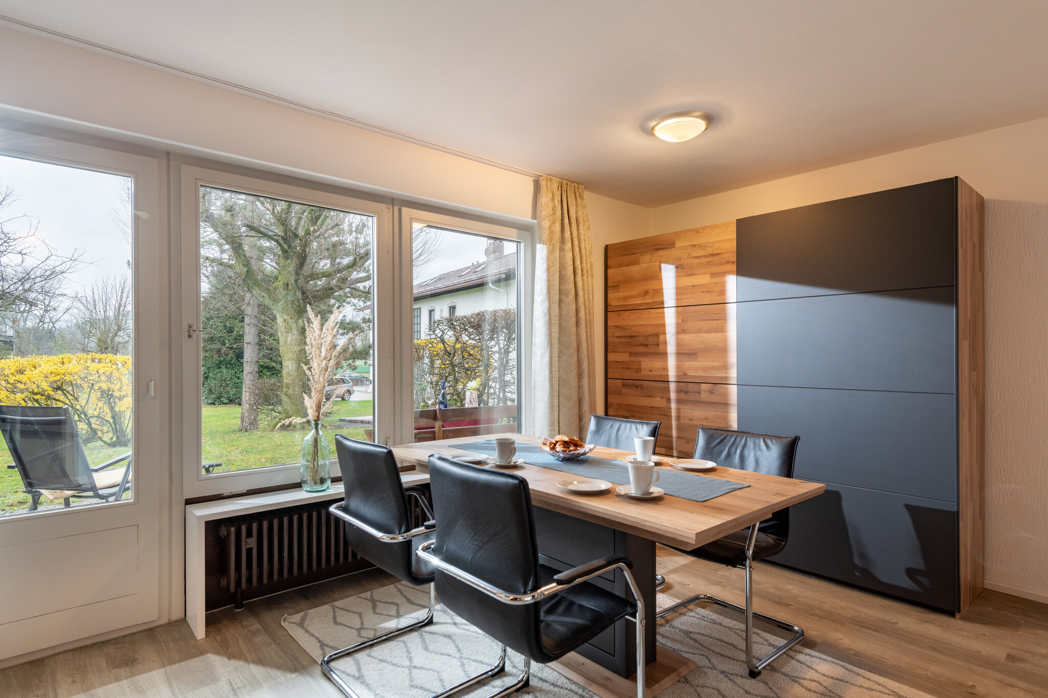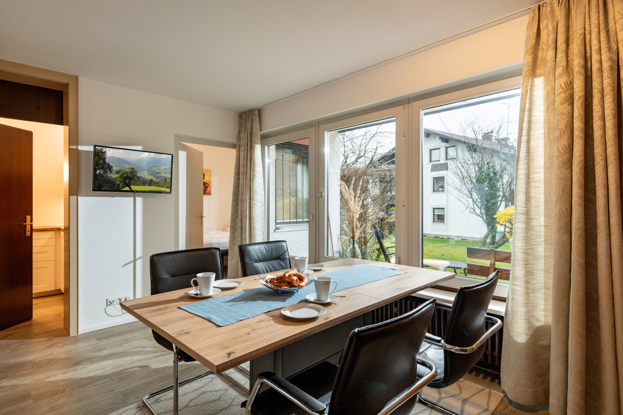 Wohnzimmer mit Flachbild-Fernseher und gemütlicher Essecke