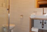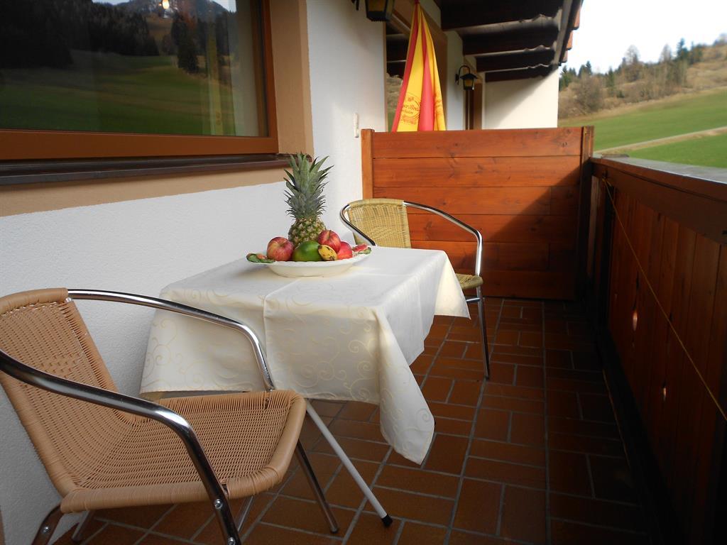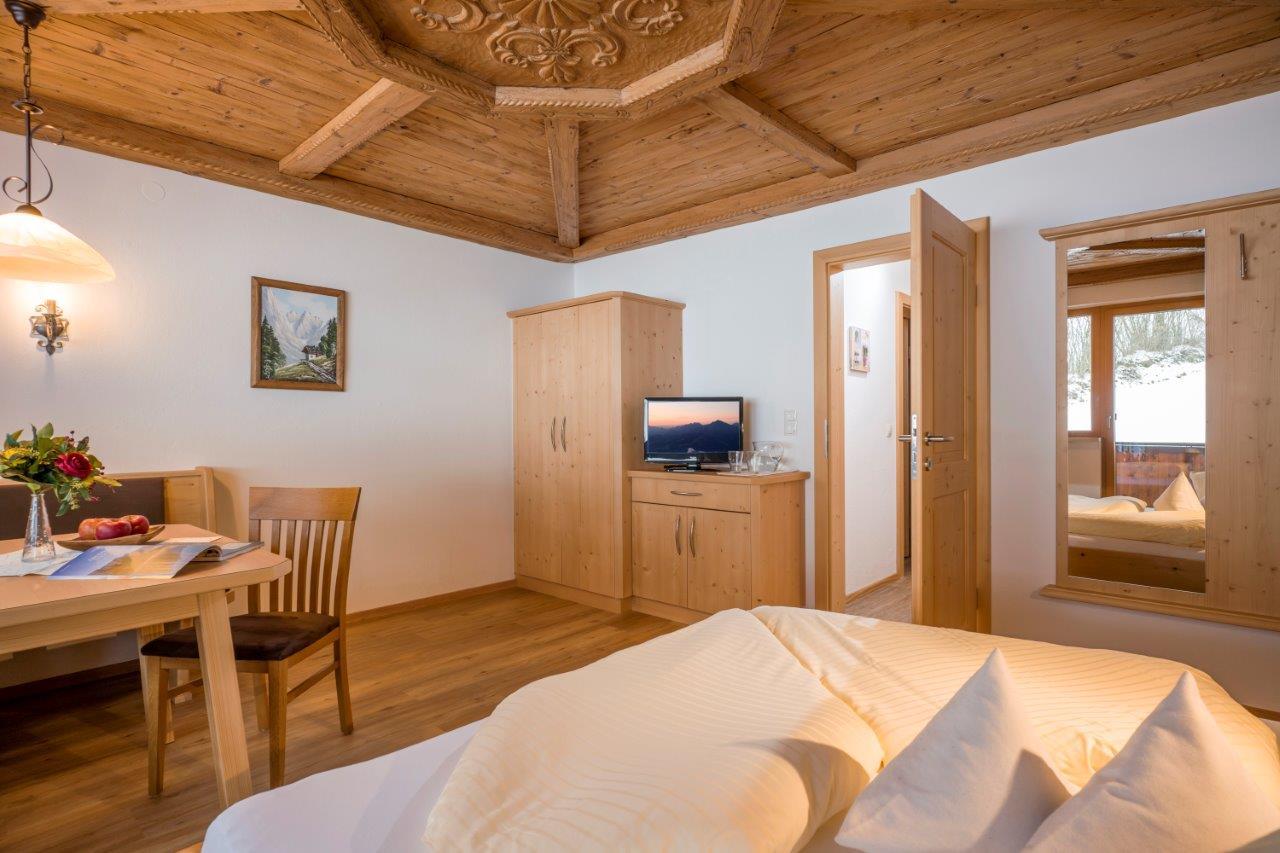 Wohn-Schlafzimmer mit Doppelbett, Hocker, Essecke, Schrank, SAT-TV und Bettwäsche, abgeschlossene Küche mit E-Herd und Backrohr, Kühlschrank, Geschirr, Geschirrtücher, Bad mit Wellnessdusche, WC, Bade- und Handtücher, Gang mit Garderobe, Balkon