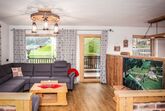 ... offenes Wohnzimmer mit Flat-TV und gemütlicher Couch,