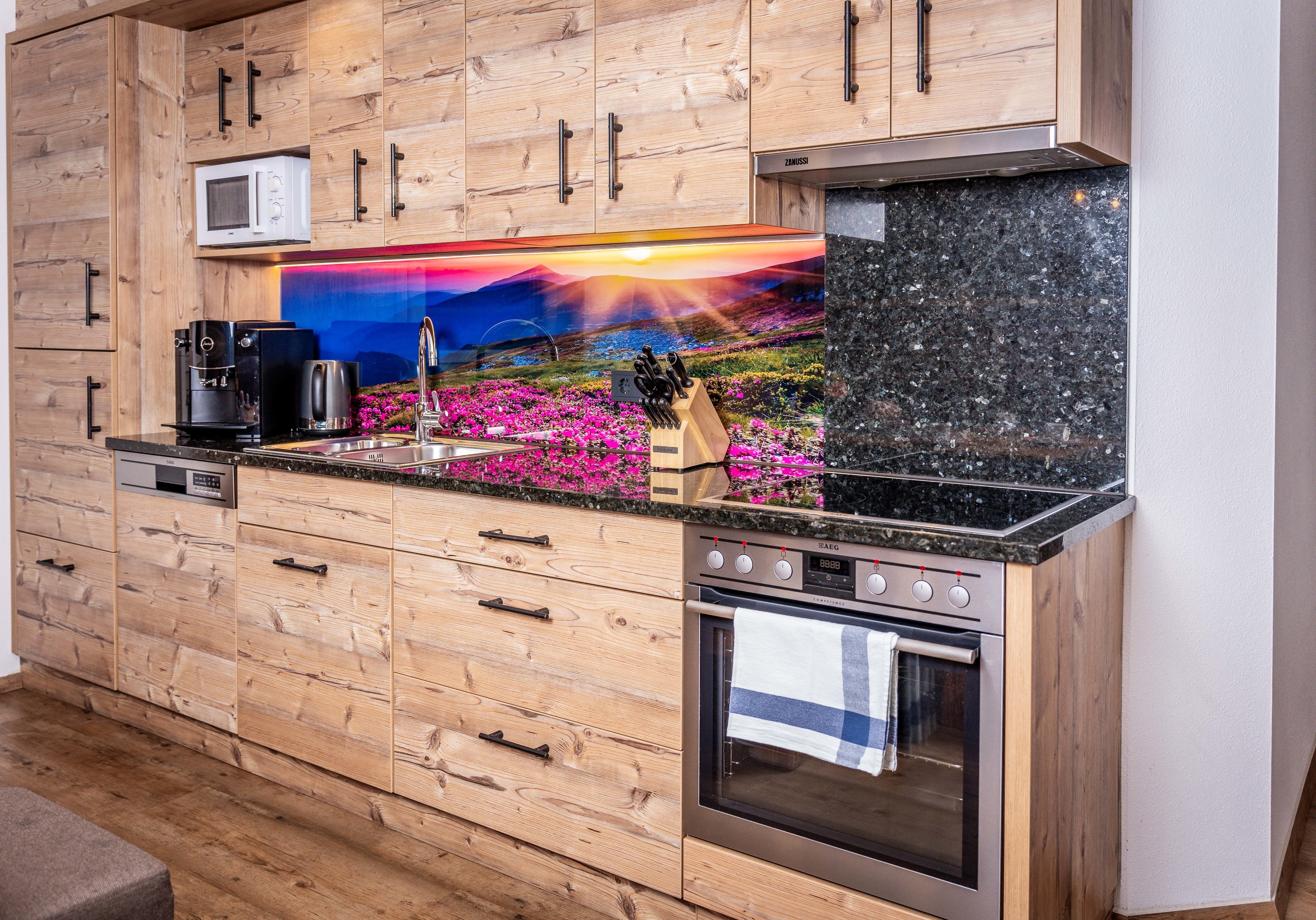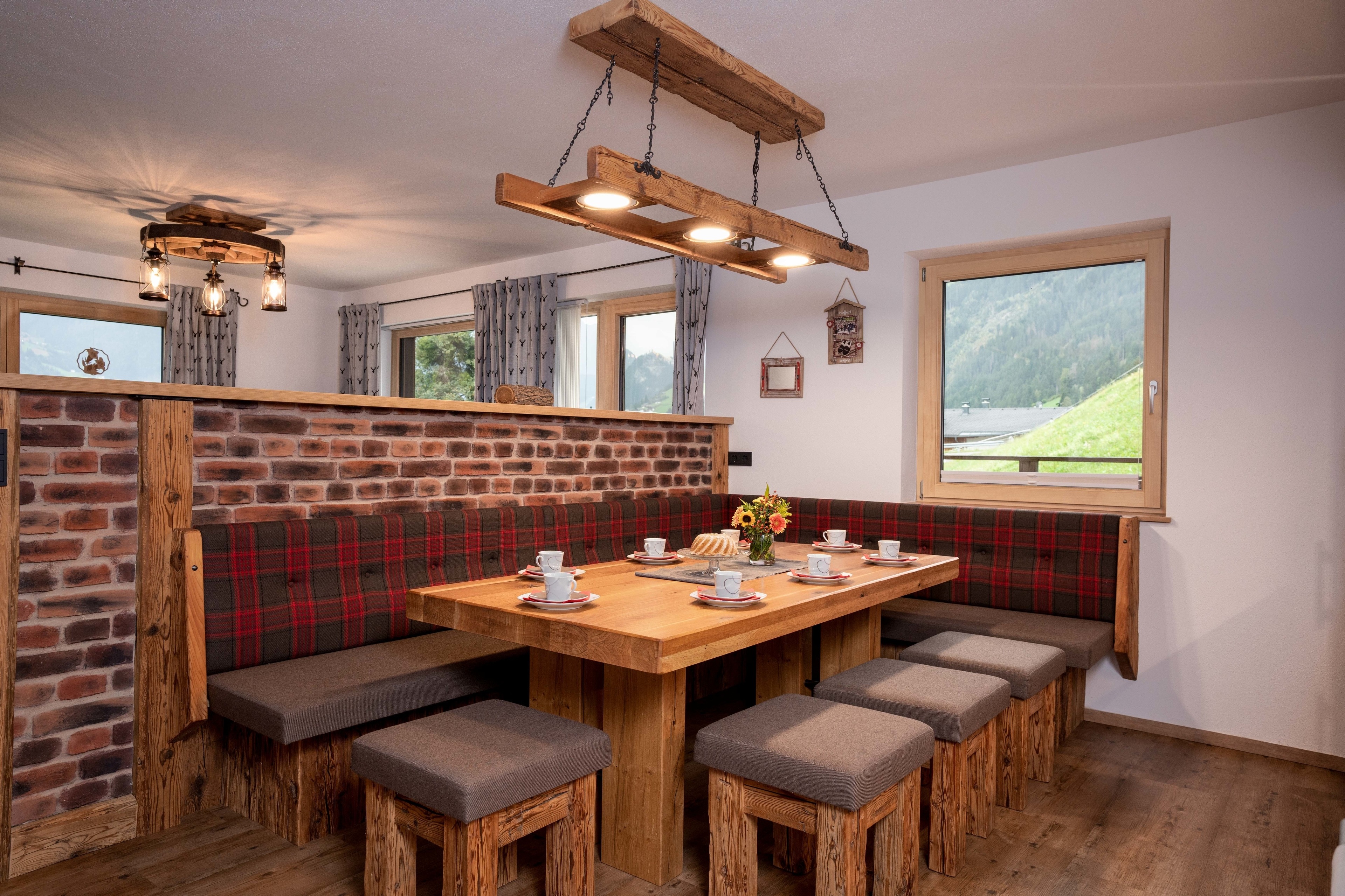 ... einem im Tiroler Stil eingerichteten Essbereich mit voll ausgestatteter Küche