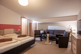 Das moderne Premium-Studioappartement im Dachgeschoss verfügt über einen großzügigen kombinierten Wohn-/Schlafraum, Dusche/WC, Balkon, Küchenbereich, Esstisch, Smart-TV und Glasfaserinternet. Doppelbett und Doppelschlafcouch bieten Übernachtungsmöglichkeit für 2 bis maximal 4 Personen. Der Küchenbereich ist mit Kühlschrank, Mikrowelle/Grill, Cerankochfeld, Senseo Pad-Kaffeemaschine, Essgeschirr und Küchenutensilien ausgestattet. Bettwäsche und Handtücher werden gestellt. Nichtraucherappartement.