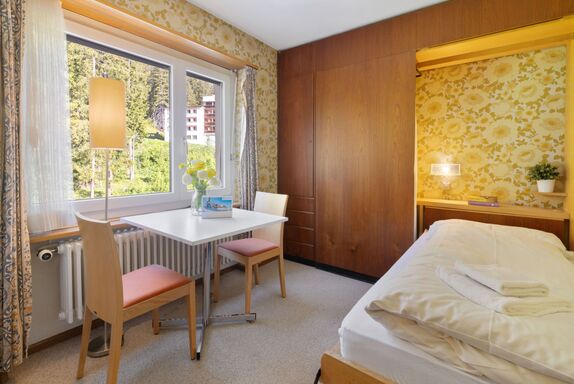 1-Zimmer-Wohnung 16 m2 im 4. Stock. Einfach und zweckmässig eingerichtet: 1 Zimmer mit 2 Wandschrankbetten, TV-Anschluss und Radio. Dusche/WC. Zur Verfügung: Internet (WLAN, gratis). Rückwärtige Lage, ohne Kochgelegenheit.