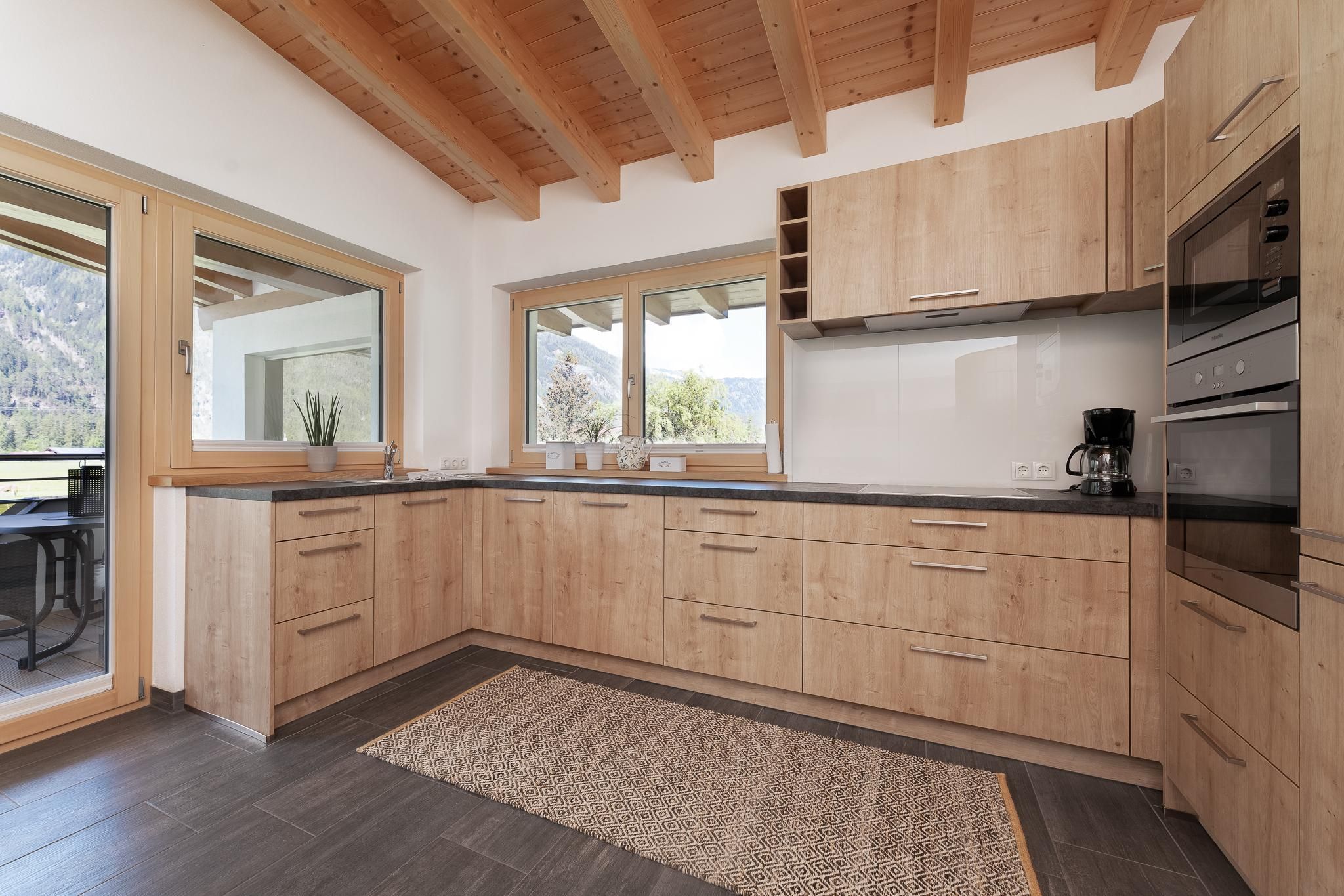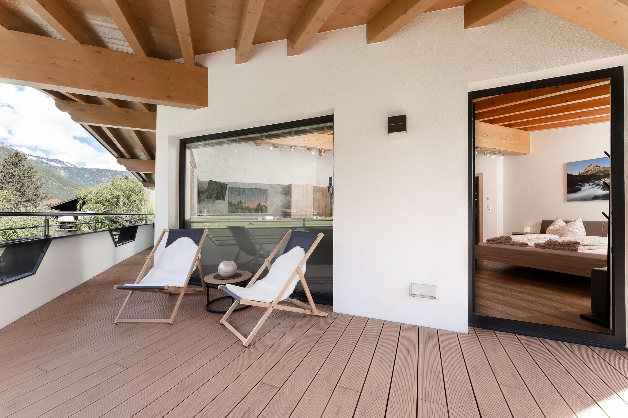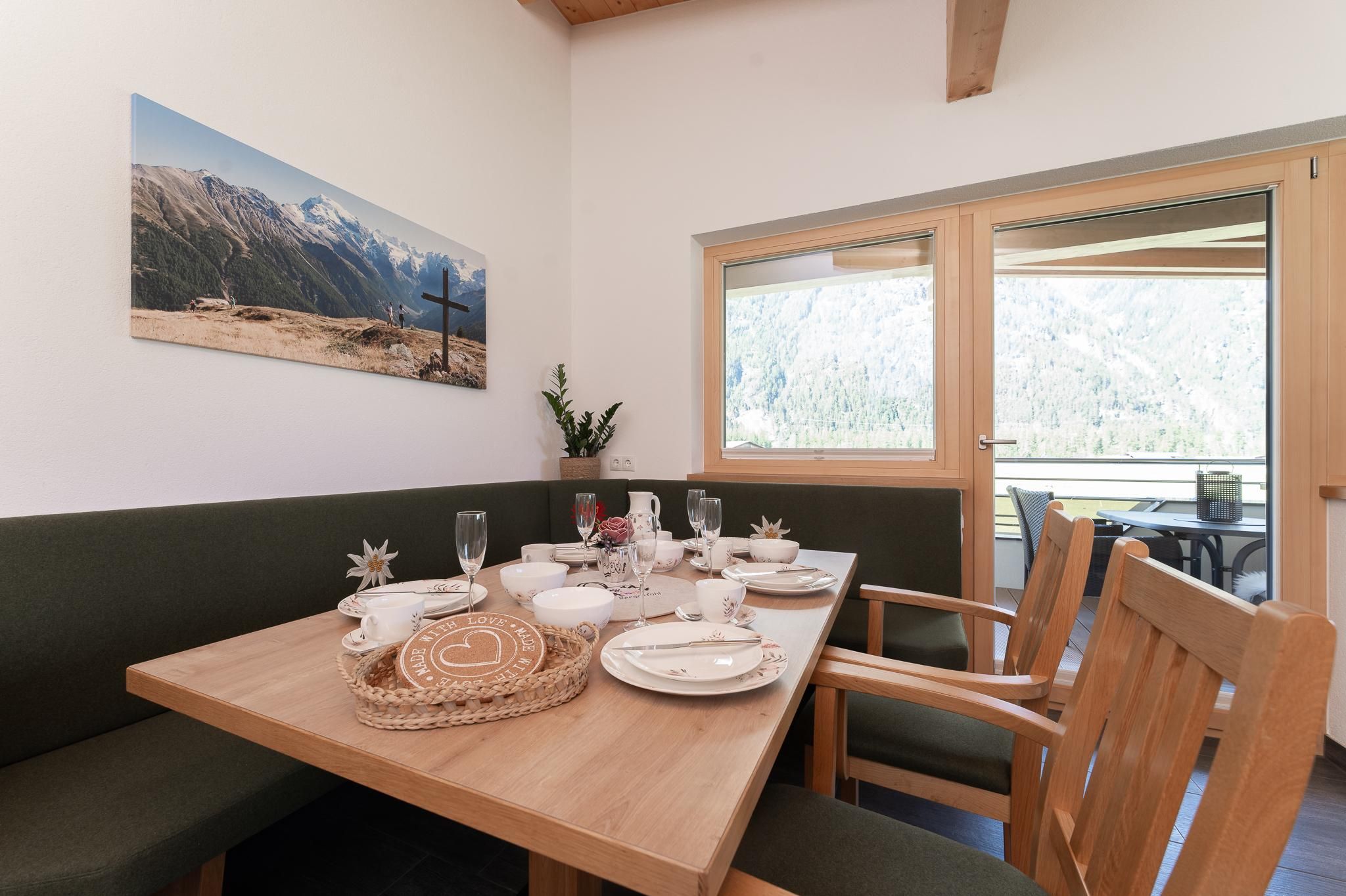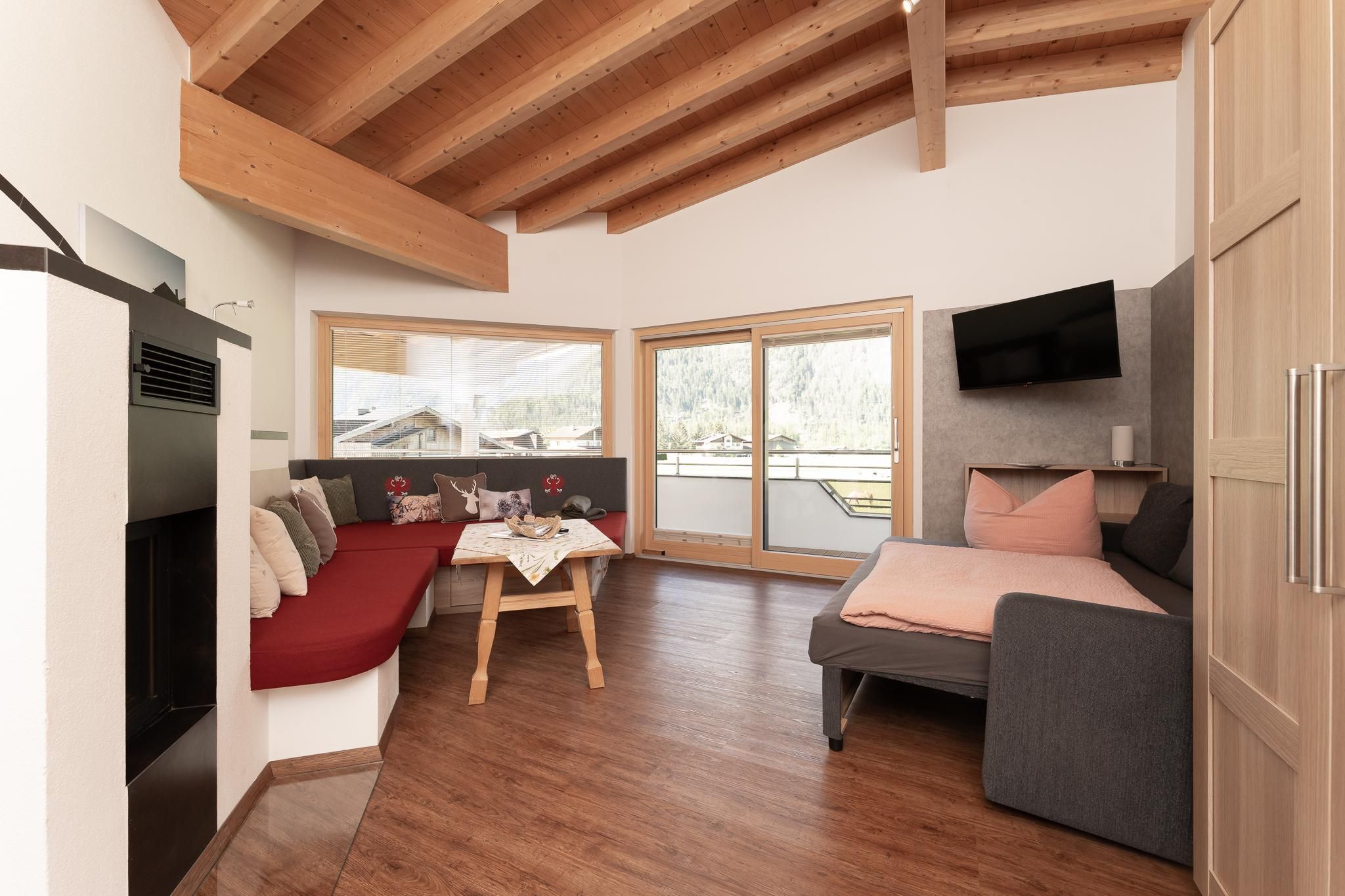 Das Apart Berggefühl (ca. 83 m²) verfügt über ein Doppelzimmer, ein Einzelzimmer, ein Badezimmer mit Eck-Badewanne, Dusche und WC, einem lichtdurchfluteten Wohnzimmer mit gemütlichem Kachelofen - dieser kann auf Wunsch vom Vermieter beheizt werden und einer großen, vollausgestattenen Küche (Induktionskochfeld, Kühlschrank/Gefrierschrank, Mikrowelle, Backrohr, Geschirrspüler, Wasserkocher, Eierkocher, Kapsel und Filter Kaffeemaschine, Toaster uvm.). Alle Räume - außer dem Einzelzimmer und dem Badezimmer - verfügen über einen direkten Zugang auf die große, möblierte Rundum-Terrasse. Genießen Sie einen einzigartigen Blick auf das Bergpanorama. Durch die hohen Räume und dem Holz-Sicht-Dachstuhl fühlt man sich den Bergen noch näher. Außerhalb der Einheit - auf der gleichen Etage befindet sich das Einzelzimmer mit Waschmöglichkeit und WC.