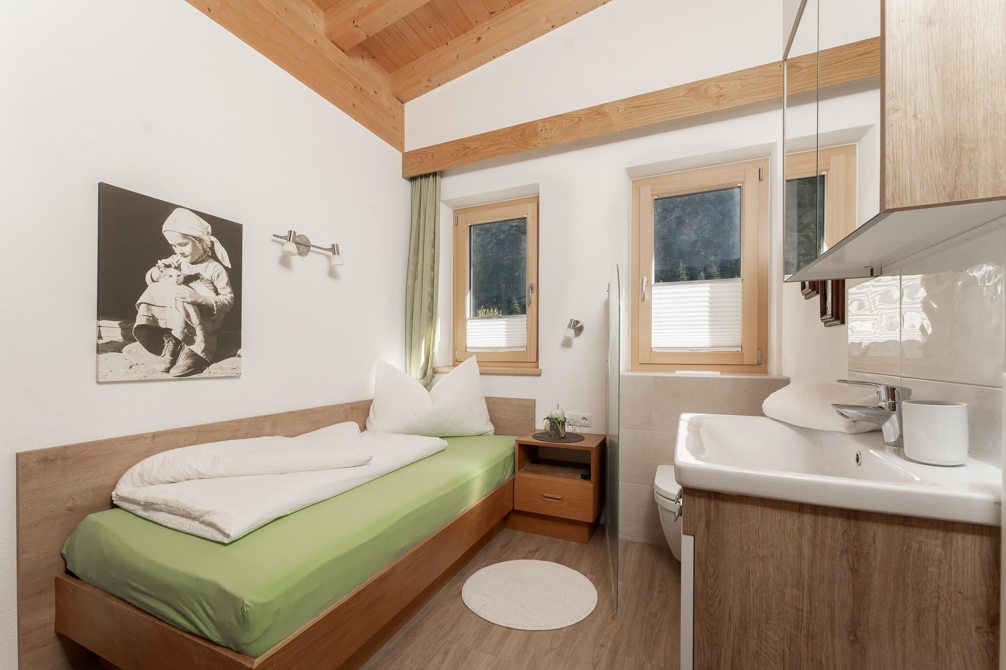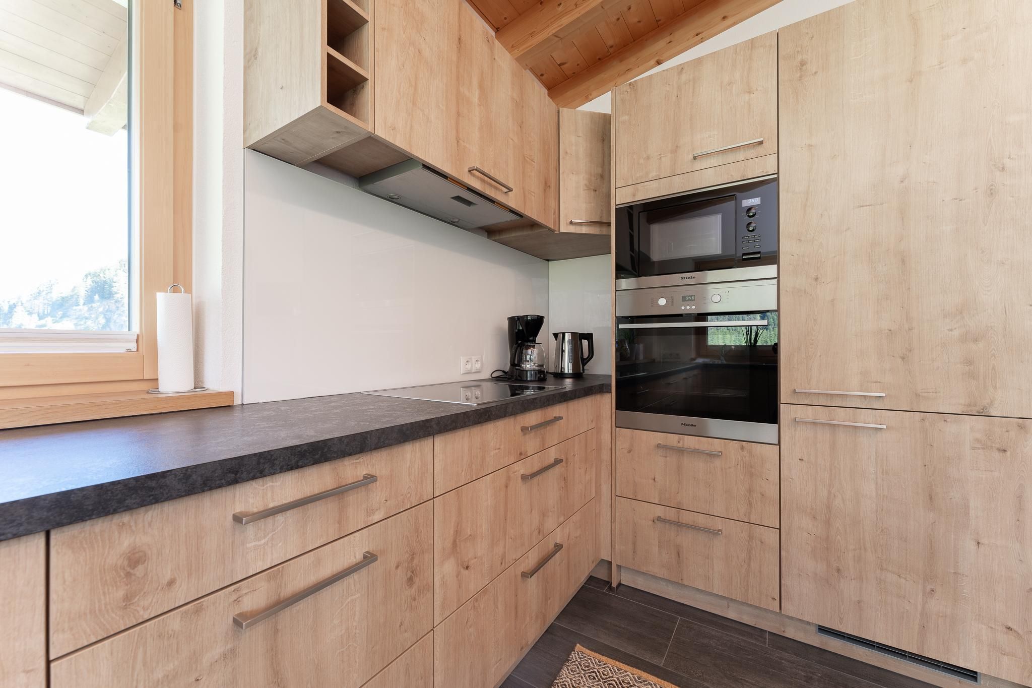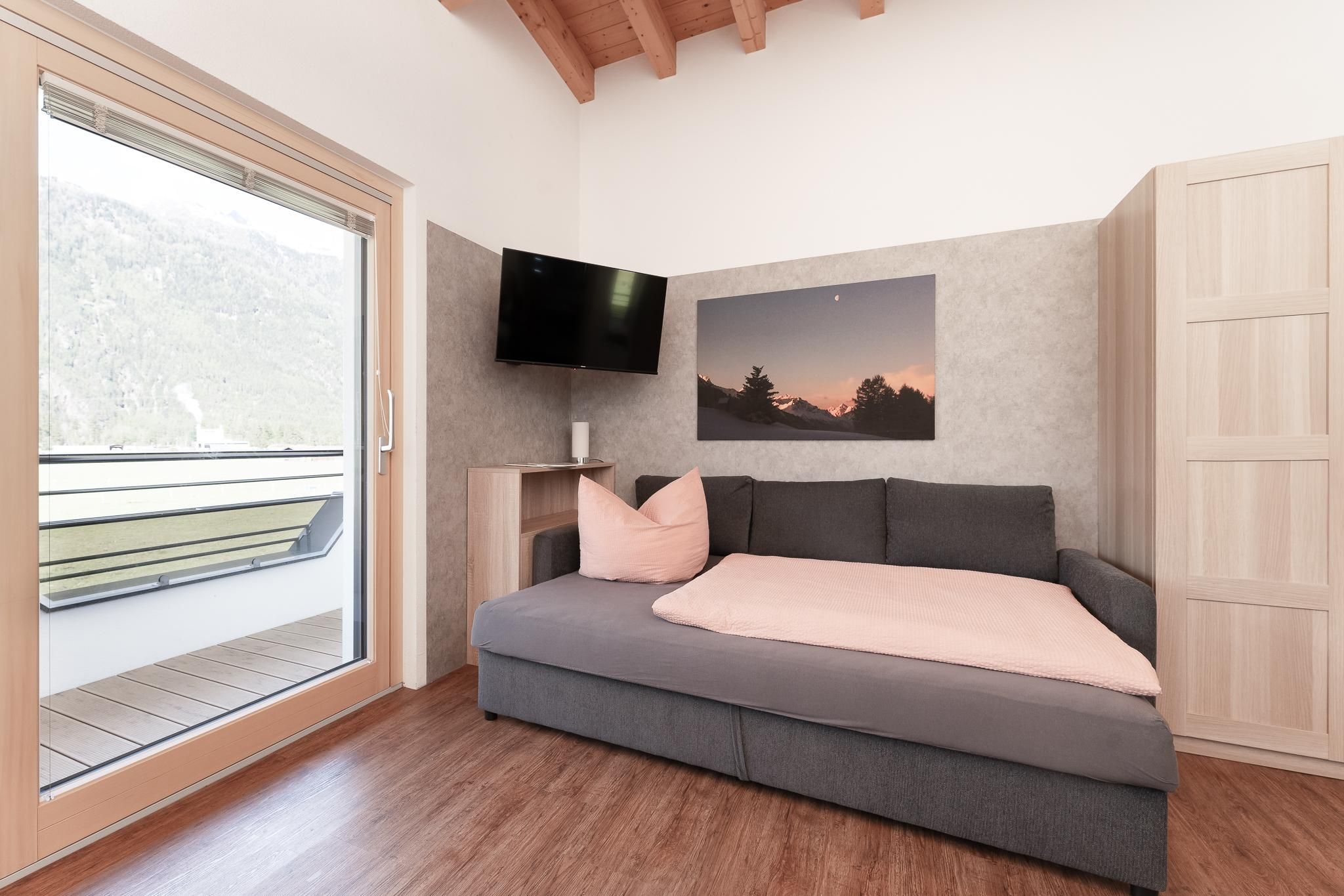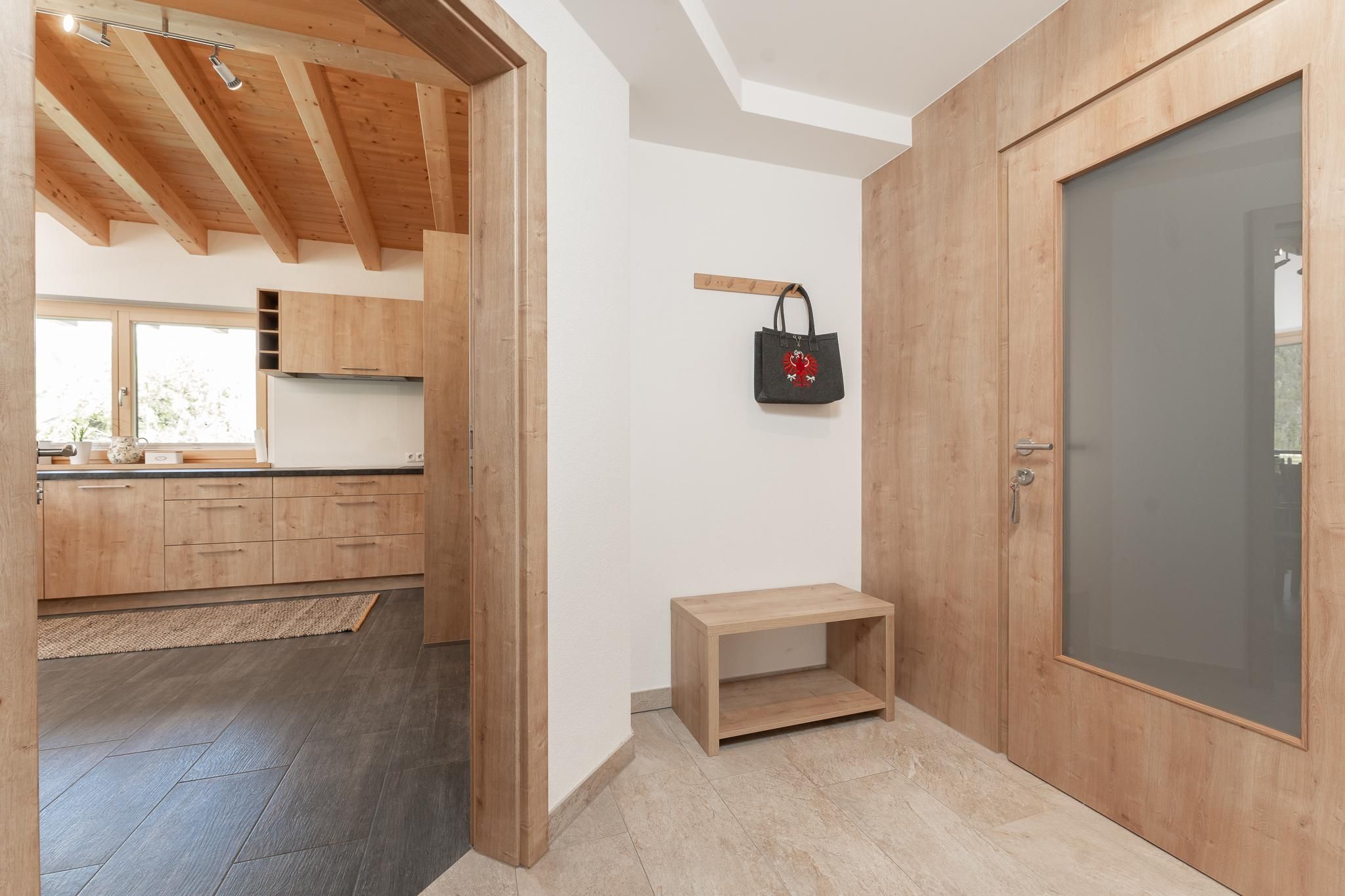 Das Apart Berggefühl (ca. 83 m²) verfügt über ein Doppelzimmer, ein Einzelzimmer, ein Badezimmer mit Eck-Badewanne, Dusche und WC, einem lichtdurchfluteten Wohnzimmer mit gemütlichem Kachelofen - dieser kann auf Wunsch vom Vermieter beheizt werden und einer großen, vollausgestattenen Küche (Induktionskochfeld, Kühlschrank/Gefrierschrank, Mikrowelle, Backrohr, Geschirrspüler, Wasserkocher, Eierkocher, Kapsel und Filter Kaffeemaschine, Toaster uvm.). Alle Räume - außer dem Einzelzimmer und dem Badezimmer - verfügen über einen direkten Zugang auf die große, möblierte Rundum-Terrasse. Genießen Sie einen einzigartigen Blick auf das Bergpanorama. Durch die hohen Räume und dem Holz-Sicht-Dachstuhl fühlt man sich den Bergen noch näher. Außerhalb der Einheit - auf der gleichen Etage befindet sich das Einzelzimmer mit Waschmöglichkeit und WC.
