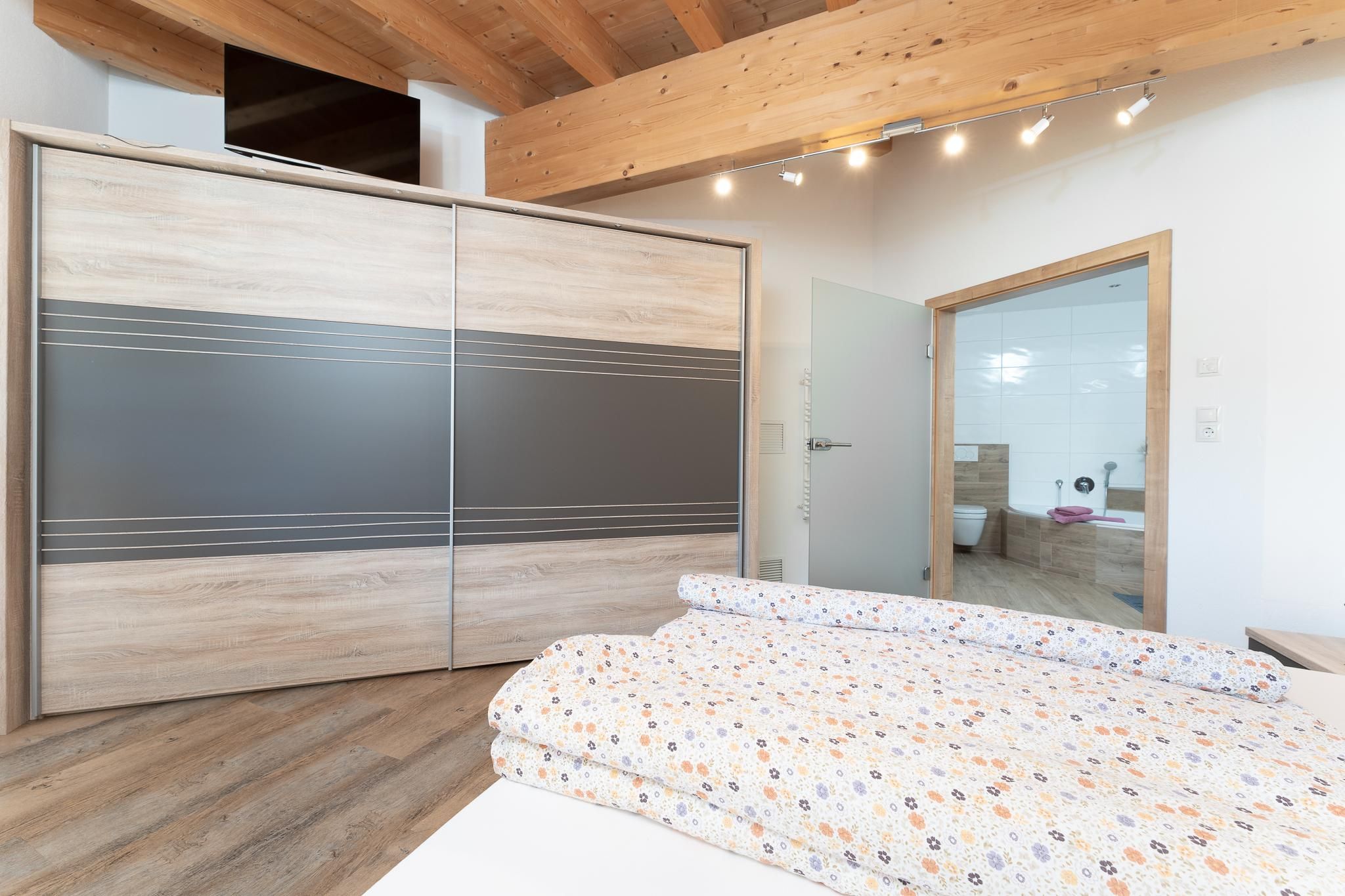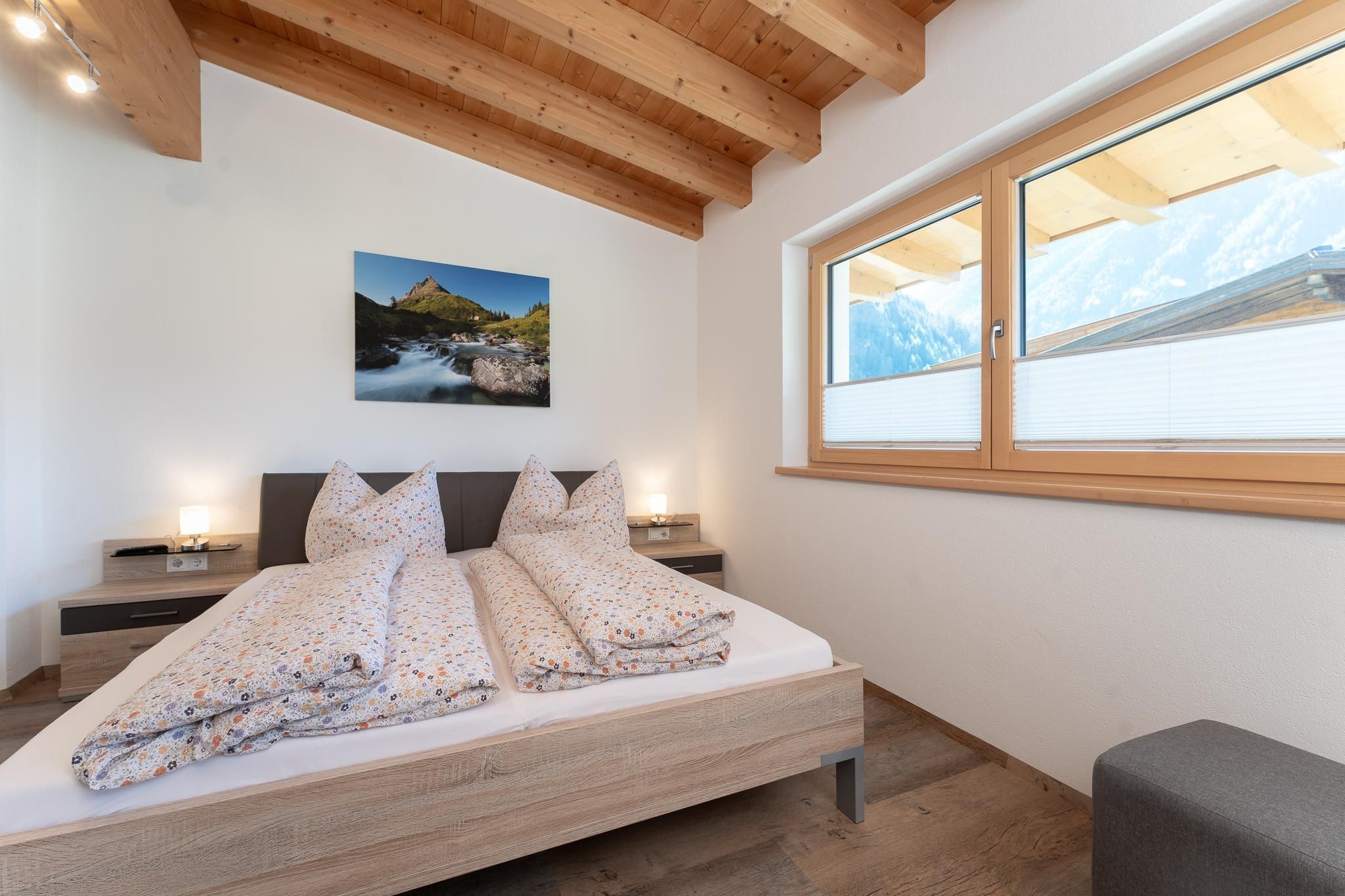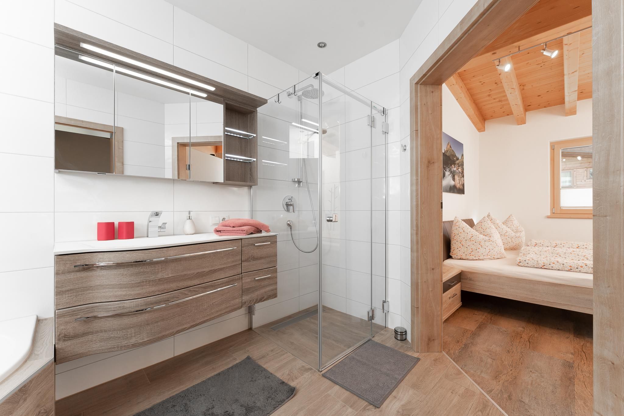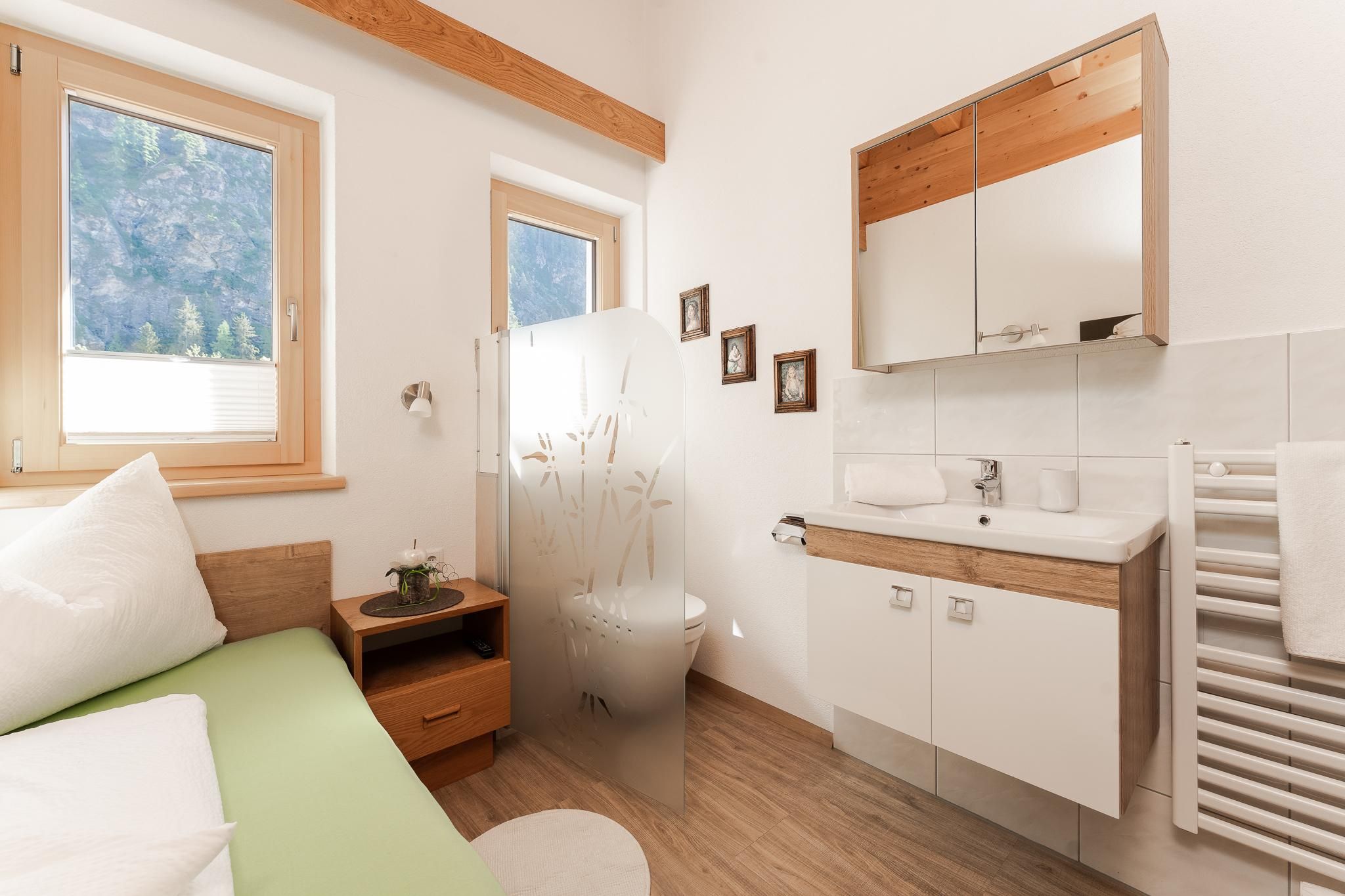 Das Apart Berggefühl (ca. 83 m²) verfügt über ein Doppelzimmer, ein Einzelzimmer, ein Badezimmer mit Eck-Badewanne, Dusche und WC, einem lichtdurchfluteten Wohnzimmer mit gemütlichem Kachelofen - dieser kann auf Wunsch vom Vermieter beheizt werden und einer großen, vollausgestattenen Küche (Induktionskochfeld, Kühlschrank/Gefrierschrank, Mikrowelle, Backrohr, Geschirrspüler, Wasserkocher, Eierkocher, Kapsel und Filter Kaffeemaschine, Toaster uvm.). Alle Räume - außer dem Einzelzimmer und dem Badezimmer - verfügen über einen direkten Zugang auf die große, möblierte Rundum-Terrasse. Genießen Sie einen einzigartigen Blick auf das Bergpanorama. Durch die hohen Räume und dem Holz-Sicht-Dachstuhl fühlt man sich den Bergen noch näher. Außerhalb der Einheit - auf der gleichen Etage befindet sich das Einzelzimmer mit Waschmöglichkeit und WC.