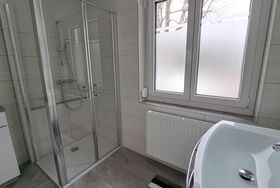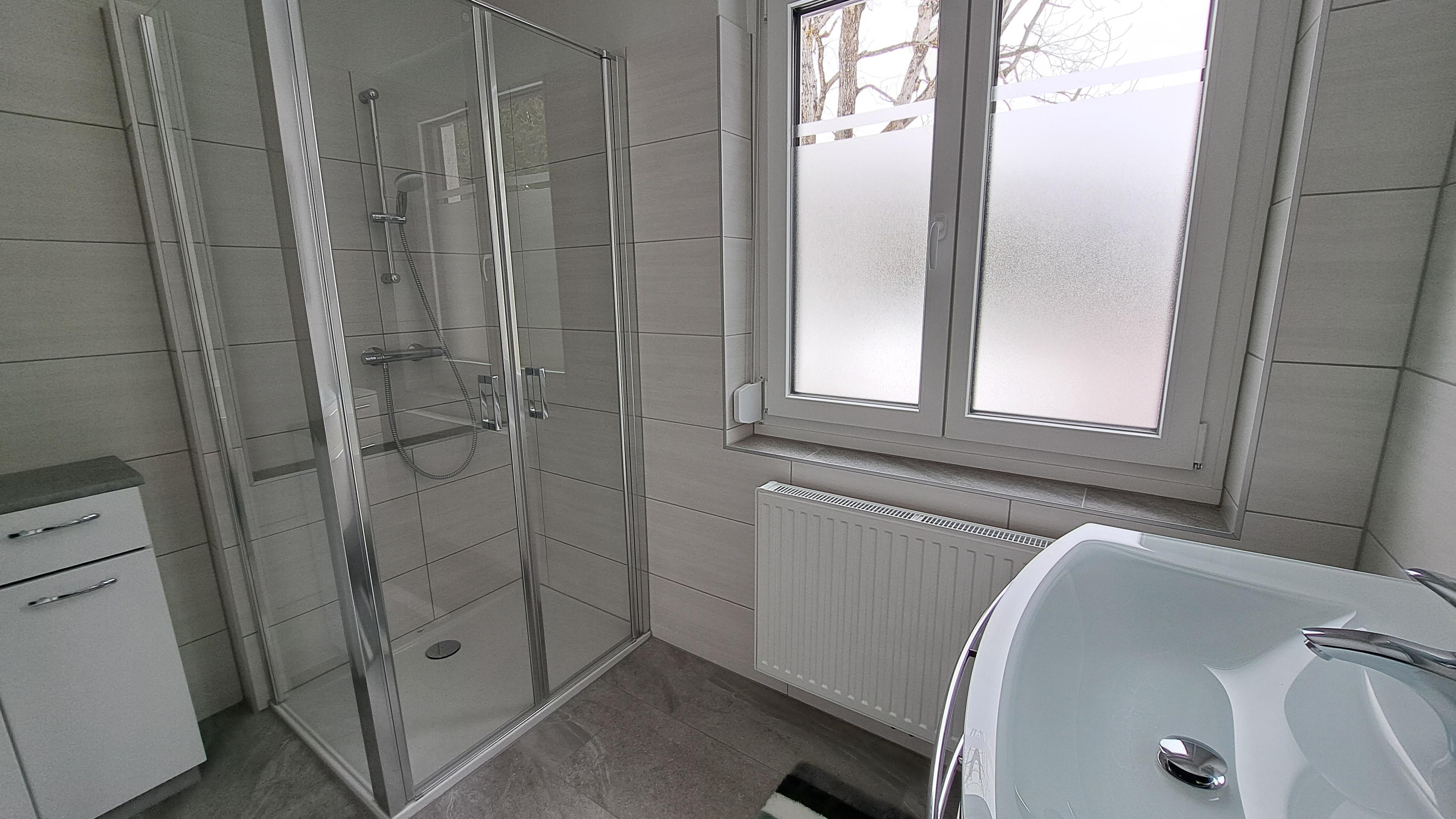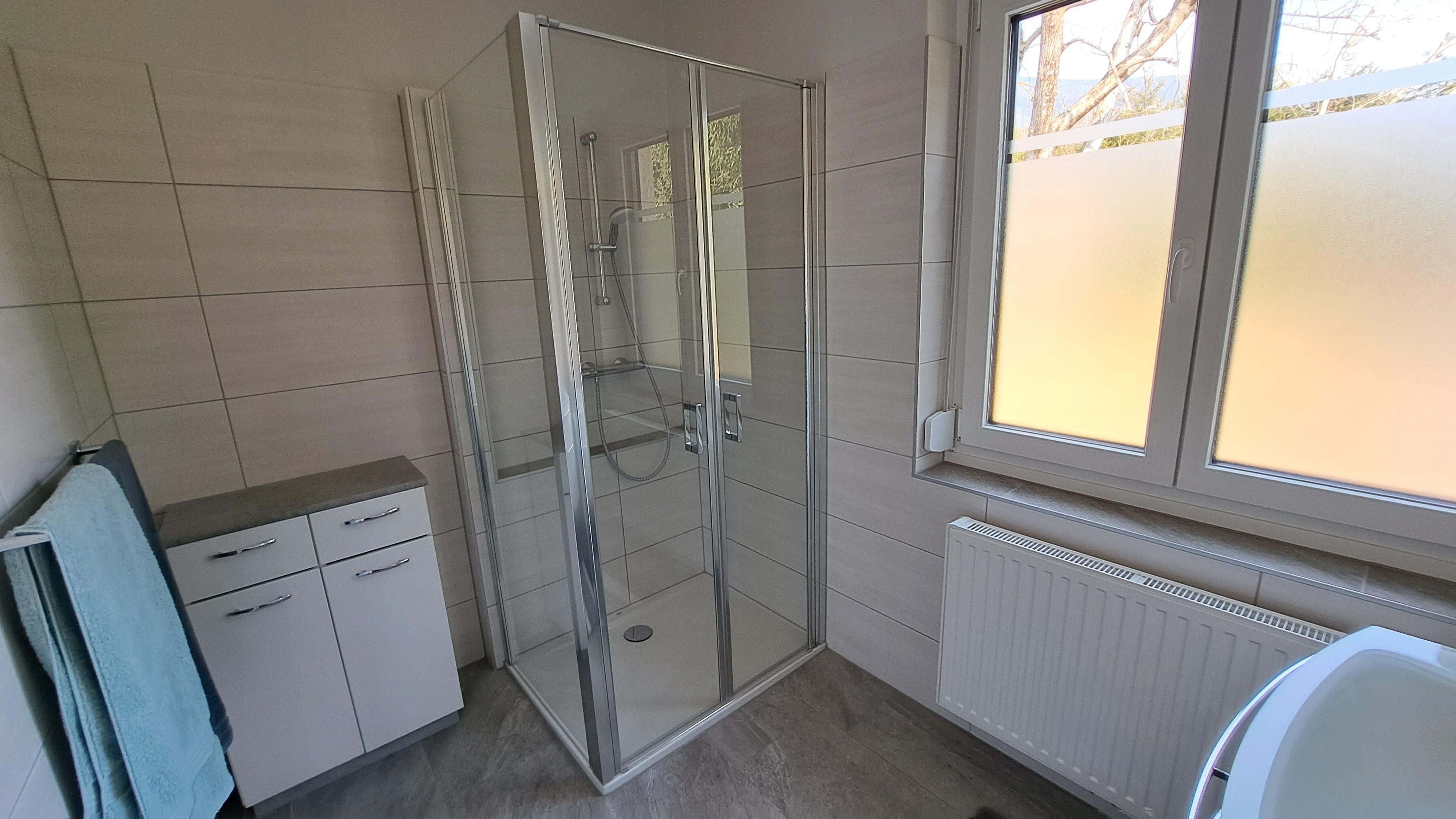Badezimmer: Dusche, Waschbecken, Fön, Waschmaschine, Bade und Handtücher. Seperates WC.