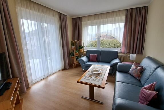 Wohnzimmer: Ledercouch, Flachbildschirm/Sat-TV, Wlan, direkter Zugang zur großen Terrasse.