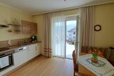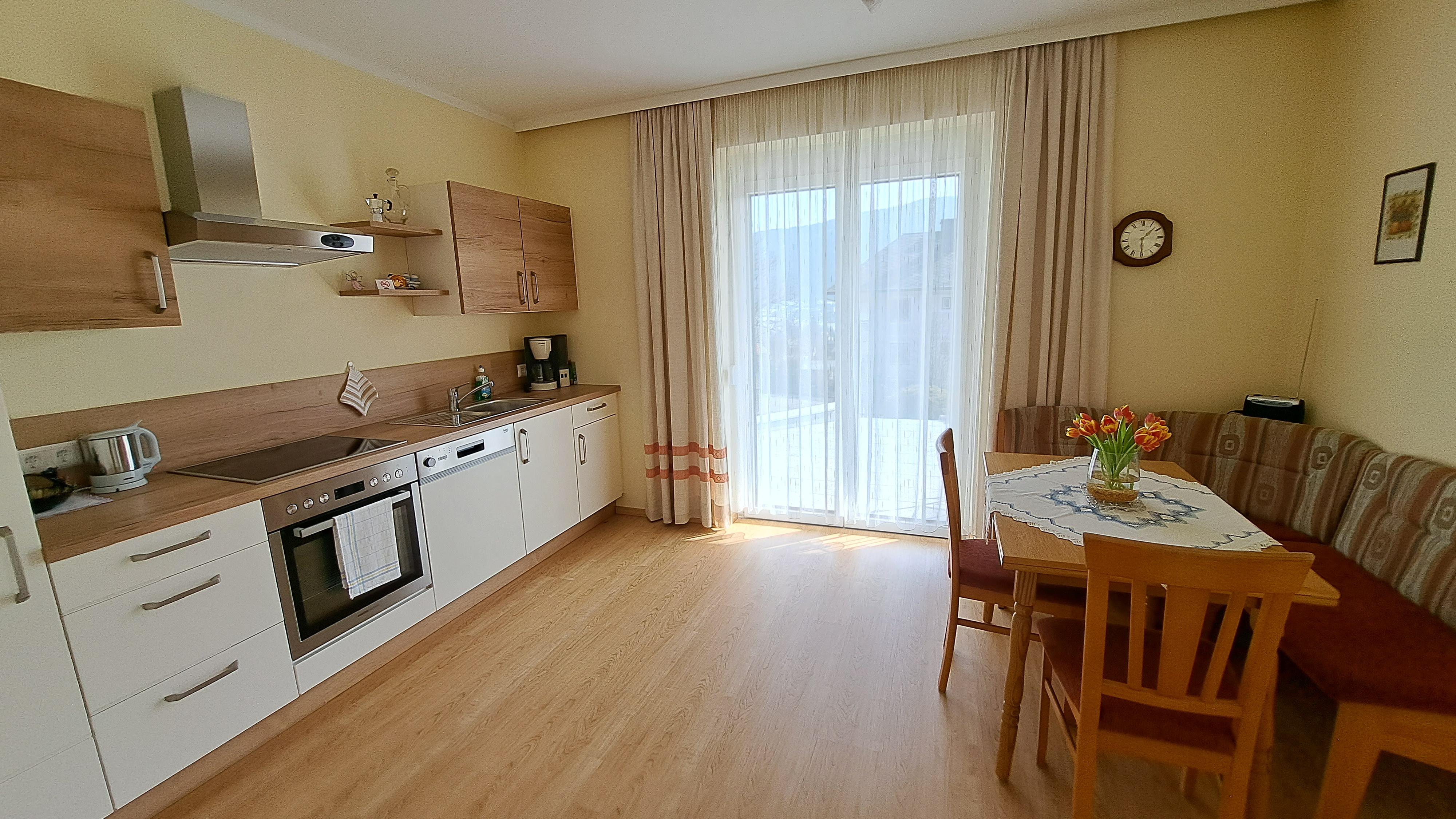 Küche: Kühl/Gefrierschrank, Elektroherd mit Cerankochfeld, Dunstabzug, Geschirrspüler, Spülbecken, Kaffeemaschine/Filter, Wasserkocher, Eierkocher, Radio, gemütliche Essecke, reichlich ausgestattet mit Geschirr und Gläser. Direkter Zugang zur großen Terrasse.