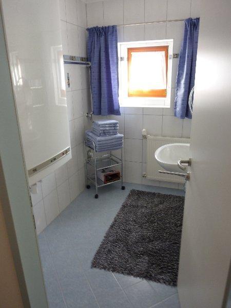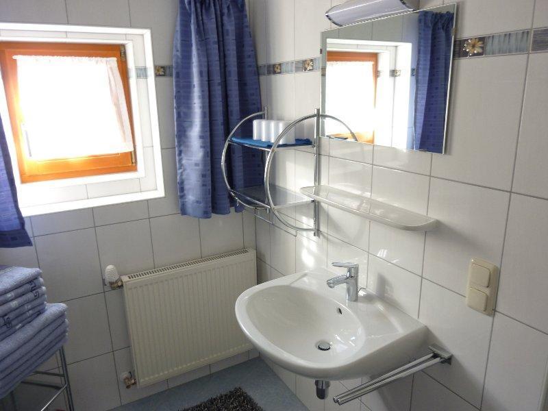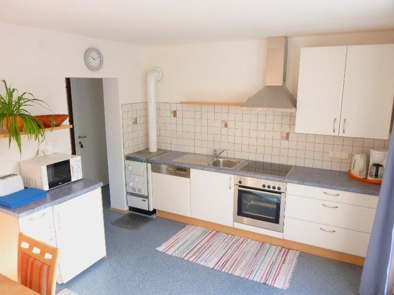 FEWO 1: ca 60m2, mit eigenem Auf- und Eingang. 1 2-Bettz. mit Zusatzbett, 1 2-Bettz. mit Kinderbett, 2 WC, Dusche; Wohnküche mit Sitzecke im Erker, gut ausgestattet, Ausziehcouch, reichlich Geschirr, Micro, Toaster, Wasser-/Eierkocher, Cafemaschine, Kühlschrank, E-Herd, Holzofen, WLan, alle Zimmer mit Kabel-TV, Geschirr-/Hand-/Duschtücher, PKW-Parkplatz.