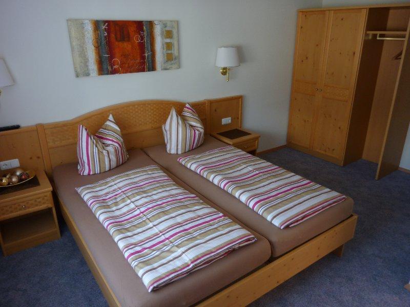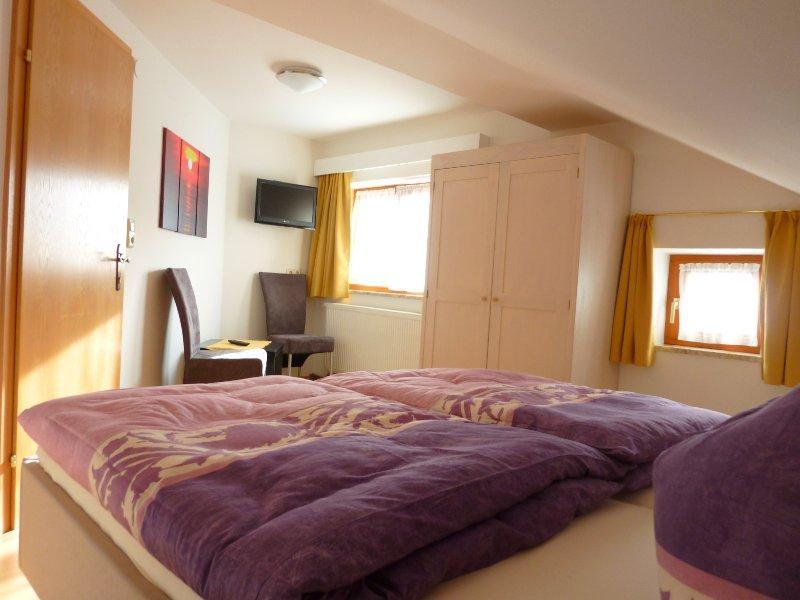 FEWO 2: ca 95m2, die Wohnung ist im 1.Stock und erstreckt sich in das Dachgeschoß, großer Balkon ost-und südseitig, Küche sehr gut ausgestattet-mit Spülmaschine, 3 Schlafzimmer, 1 Wohnraum, 1 Babybett, 1 Dusche, 2 WC, Kabel-TV, Wlan, Hand-/Dusch-/Geschirrtücher, PKW-Parkplatz.