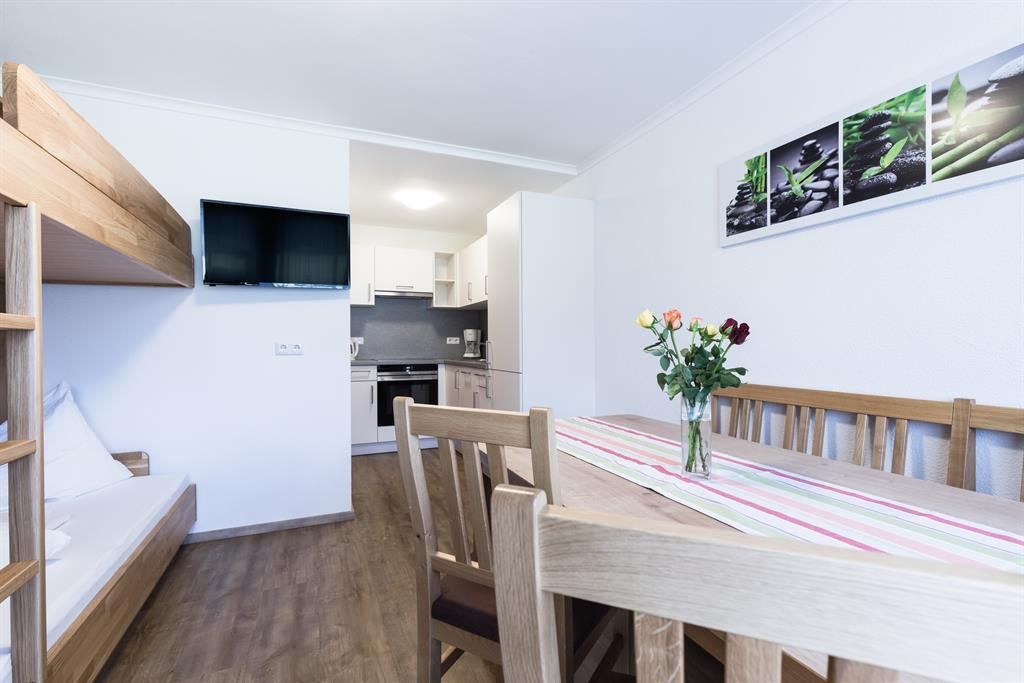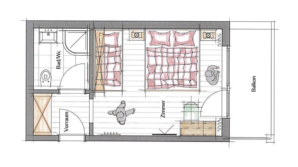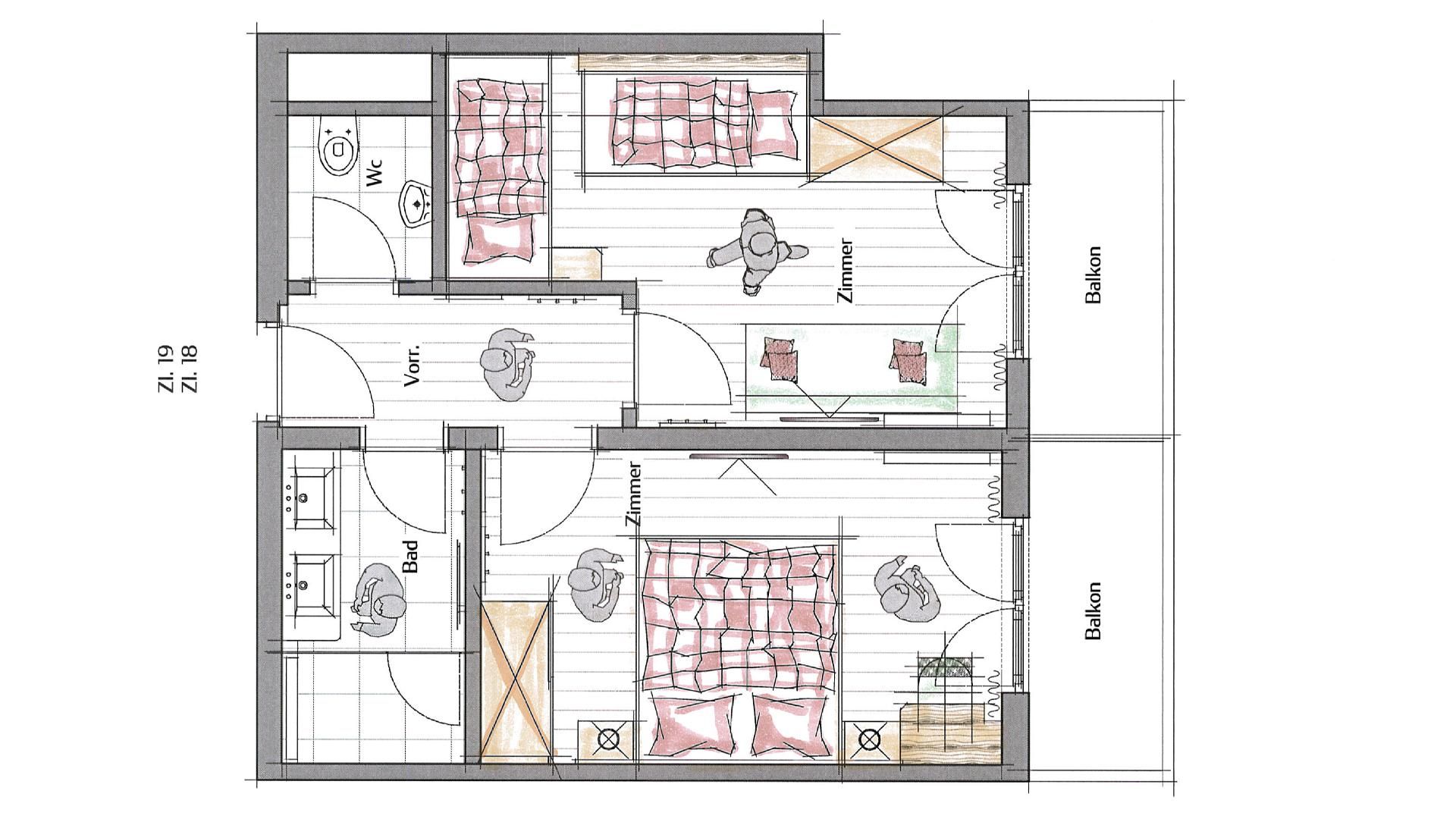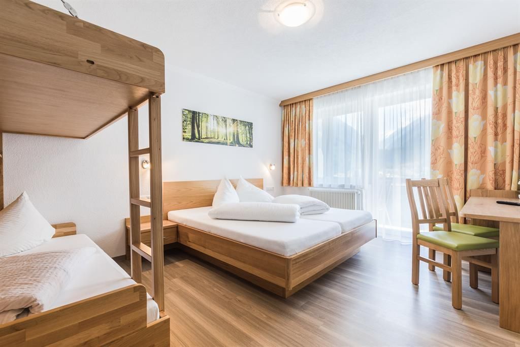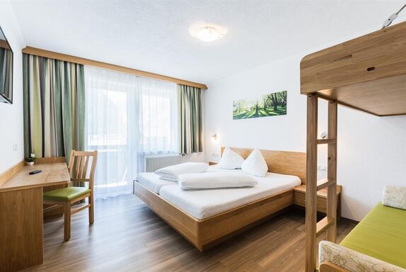 Unsere Dreibettzimmer sind mit einem Doppelbett und einem hochwertigen Zusatzbett ausgestattet. Ein Flat-Screen-TV, großen Ankleidespiegel und ein Schreibtisch befindet sich auch im Zimmer. Das Badezimmer verfügt über Dusche, WC, Haarföhn und Handtuchtrockner. Freies W-lan im Zimmer. Vom Balkon aus, können Sie einen herrlichen Blick in unsere schöne Bergwelt geniessen.