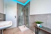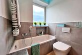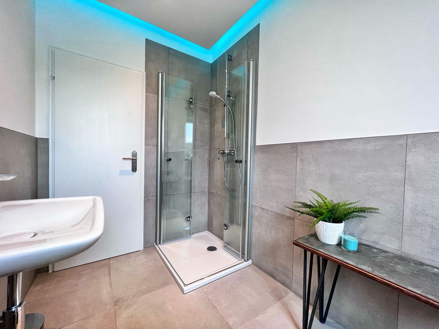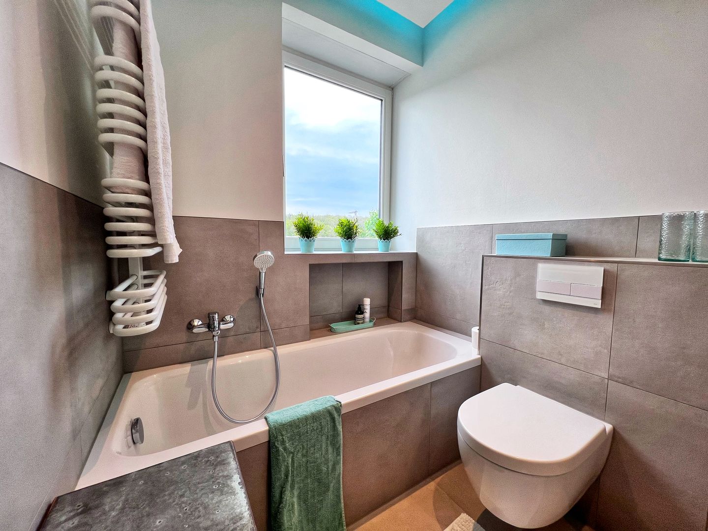 Das Bad ist mit Badewanne und bodentiefer Dusche ausgestattet. Die Ambientebeleuchtung macht den Wellnessabend in der Wanne perfekt. Selbstverständlich steht eine Erstausstattung an Pflegeprodukten zur Verfügung. Auch für einen Haartrockner wurde gesorgt.