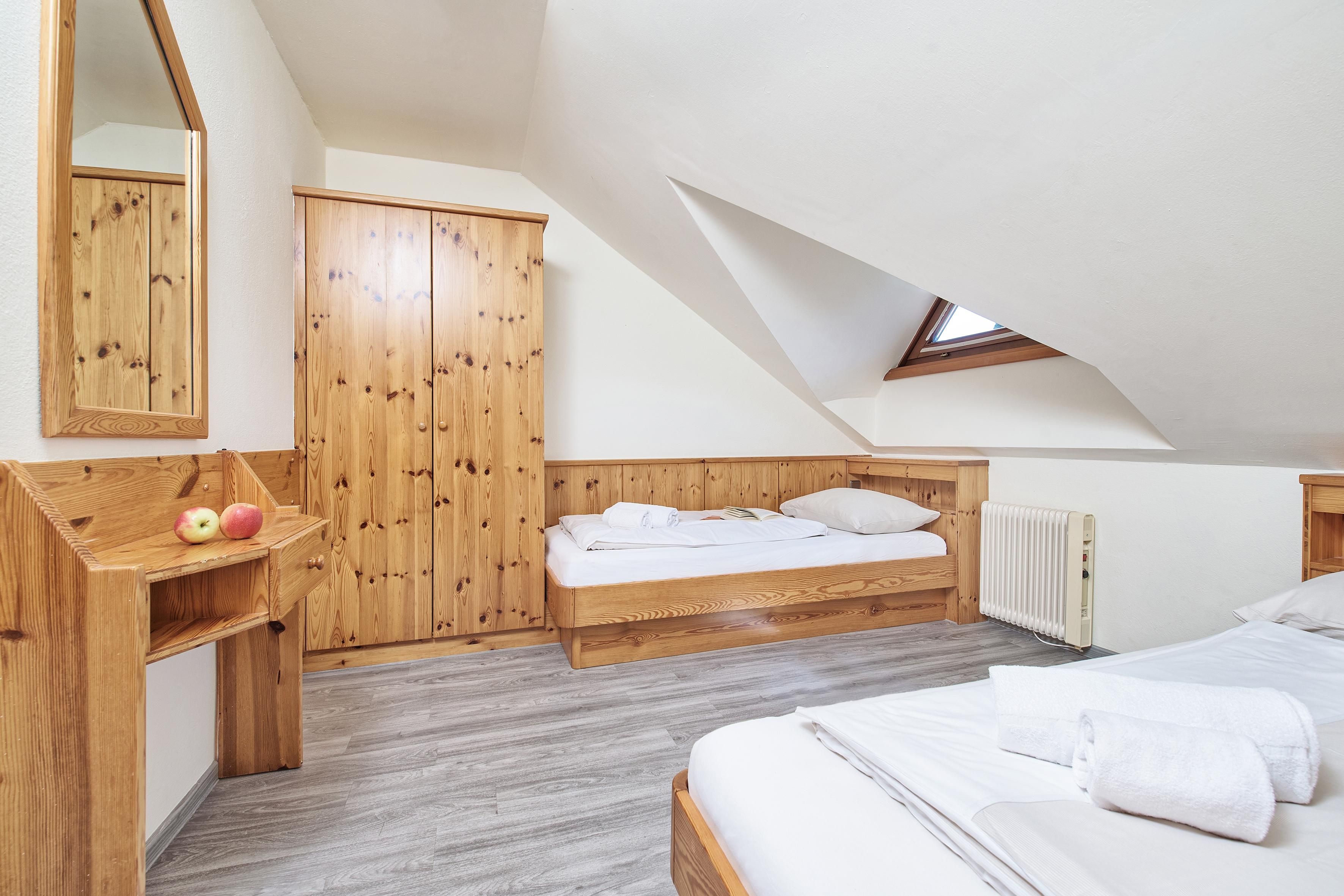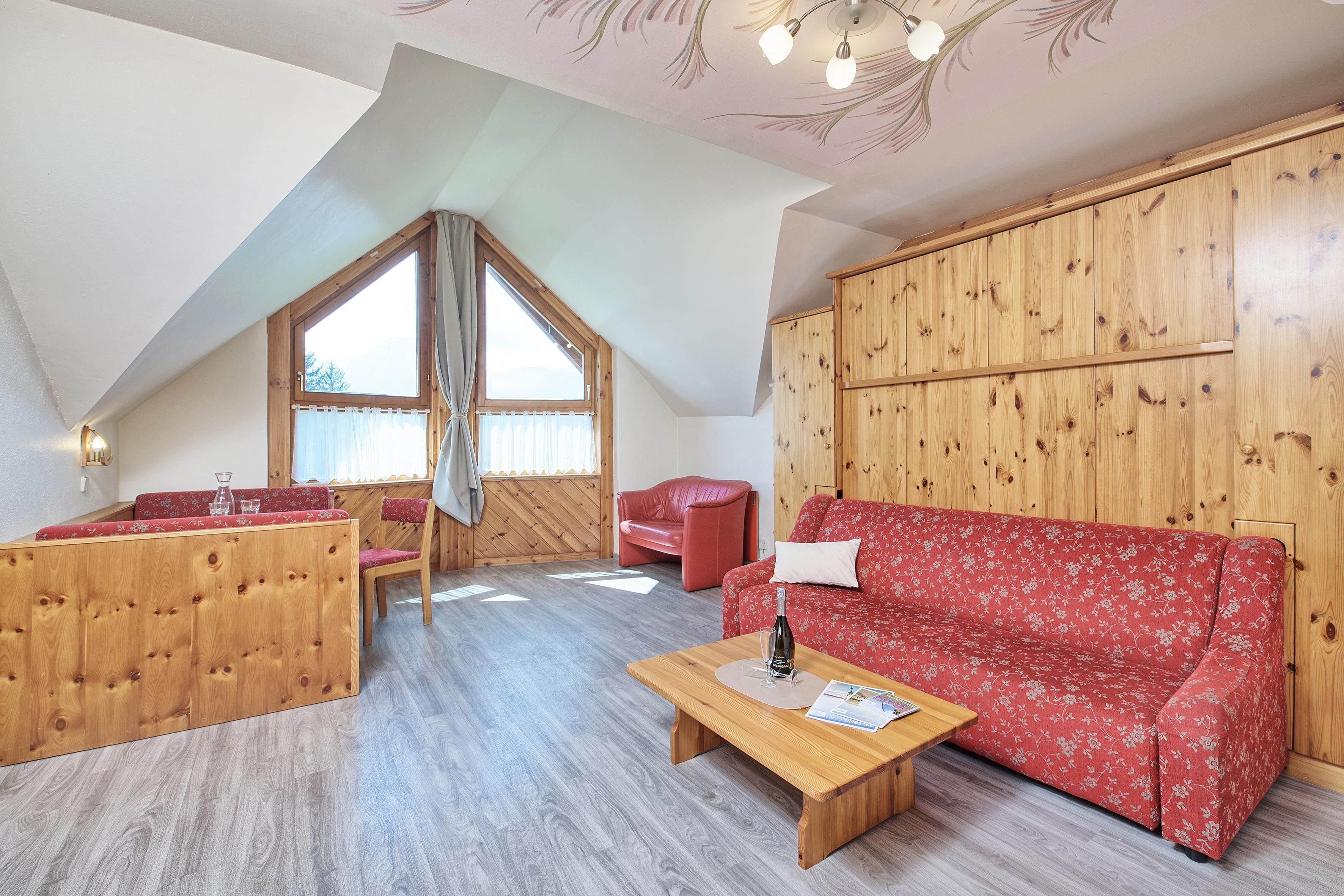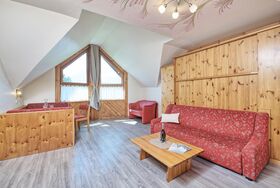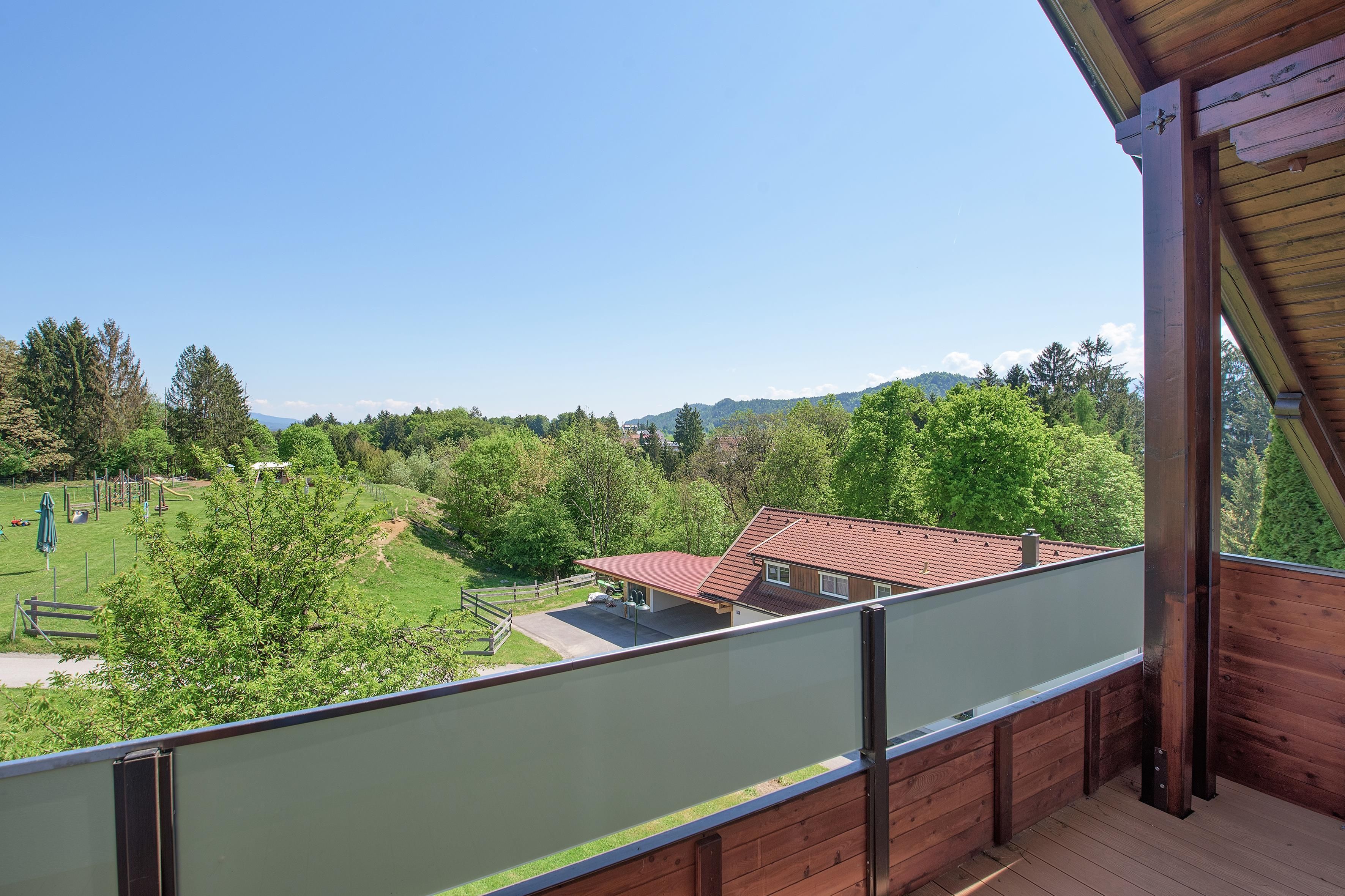 Das Appartement teil sich in einen Wohnbereich mit umklappbarem Schrankbett (Doppelbett), Sitzecke und TV, und zwei separaten Schlafzimmern (1x Doppelbett mit Zugang Balkon, 1x zwei getrennte Betten). Das Badezimmer hat zwei Waschbecken und Dusche, WC ist getrennt. In der Kochnische findet sich Geschirr für maximal 7 Personen. Der Balkon hat eine östliche Ausrichtung mit Blick auf die Karawanken,
