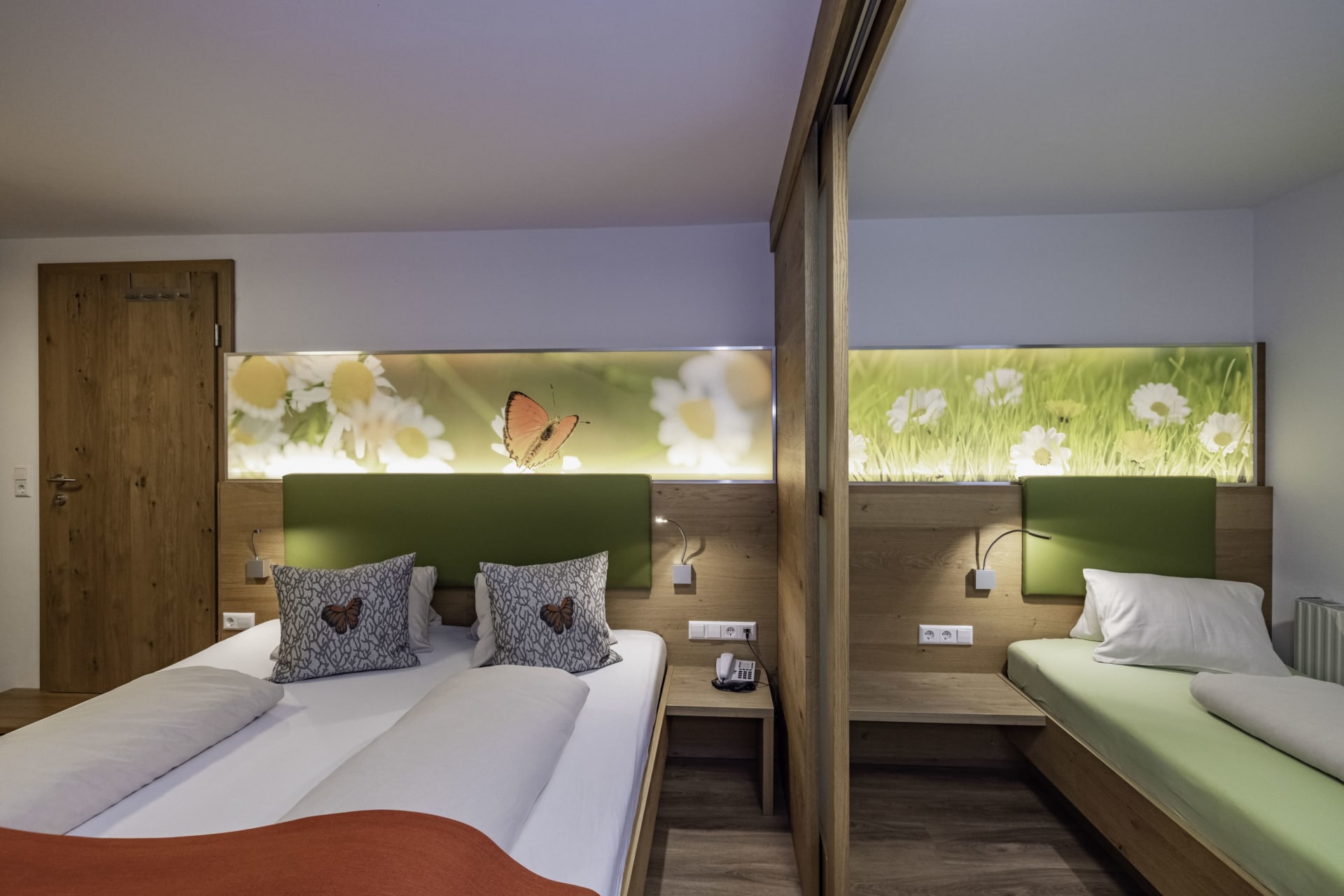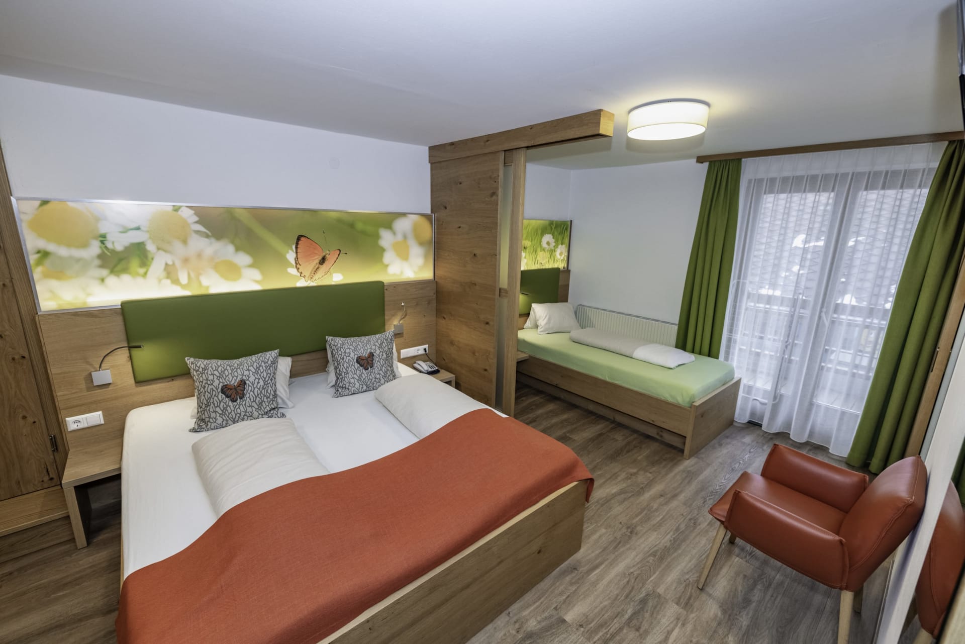 Doppelbett (180x200), 1 zusätzliches Bett (90x190) hinter einer Trennwand