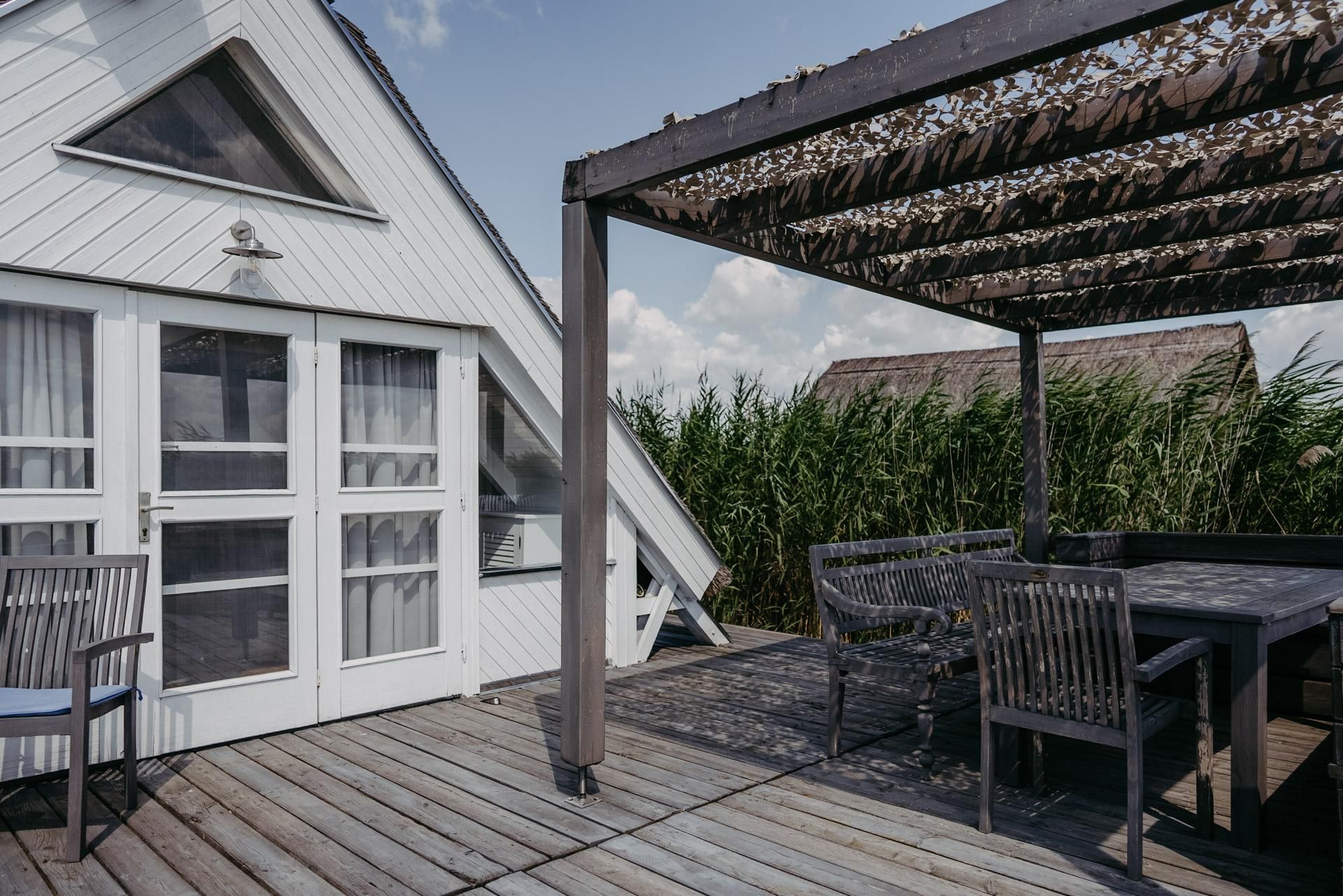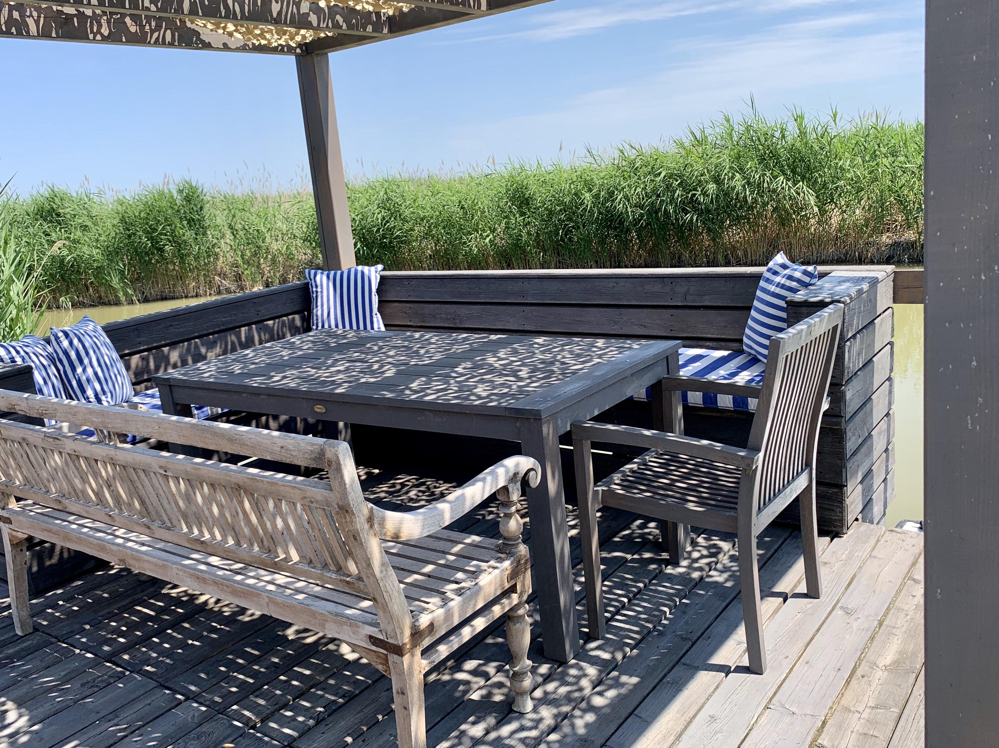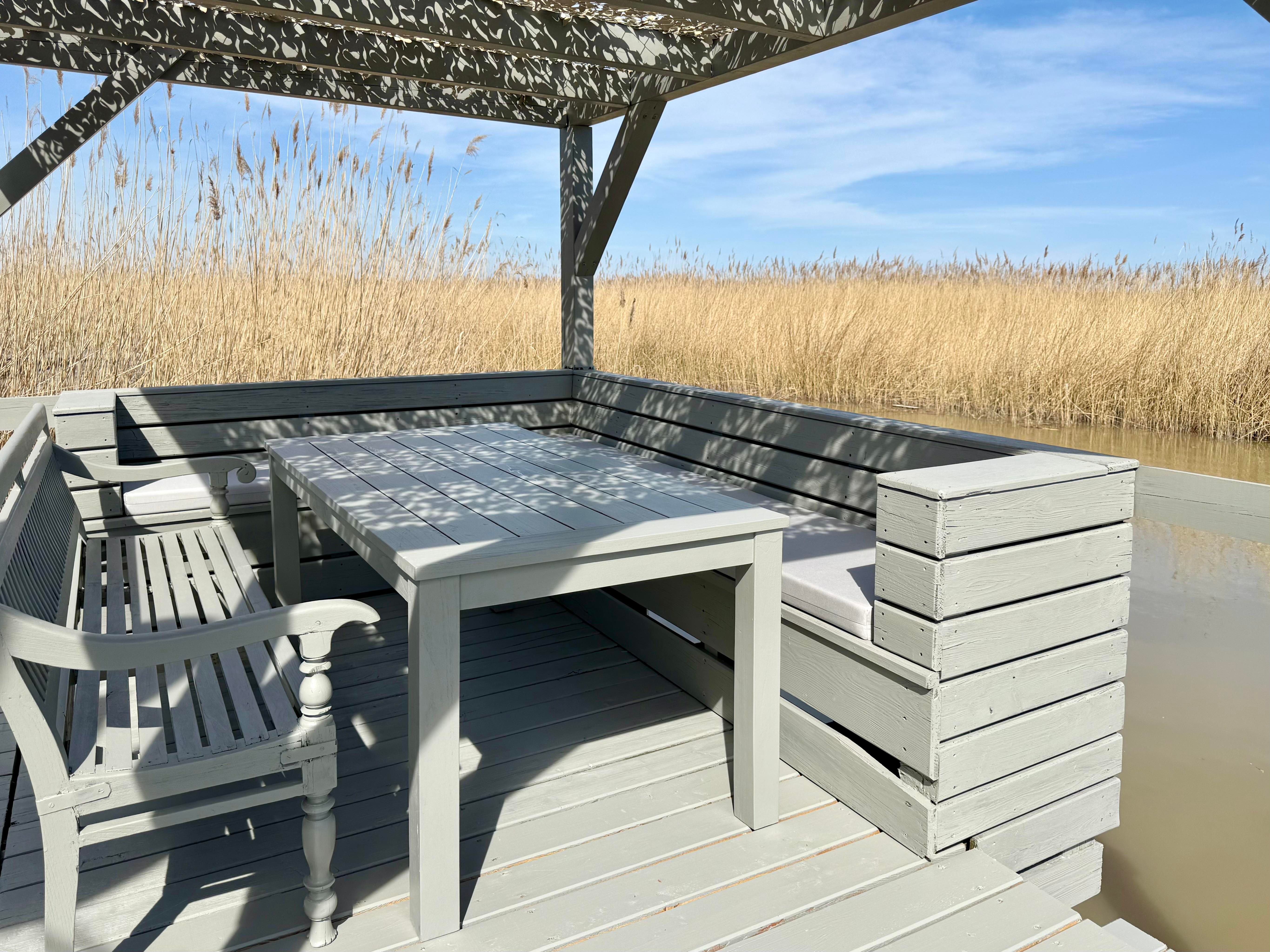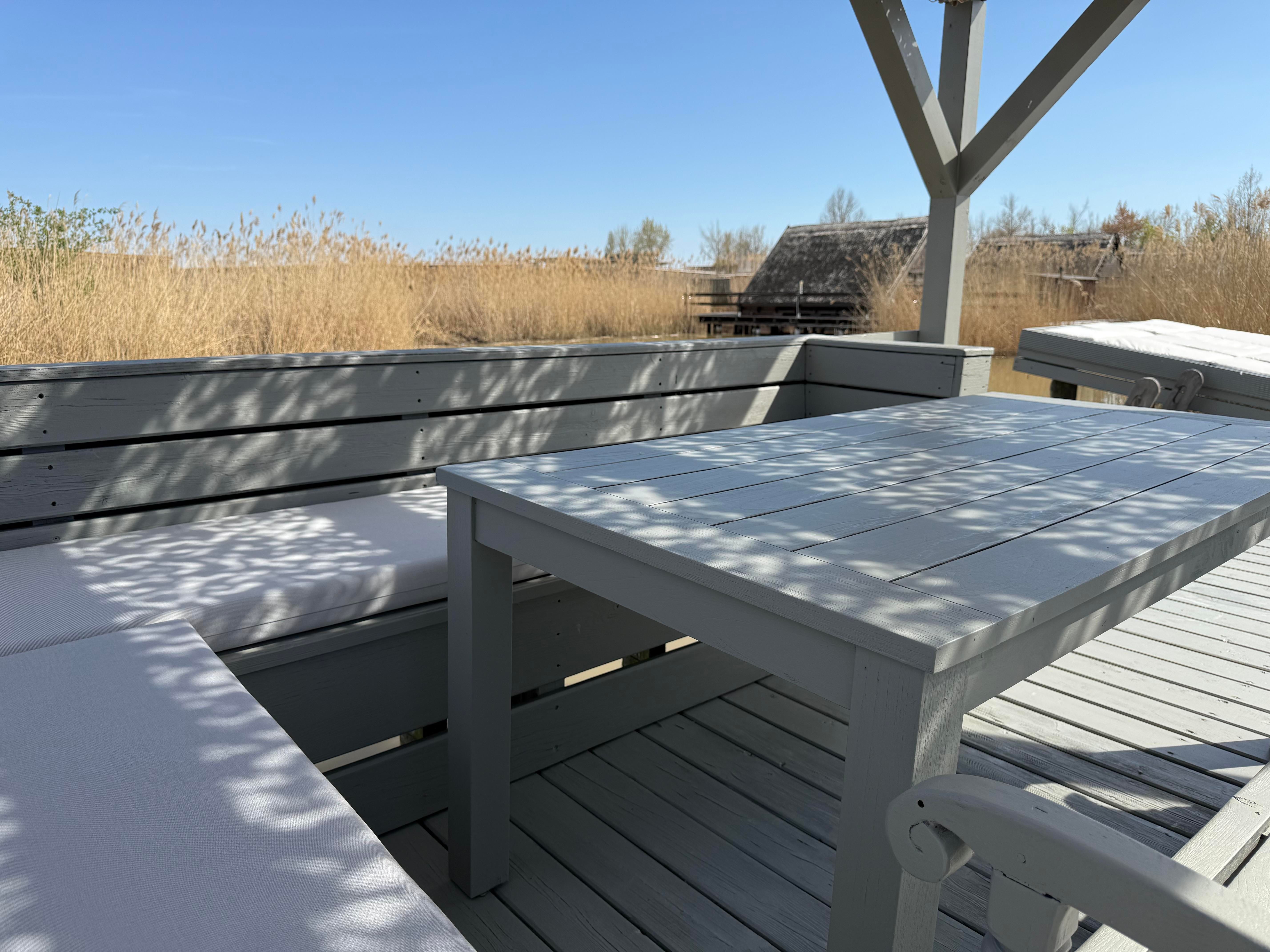 Vor der Seehütte kann man schwimmen. Der gesamte Neusiedlersee ist aber nicht sehr tief. Ein großes Sonnendeck mit gepolsterten Auflagen lädt zum Sonnenbaden und Entspannen ein. Neben dem Esstisch in der Hütte haben Sie auch Draußen auf der Terrasse einen großen Esstisch mit gemütlicher Eckbank. Die Hütte liegt mitten im Naturschutzgebiet und ist von Wasser und Schilf umgeben. Der Neusiedlersee und die Ruster Altstadt gehören zum UNESCO Weltkulturerbe. Damit misst die UNESCO der Kulturlandschaft Neusiedler See einen außergewöhnlichen Wert für die gesamte Menschheit bei.