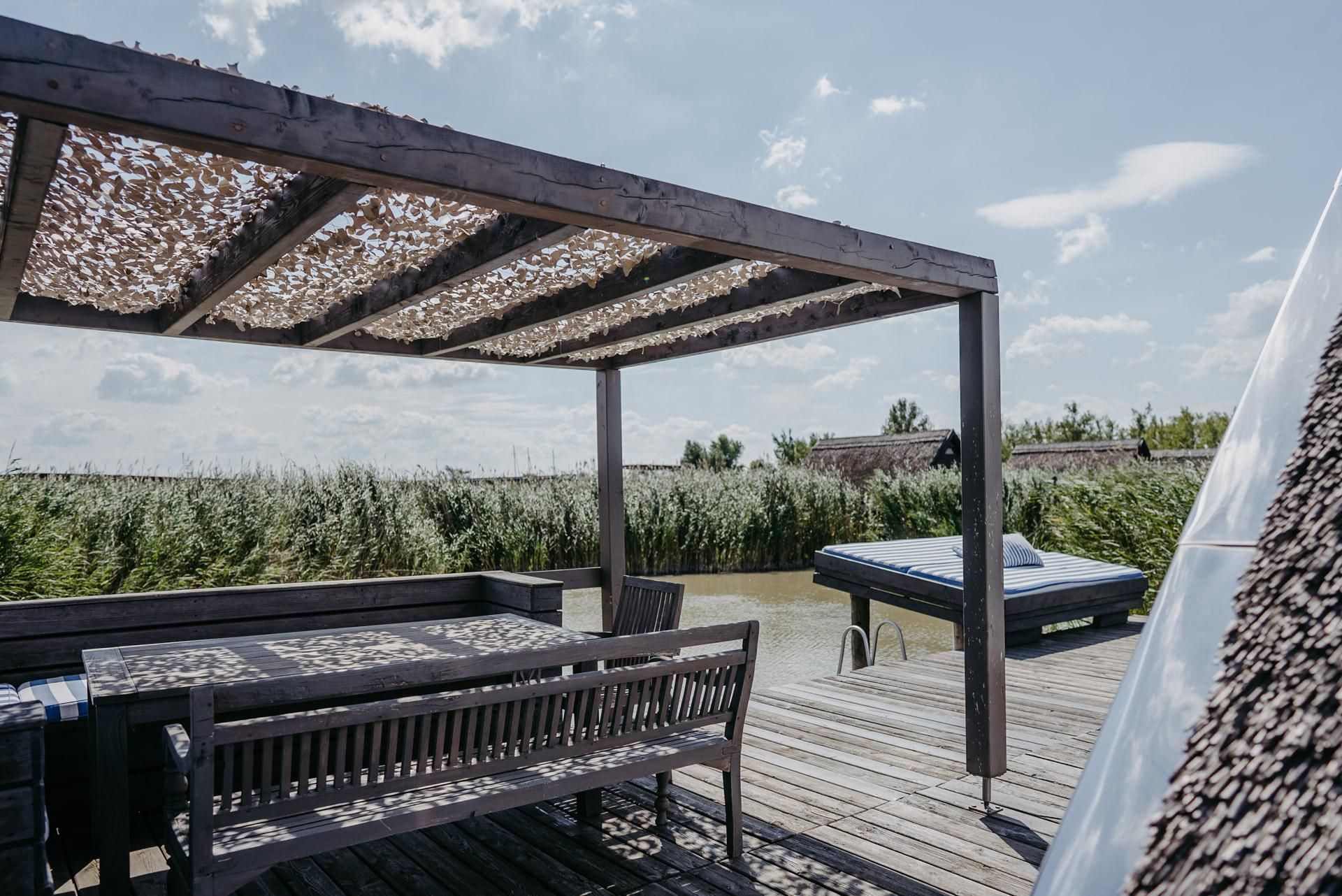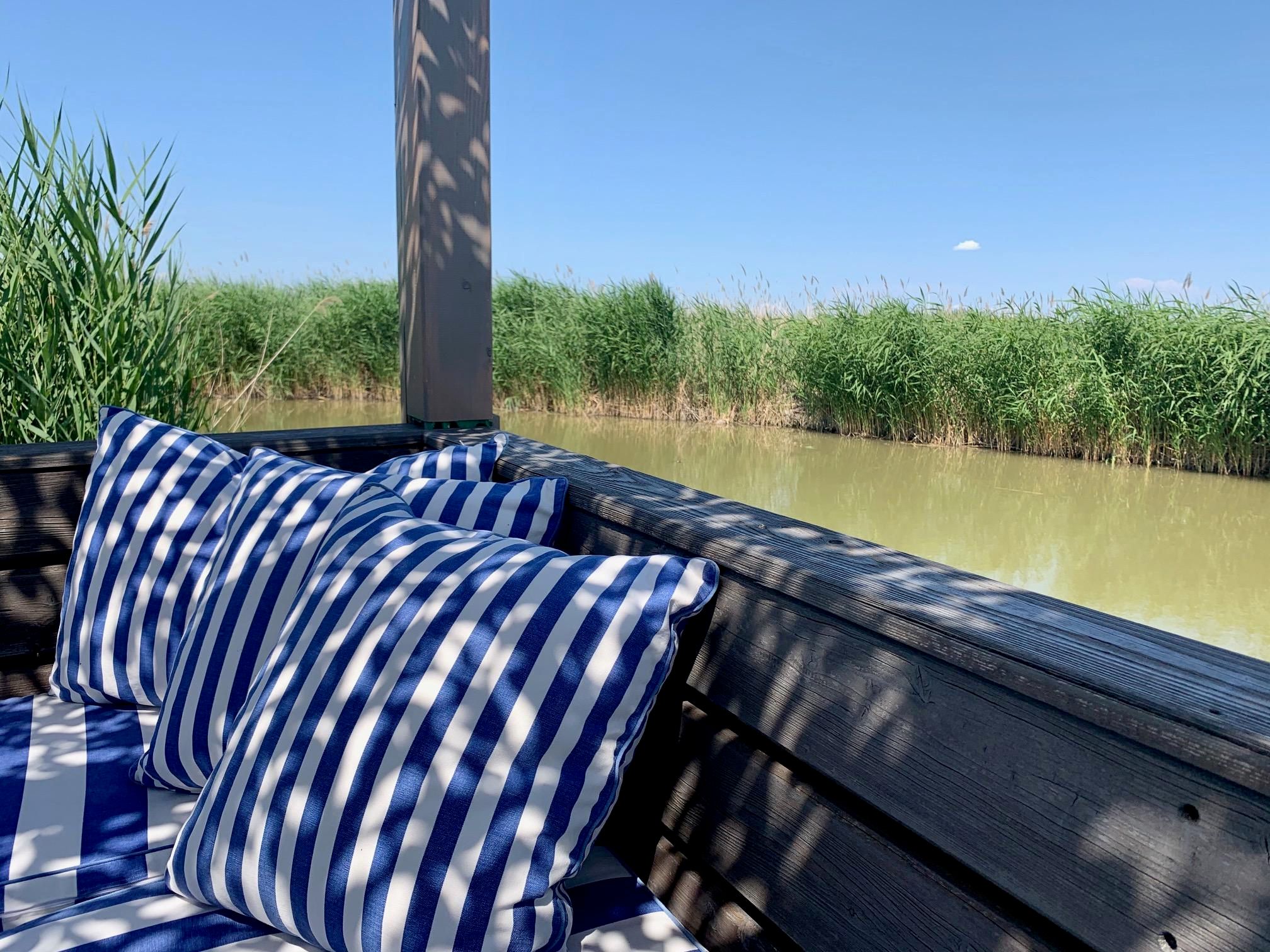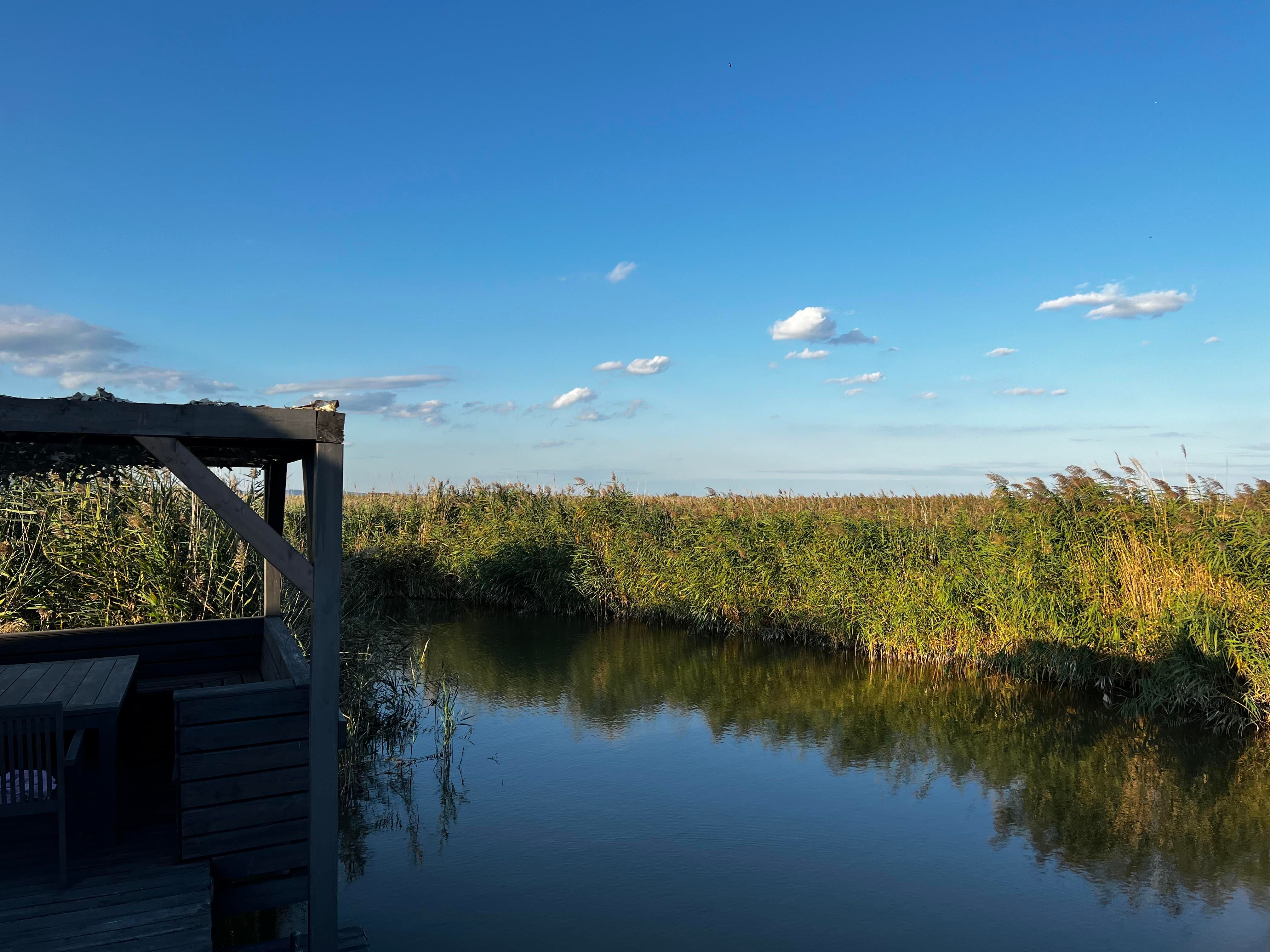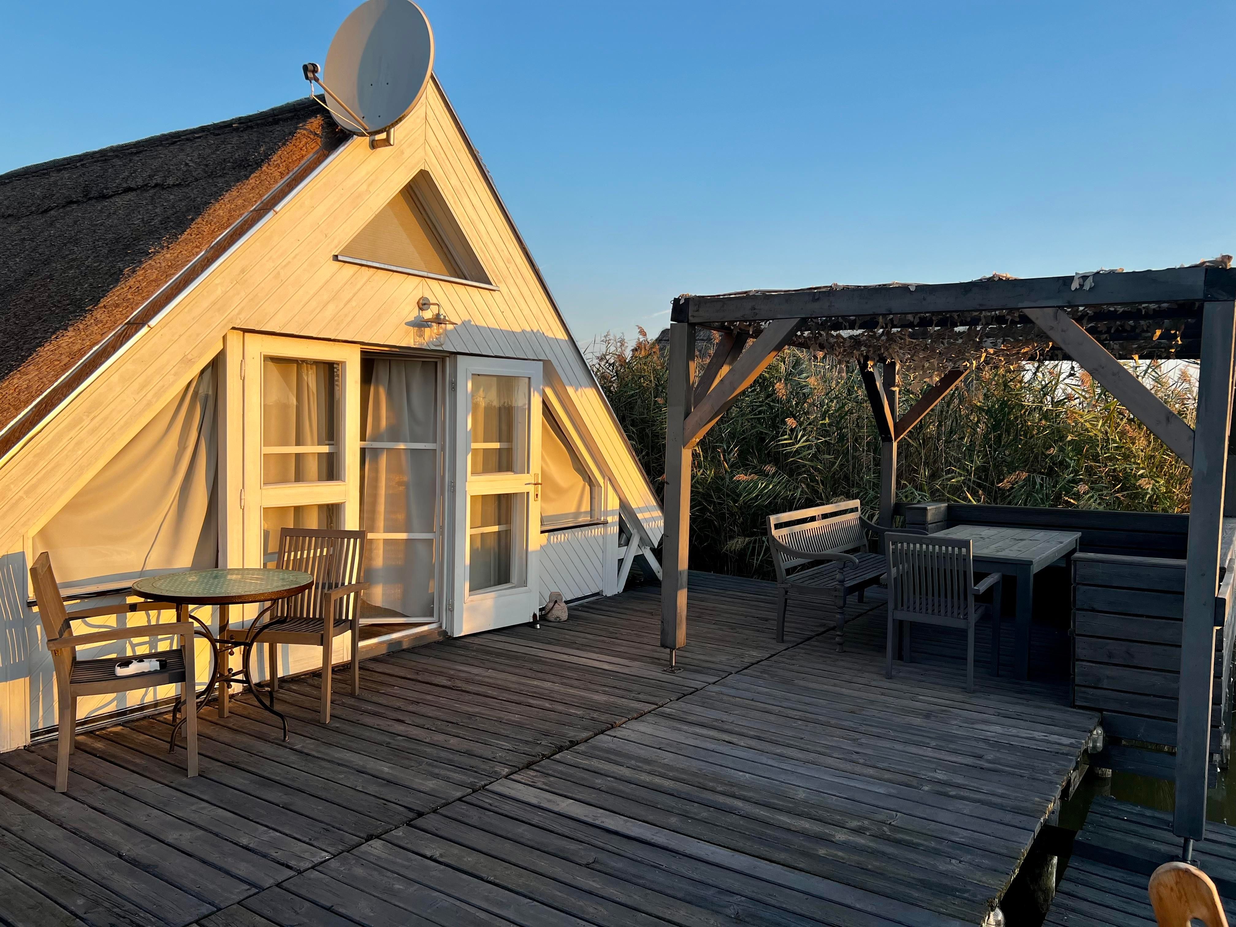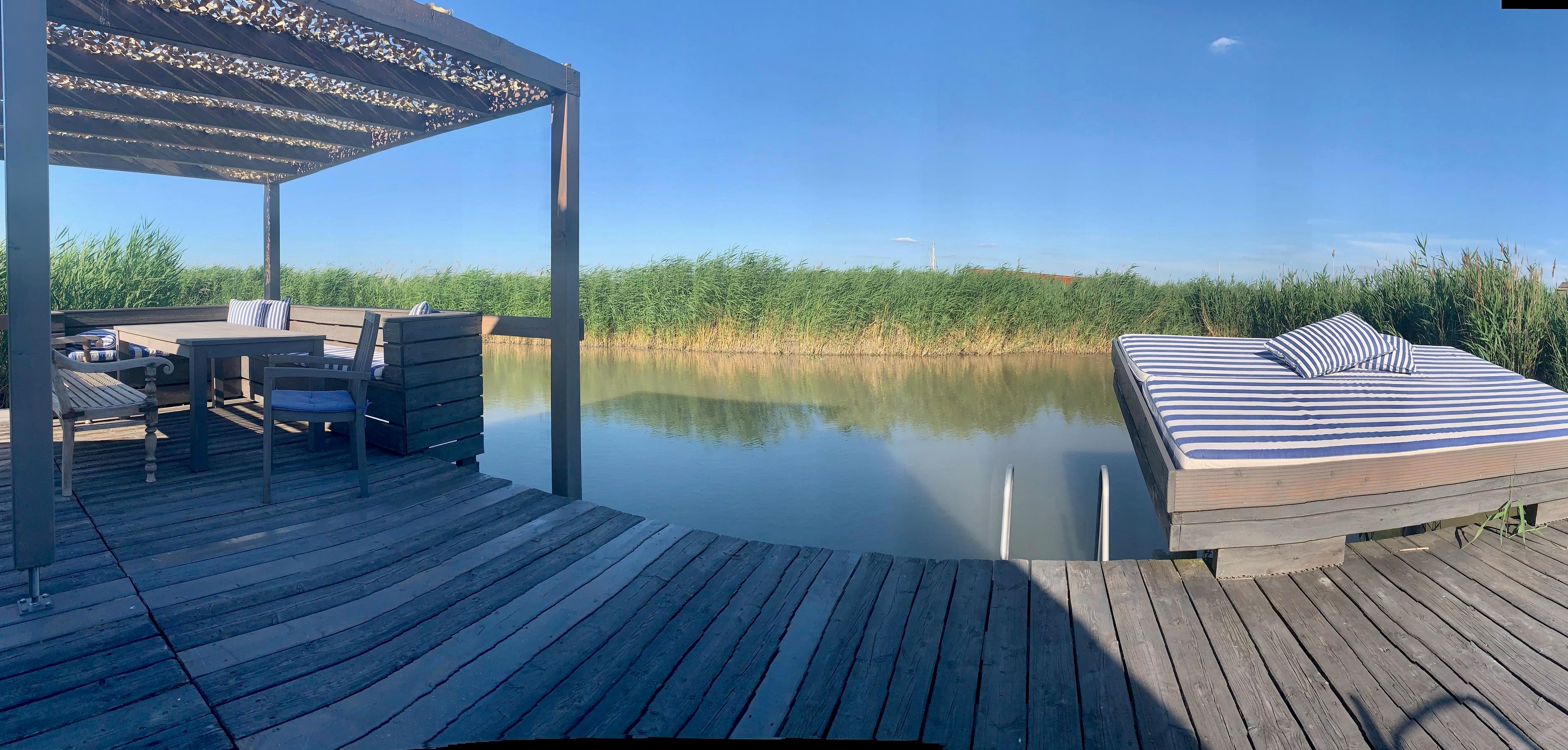 Vor der Hütte gibt es einen großzügigen Schwimmbereich, wobei der gesamte See nicht sehr tief ist. Ein großes Sonnendeck mit gepolsterten Auflagen lädt zum Sonnenbaden und Entspannen ein. Neben dem großen Esstisch in der Hütte haben Sie auch Draußen auf der Terrasse, unter einem schattigen Segel, eine Eckbank mit Esstisch direkt über dem Wasser. Die Hütte liegt mitten im Naturschutzgebiet und ist von Wasser und Schilf umgeben. Der Neusiedler See und die Ruster Altstadt gehören zum UNESCO Weltkulturerbe. Damit misst die UNESCO der Kulturlandschaft Neusiedler See einen außergewöhnlichen Wert für die gesamte Menschheit bei.