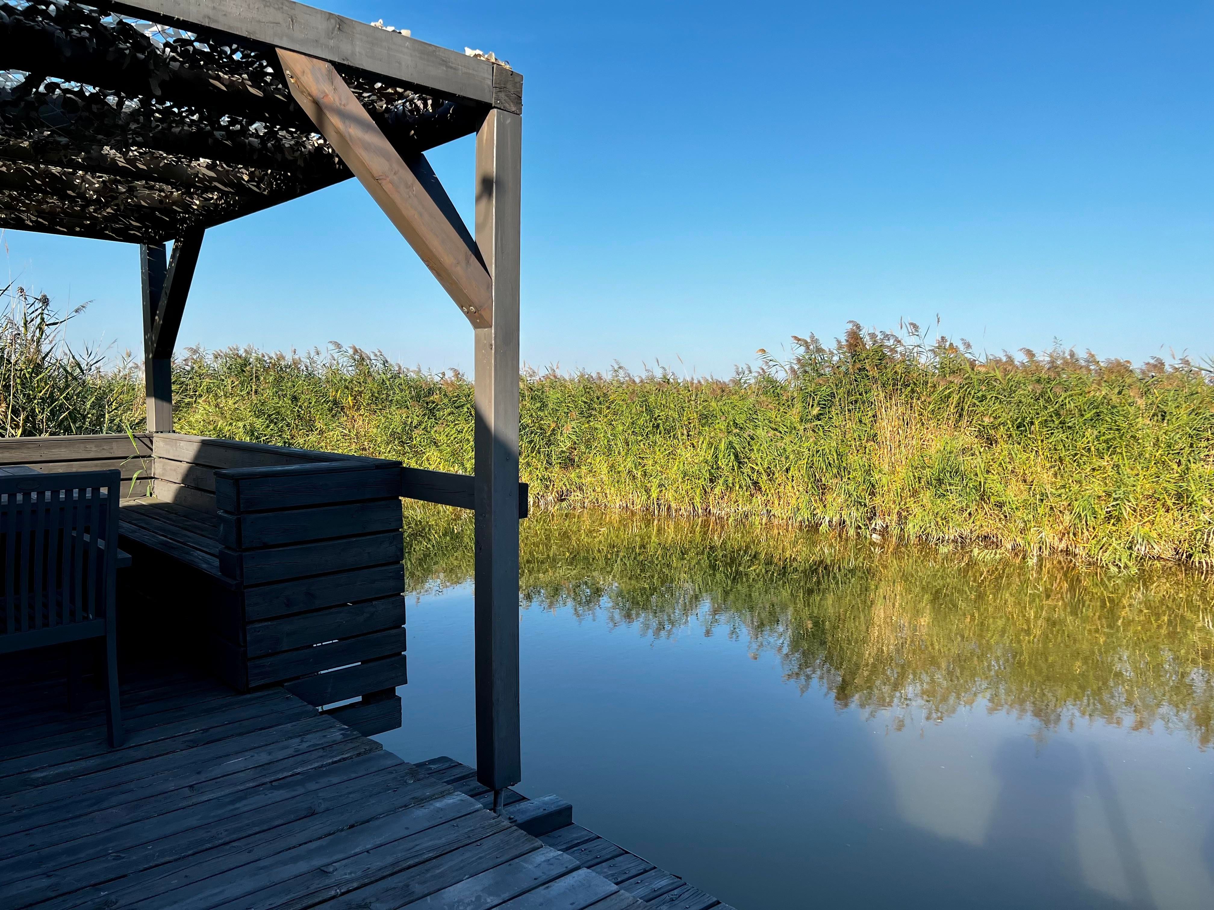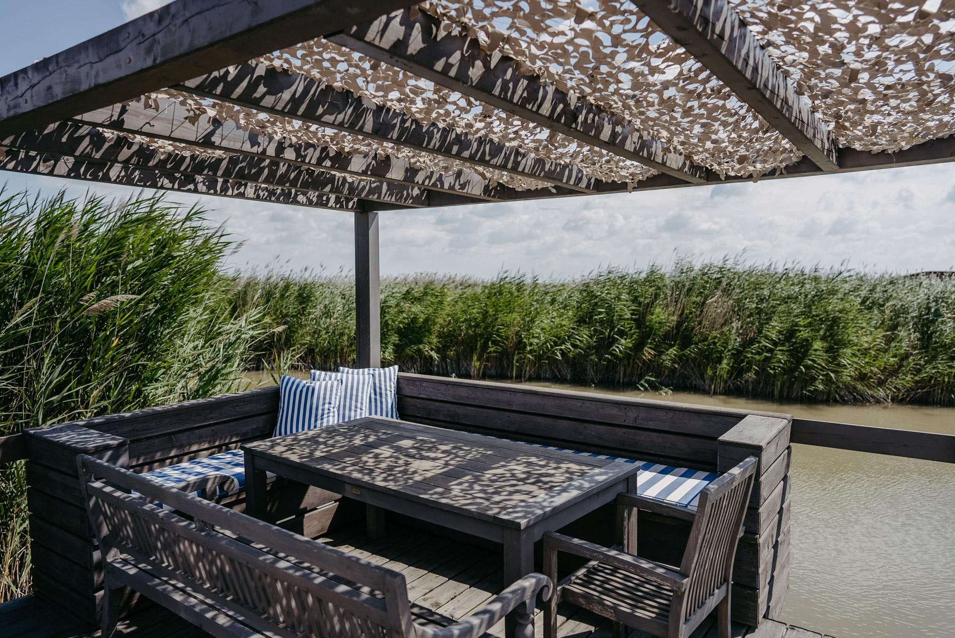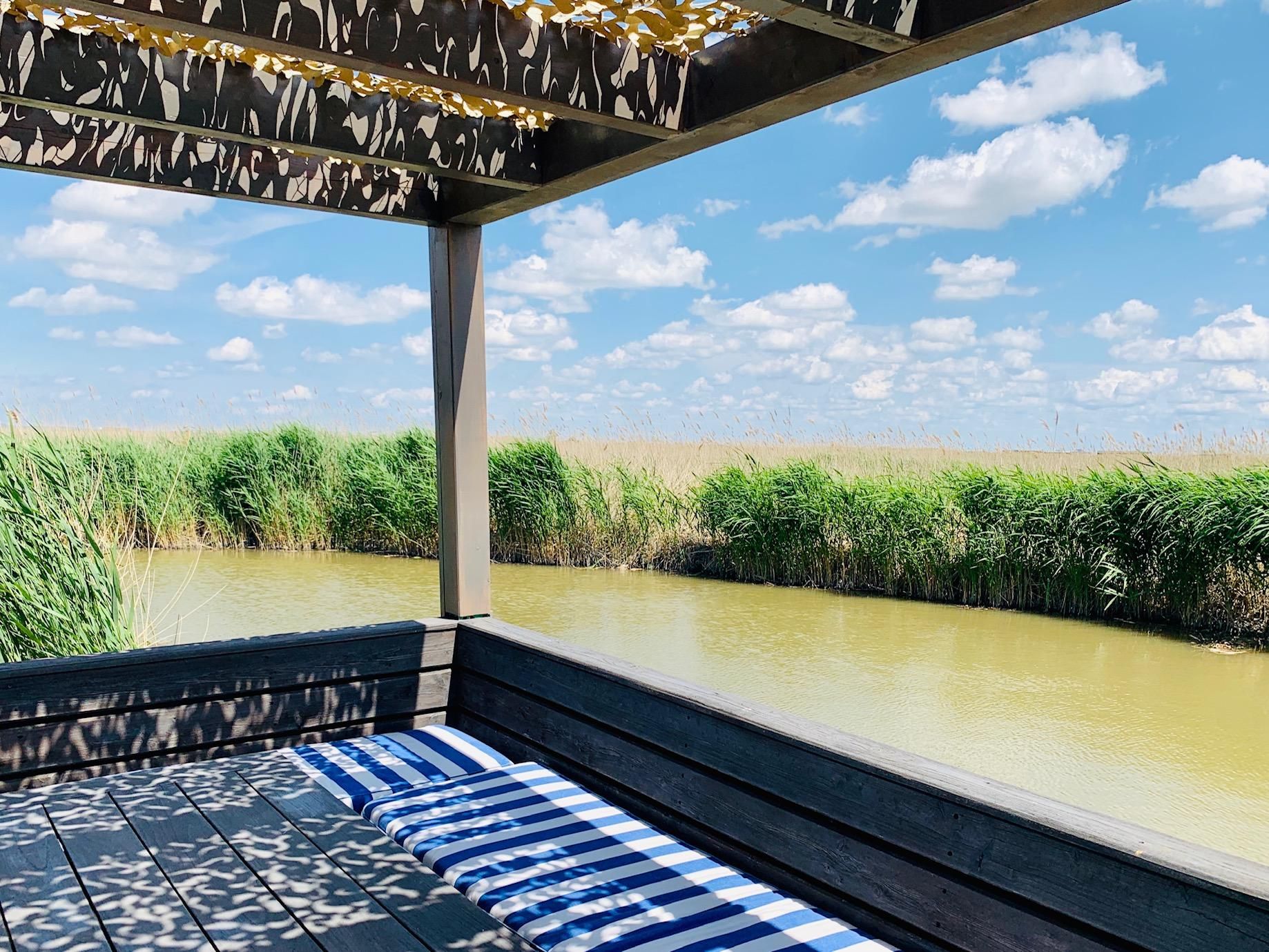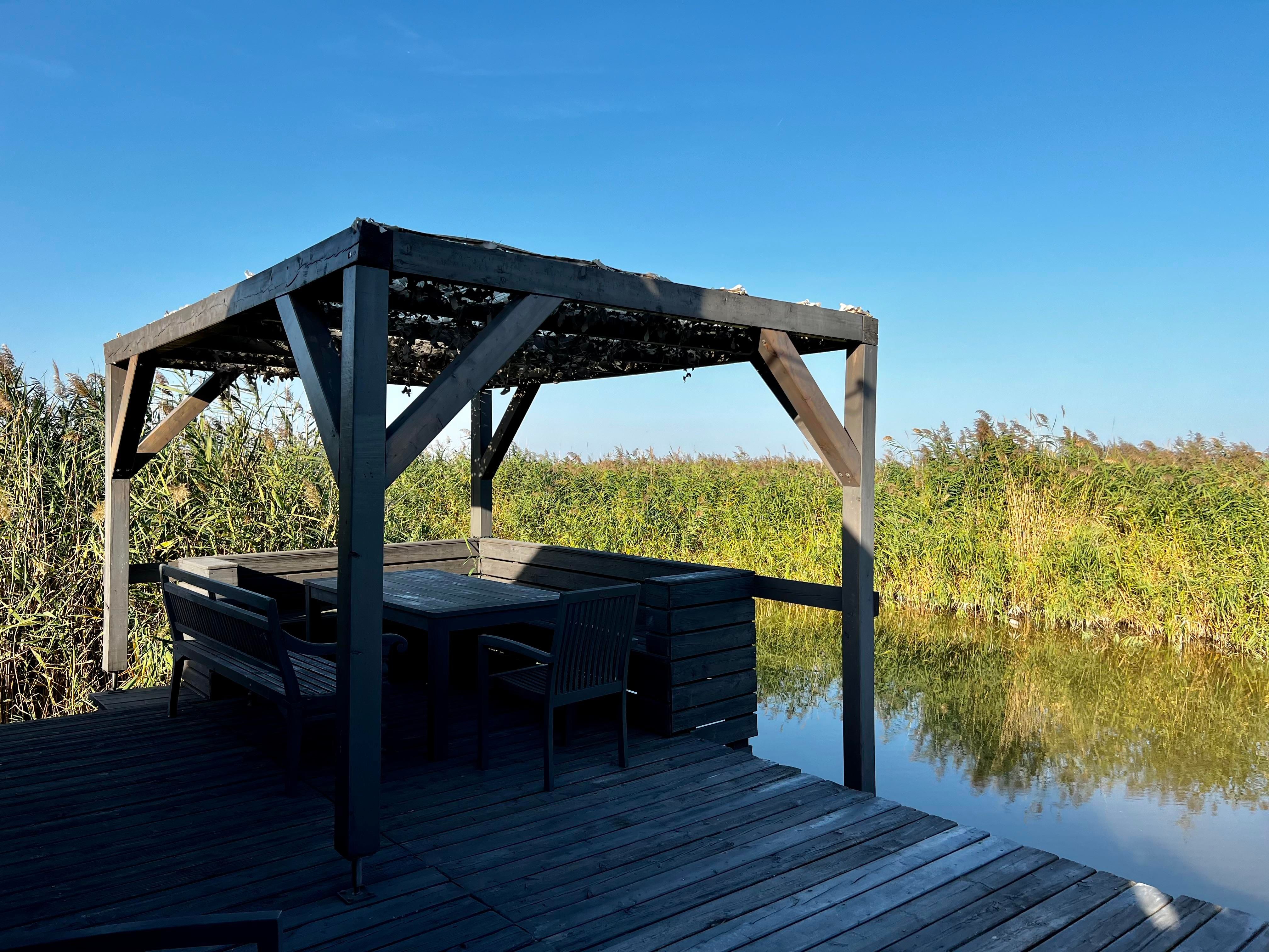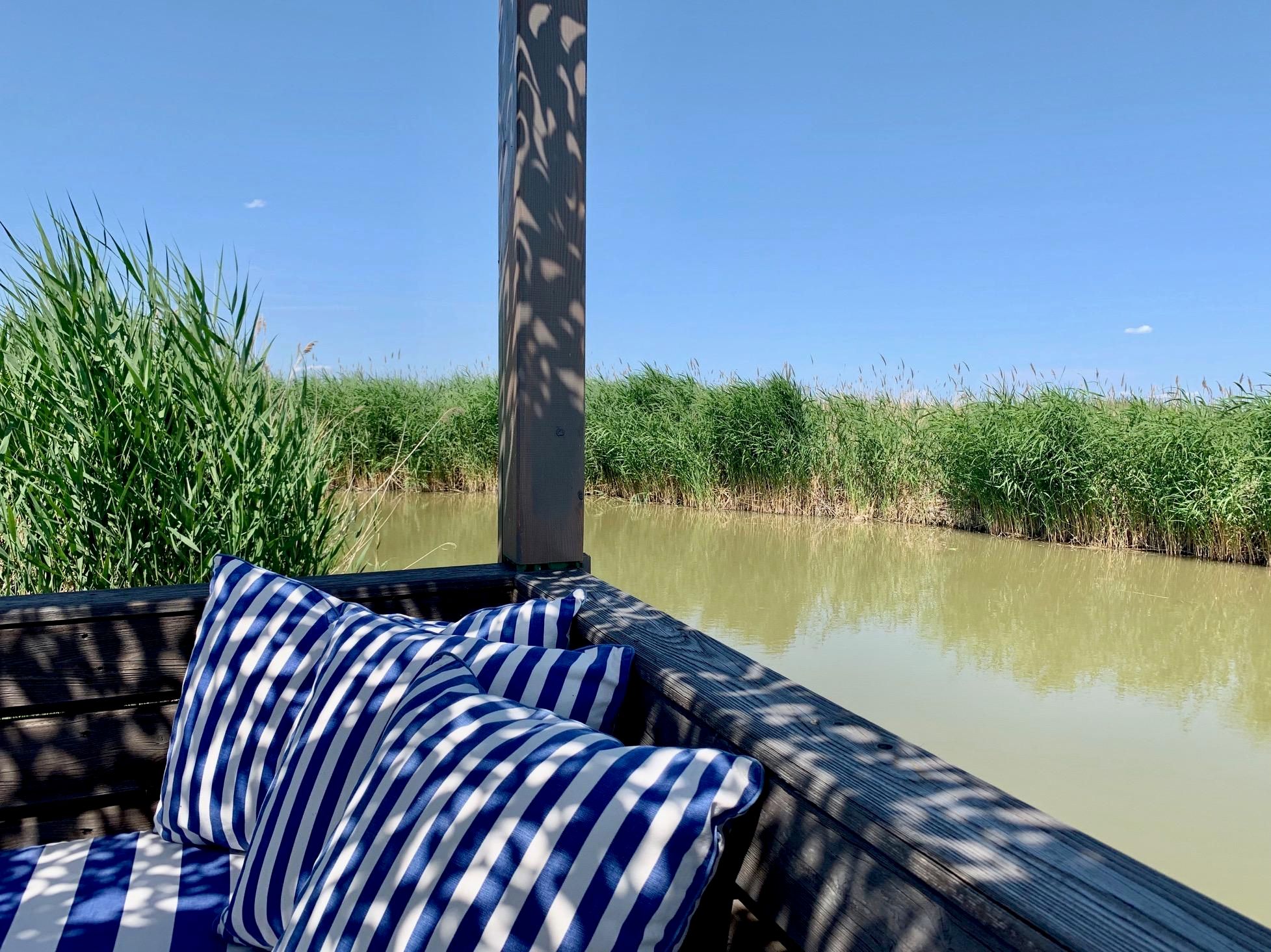 Vor der Hütte gibt es einen großzügigen Schwimmbereich, wobei der gesamte See nicht sehr tief ist. Ein großes Sonnendeck mit gepolsterten Auflagen lädt zum Sonnenbaden und Entspannen ein. Neben dem großen Esstisch in der Hütte haben Sie auch Draußen auf der Terrasse, unter einem schattigen Segel, eine Eckbank mit Esstisch direkt über dem Wasser. Die Hütte liegt mitten im Naturschutzgebiet und ist von Wasser und Schilf umgeben. Der Neusiedler See und die Ruster Altstadt gehören zum UNESCO Weltkulturerbe. Damit misst die UNESCO der Kulturlandschaft Neusiedler See einen außergewöhnlichen Wert für die gesamte Menschheit bei.