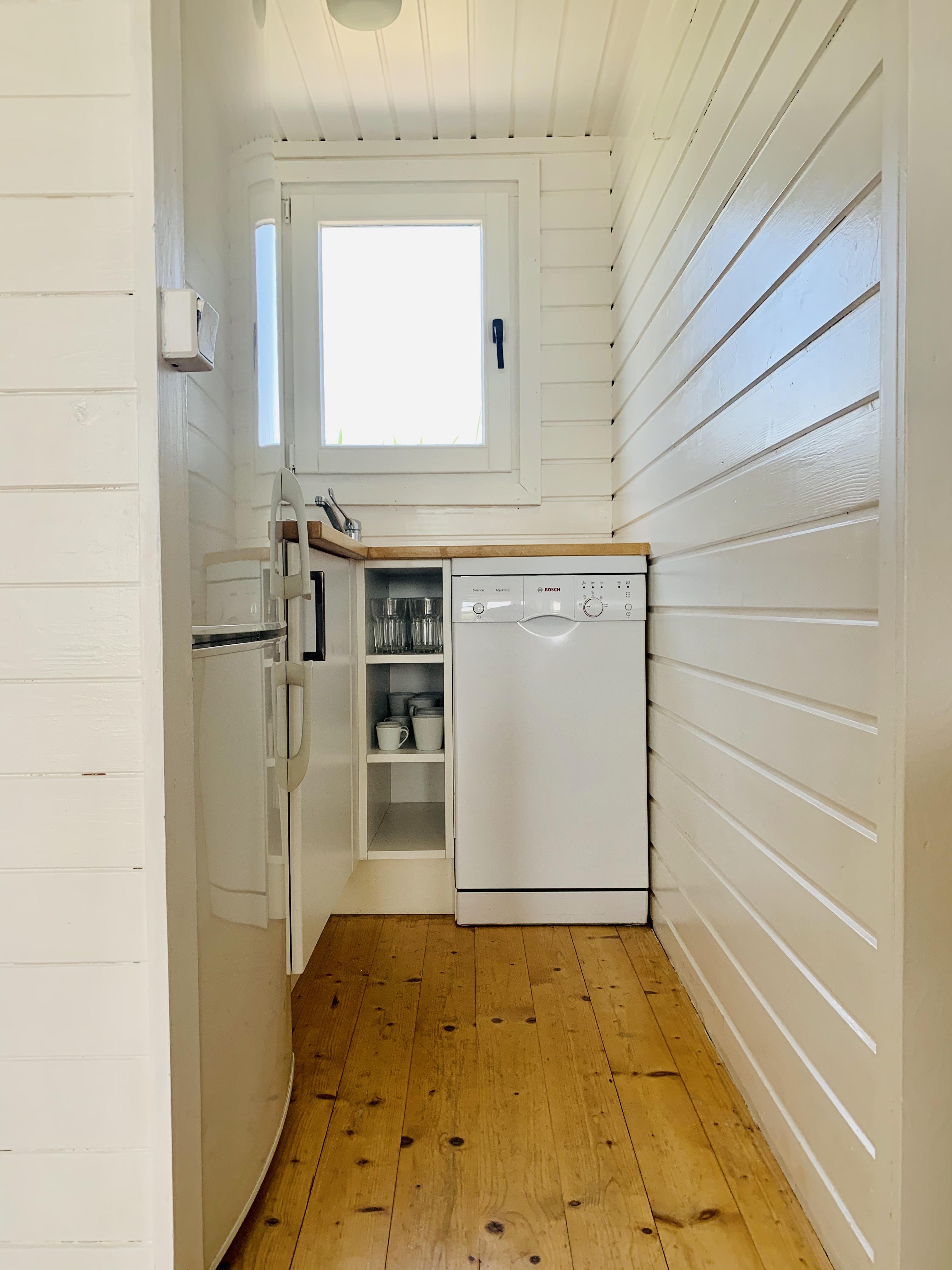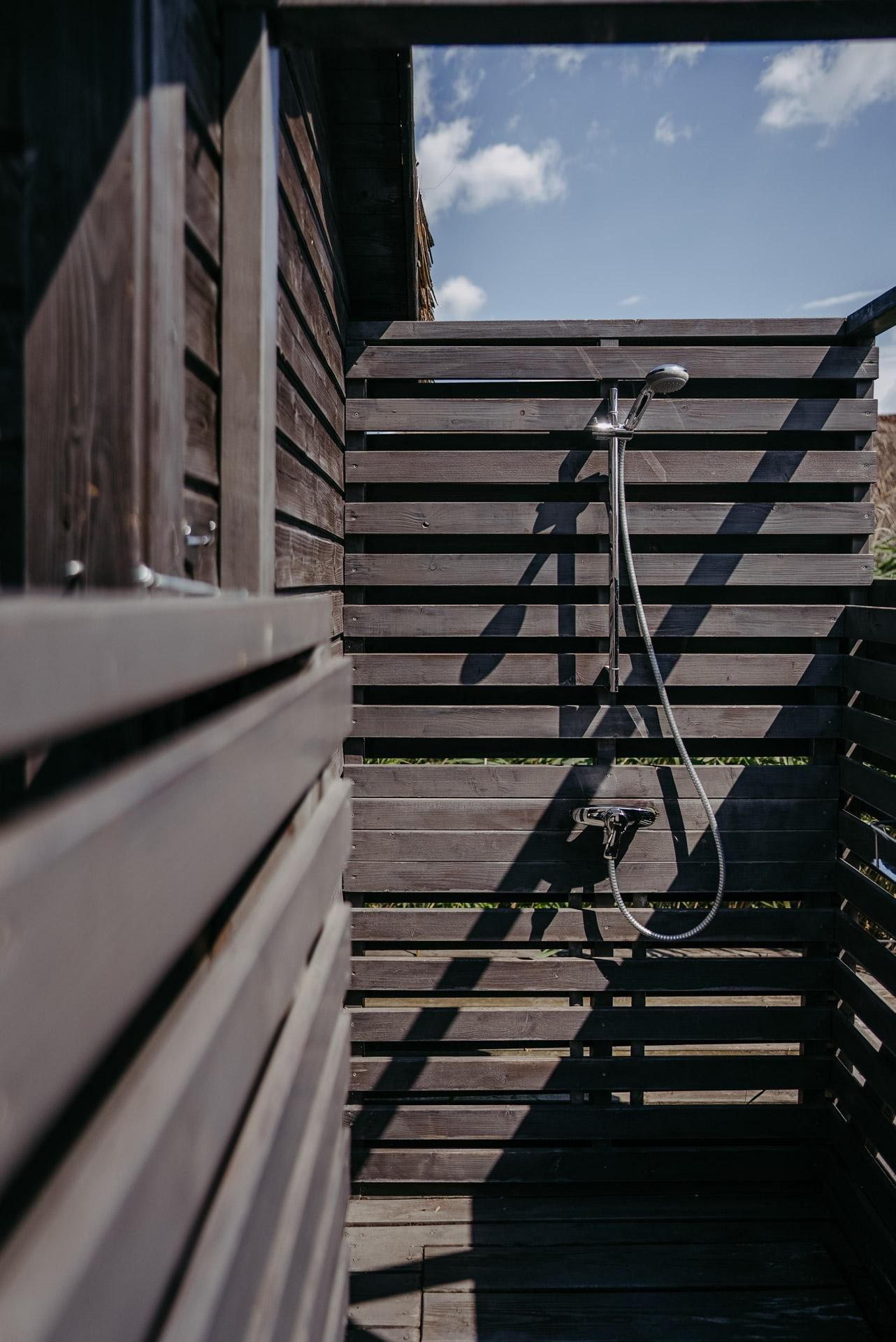 Eine kleine Küche mit Herd, Geschirrspülmaschine, Kühlschrank, Tiefkühlschrank und eine Nespresso Maschine sind vorhanden. WC und Bad mit Waschbecken befinden sich in der Hütte. Zum Duschen haben wir - ganz im Glamping Stil - eine Outdoor Dusche mit Warmwasser, wo Sie im Freien duschen können. Bitte beachten Sie, dass die Dusche und Größe der Hütte trotz allem, eher an einen Segel oder Camping Urlaub erinnern und das Platzangebot in der Hütte recht beschränkt ist.