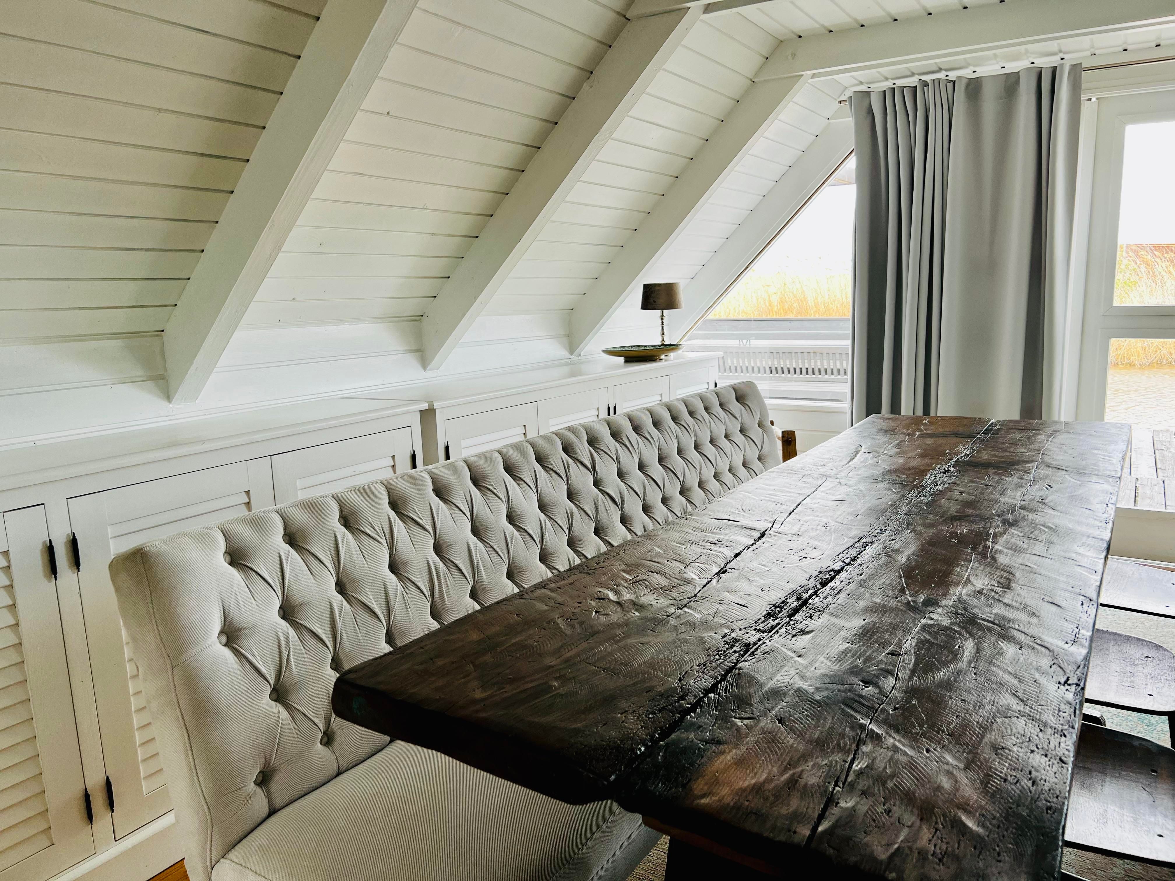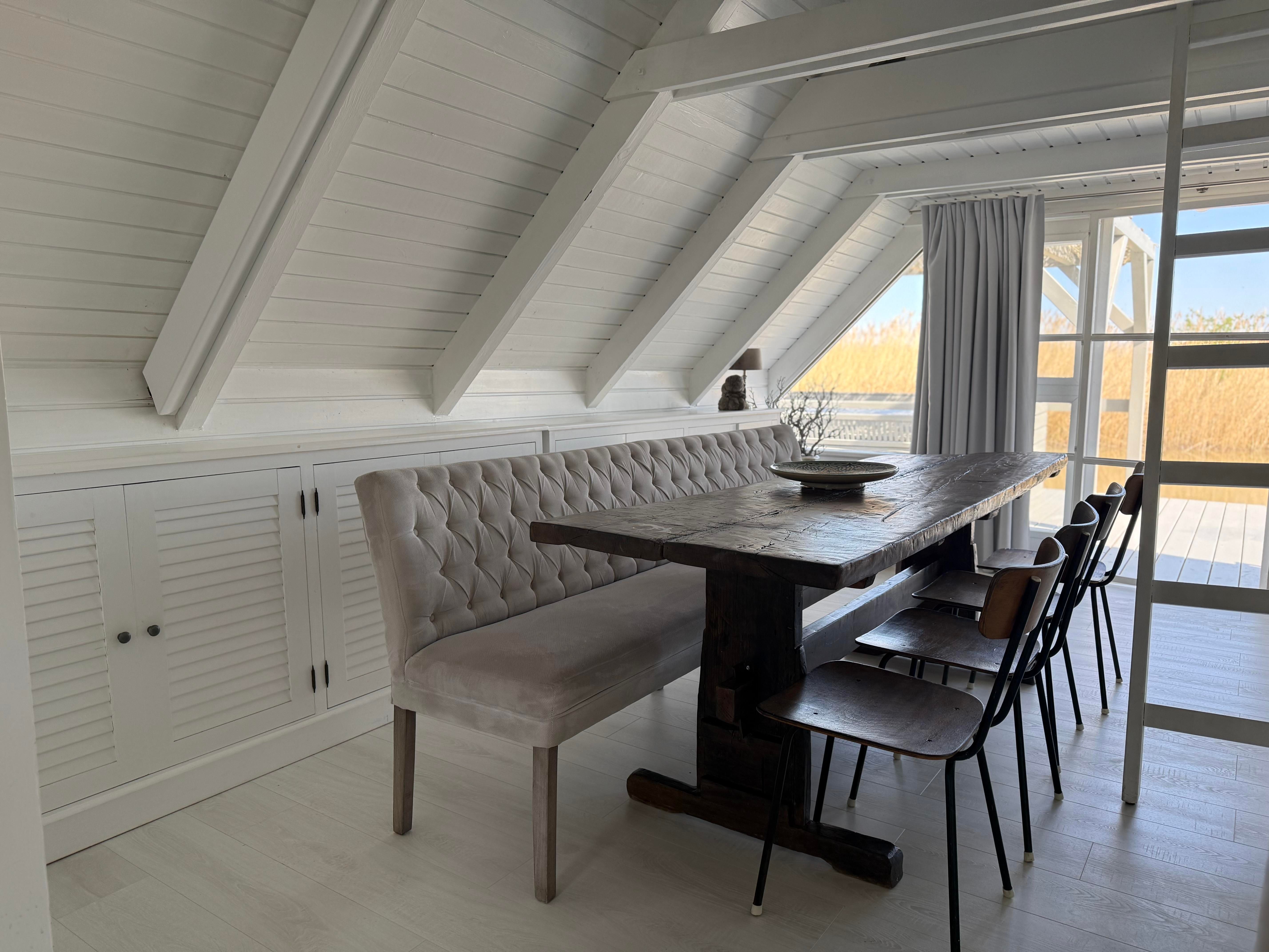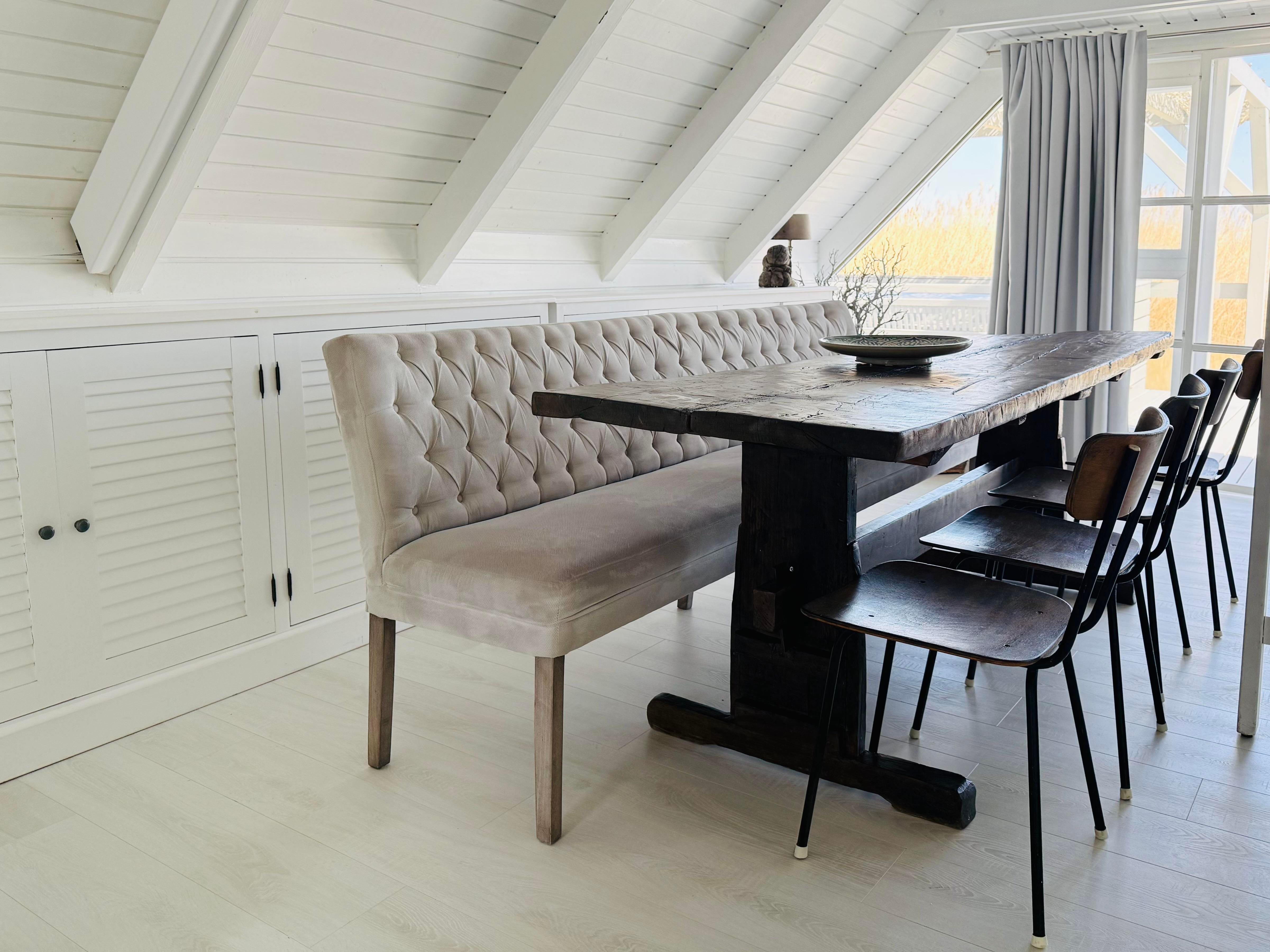 Eine kleine Küche mit Herd, Geschirrspülmaschine, Kühlschrank, Tiefkühlschrank und eine Nespresso Maschine zählen zur Ausstattung der Seehütte Neusiedler See. WC und Bad mit Waschbecken befinden sich in der Hütte. Zum Duschen haben wir - ganz im Glamping Stil - eine Outdoor Dusche mit Warmwasser, wo Sie im Freien duschen können. Bitte beachten Sie, dass die Dusche und Größe der Hütte trotz allem, eher an einen Segel oder Camping Urlaub erinnern und das Platzangebot in der Hütte recht beschränkt ist. Wer so einen Urlaub bucht, bucht bewusst das Reduzierte und Einfache und keinen Luxus Urlaub. Die Einrichtung für die Seehütte haben wir übrigens in aller Welt entdeckt. Alte Teak Bänke aus Bali, ein schöne Truhe aus Indien und ein wundervoller Esstisch, der aus einem alten Weinkeller im Burgenland stammt.