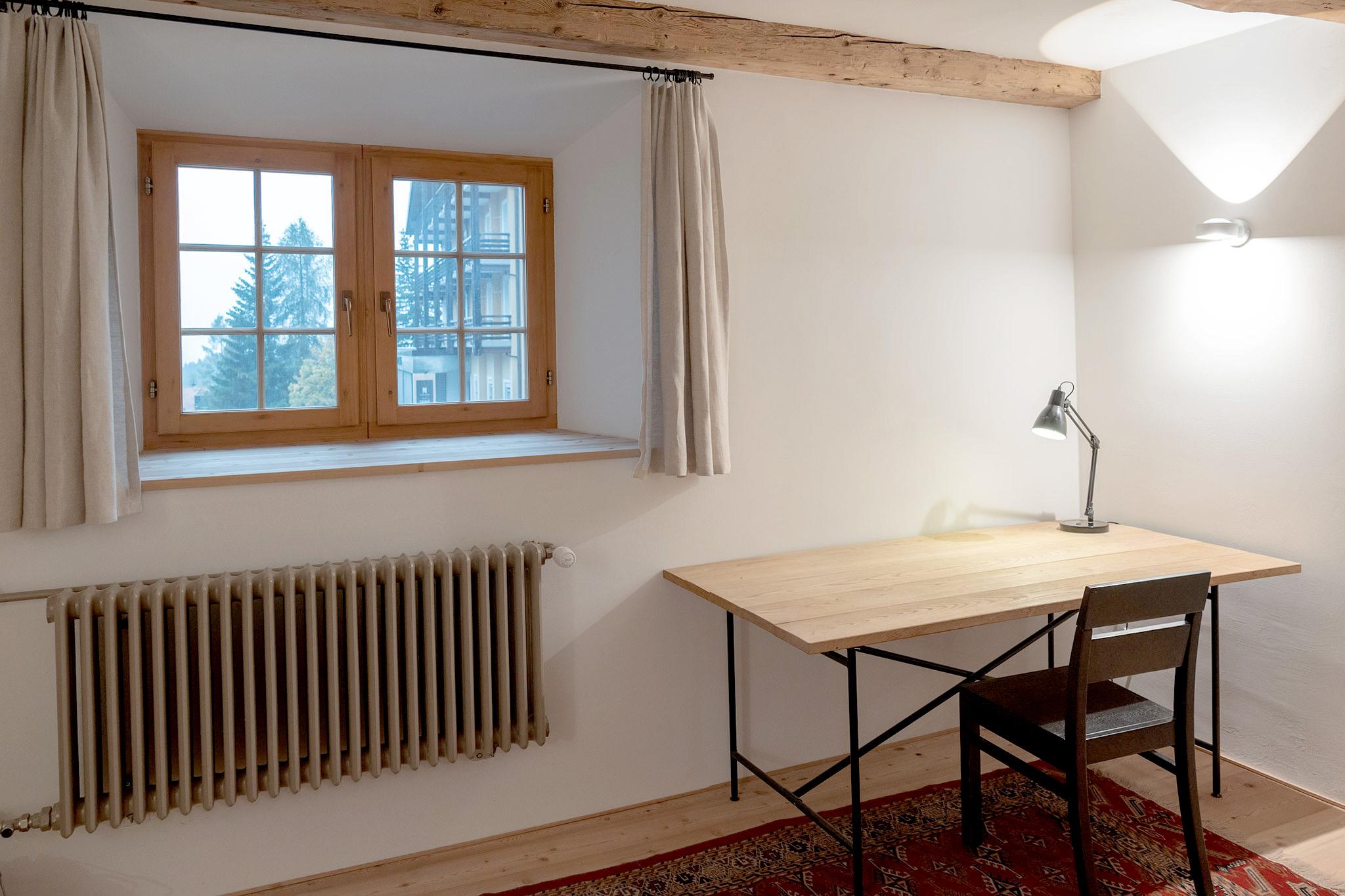 Eine aussergewöhnliche Wohnung, frisch renoviert, alt und neu originell kombiniert in Bündnerstil. Dicke Steinmauern und Holzwände mit Einritzungen erinnern an die frühere Nutzung als Säumerschenke. Grosszügige Zimmer, mit je einem Doppelbett / grosses, gemütliches Wohnzimmer mit Esstisch und Sitzgruppe / separate Küche mit italienischer Küchenzeile, Nespressomaschine / Bad/WC mit Badewanne/Dusche, Haarfön / grosser Flur mit Garderobe / Loggia / Gartensitzplatz / Specksteinofen / Ski- und Bikeraum / Waschmaschine und Tumbler / Parkplatz vor dem Haus / WLAN, CD-Player, Fondue- und Racletteset, Spiele, Holzschlitten. Die Wohnung im Hochparterre wurde sorgfältig renoviert, nachhaltig mit natürlichen und regionalen Materialien für ein gesundes Klima.