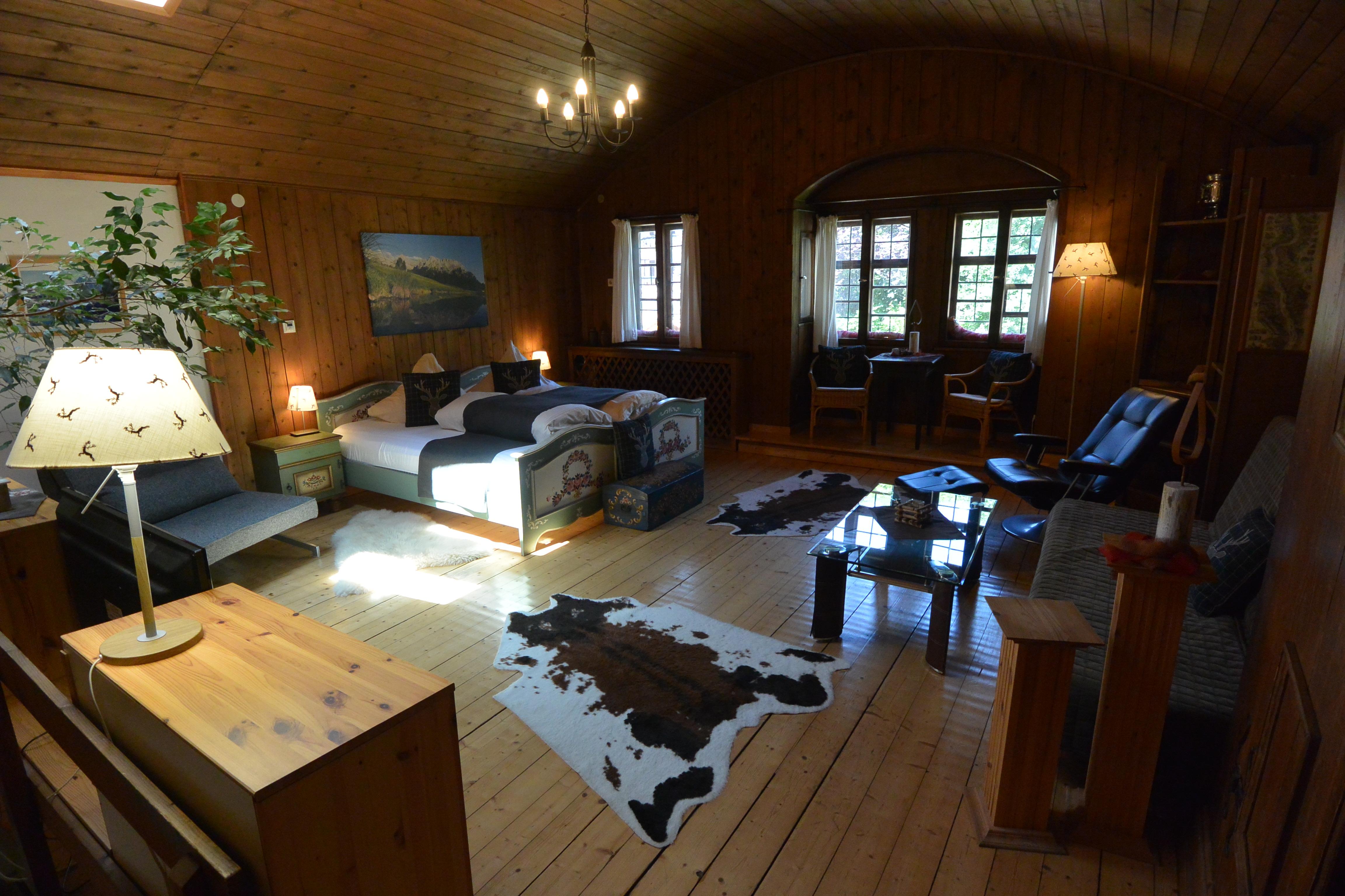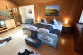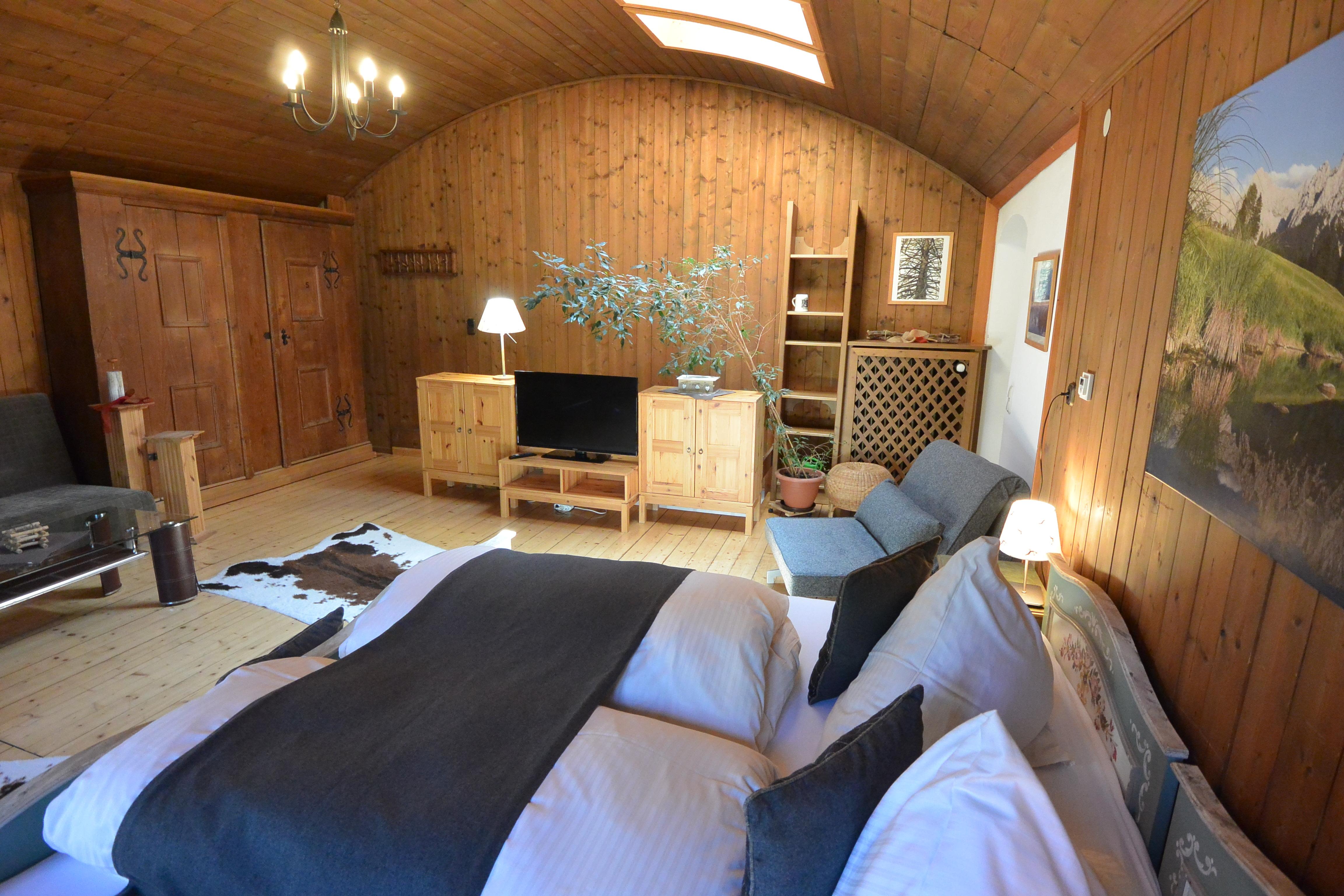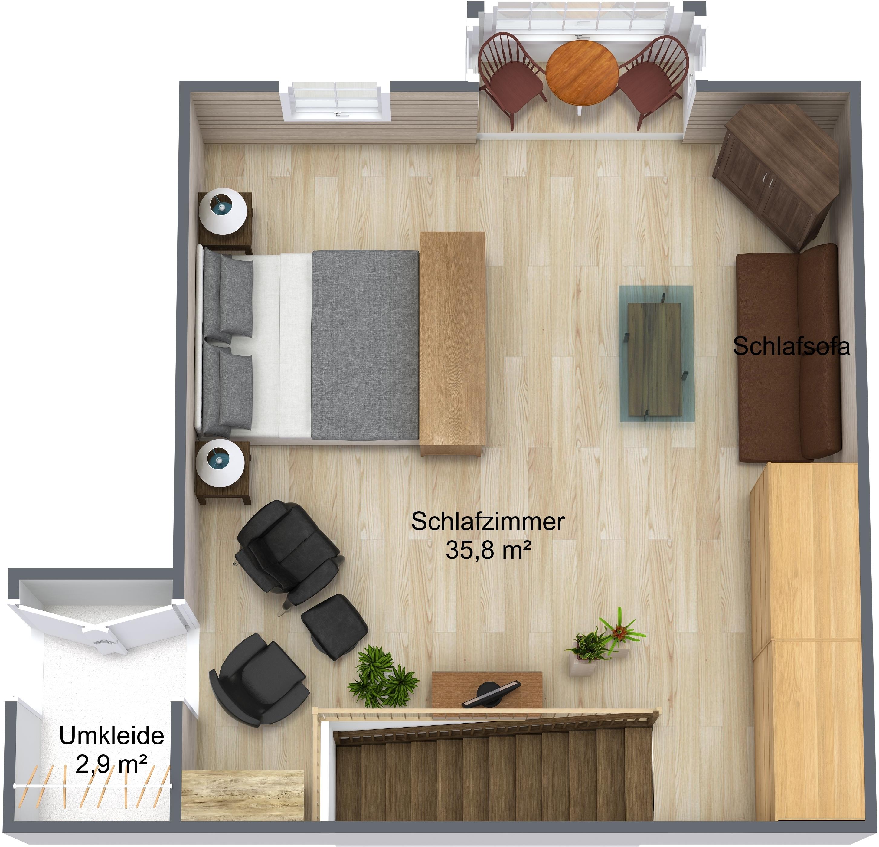 Im ersten Stock erwartet Sie ein großer Wohnschlafraum. Der Wohnbereich verfügt über eine gemütliche Couchgruppe und einen Erker, der für zusätzlichen Charme sorgt. Der Schlafbereich ist optimal abgeteilt und bietet Ihnen Doppelbetten, die bei Bedarf auch getrennt werden können. Ein begehbarer Schrank bietet ausreichend Platz für Ihre Kleidung.