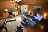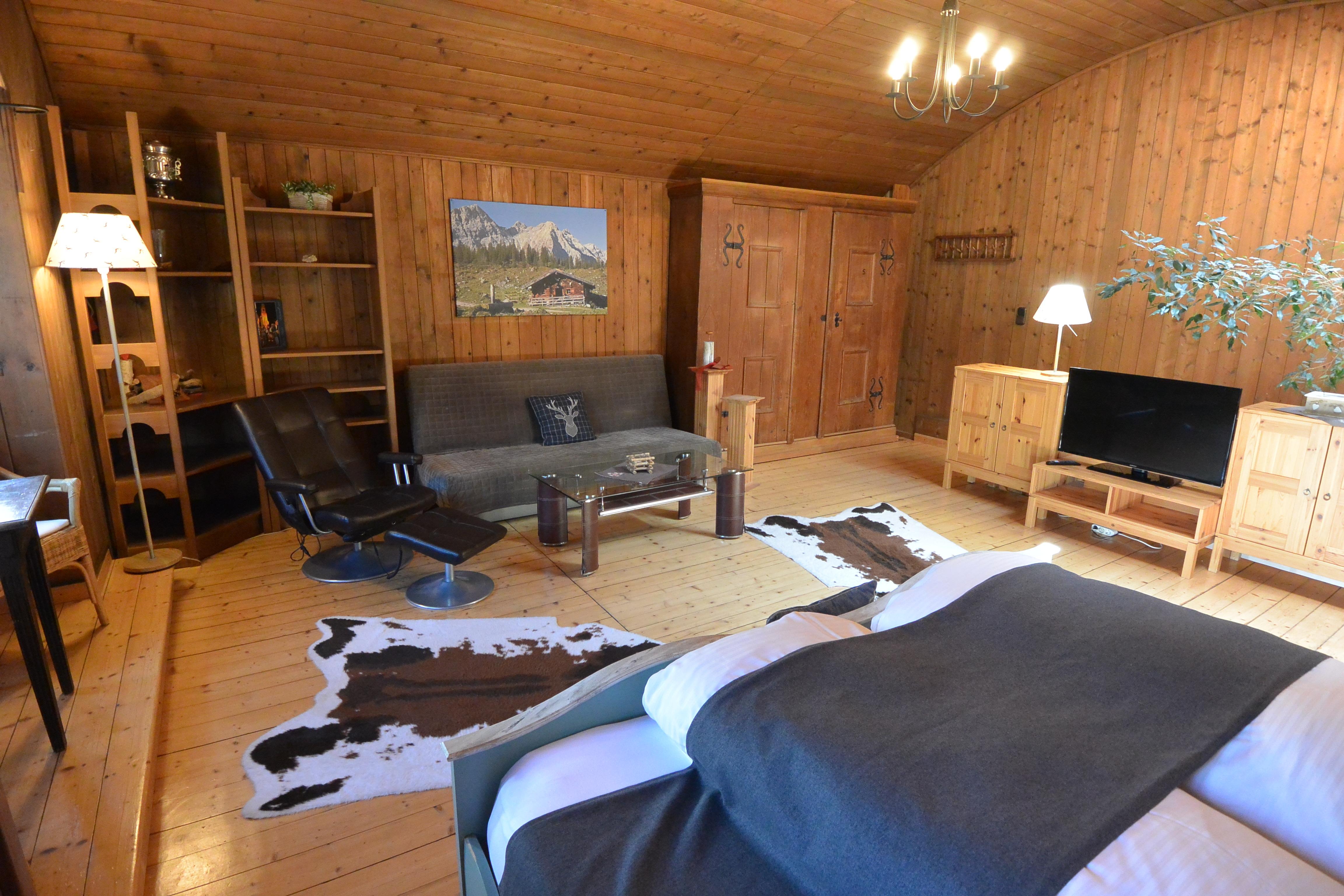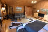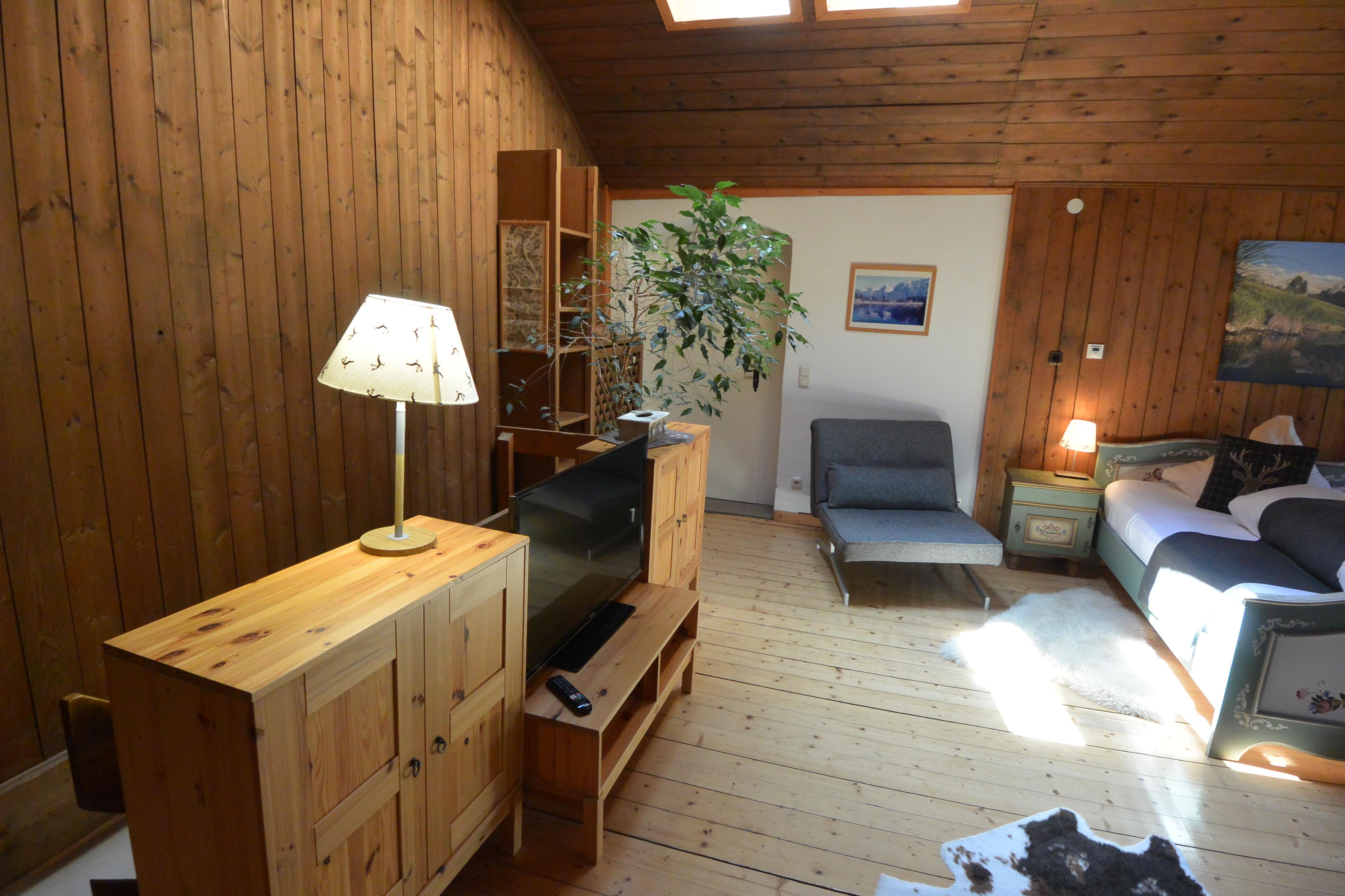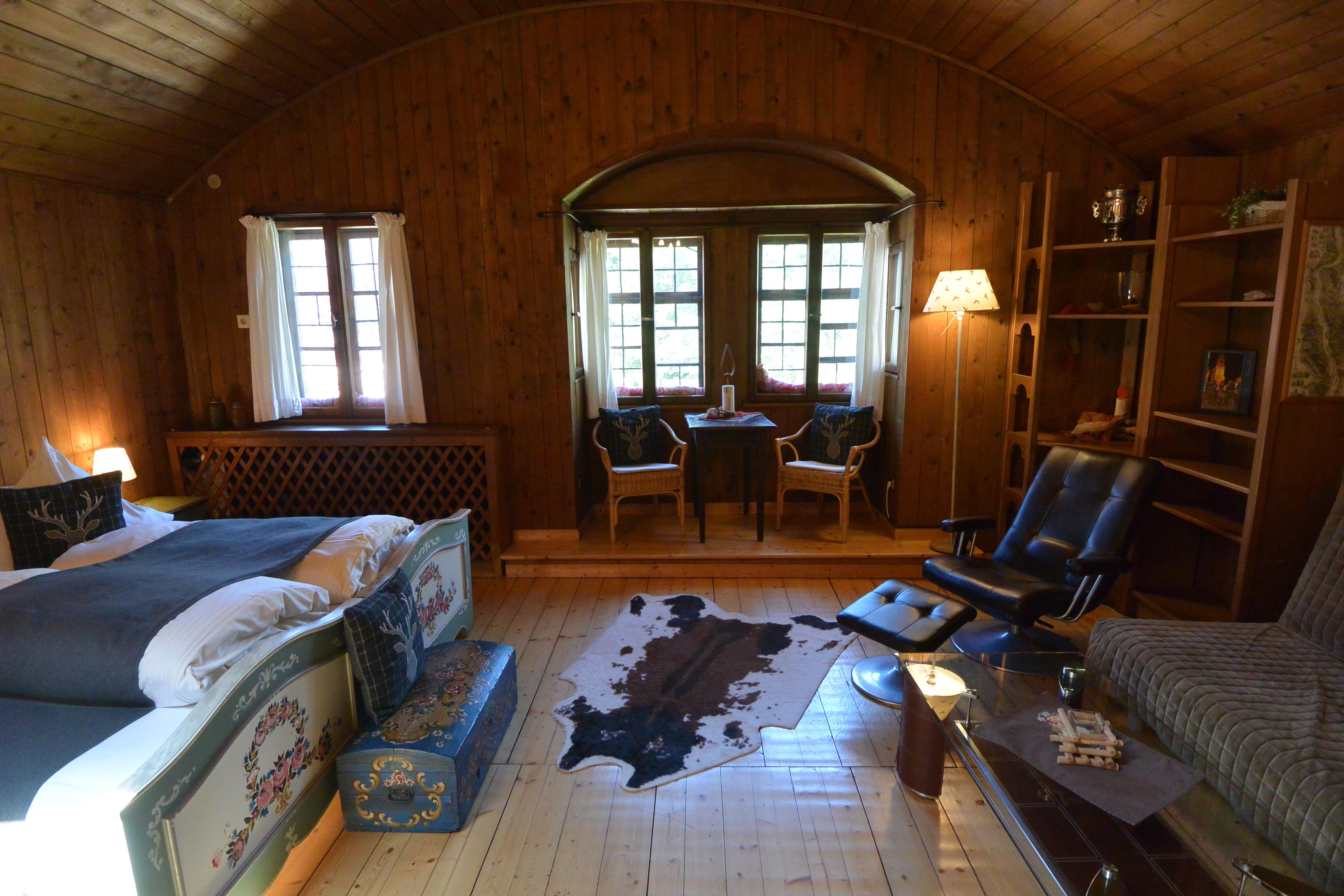 Im ersten Stock erwartet Sie ein großer Wohnschlafraum. Der Wohnbereich verfügt über eine gemütliche Couchgruppe und einen Erker, der für zusätzlichen Charme sorgt. Der Schlafbereich ist optimal abgeteilt und bietet Ihnen Doppelbetten, die bei Bedarf auch getrennt werden können. Ein begehbarer Schrank bietet ausreichend Platz für Ihre Kleidung.