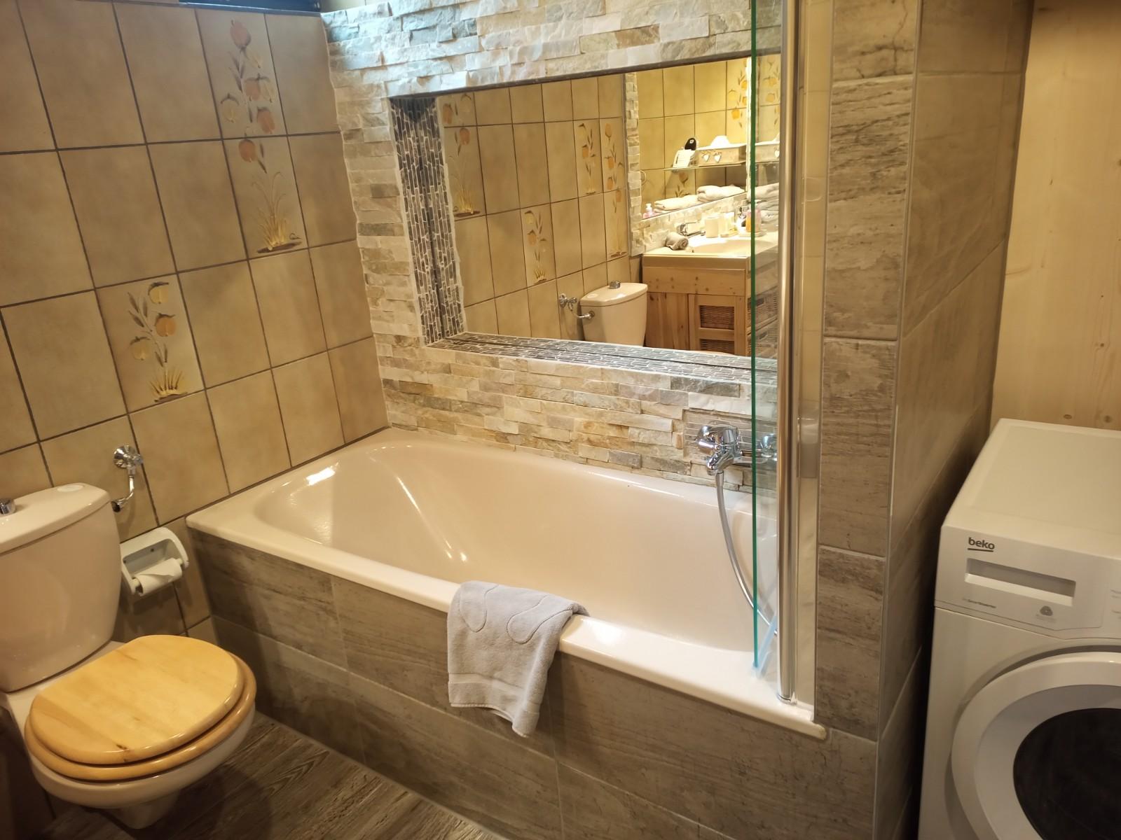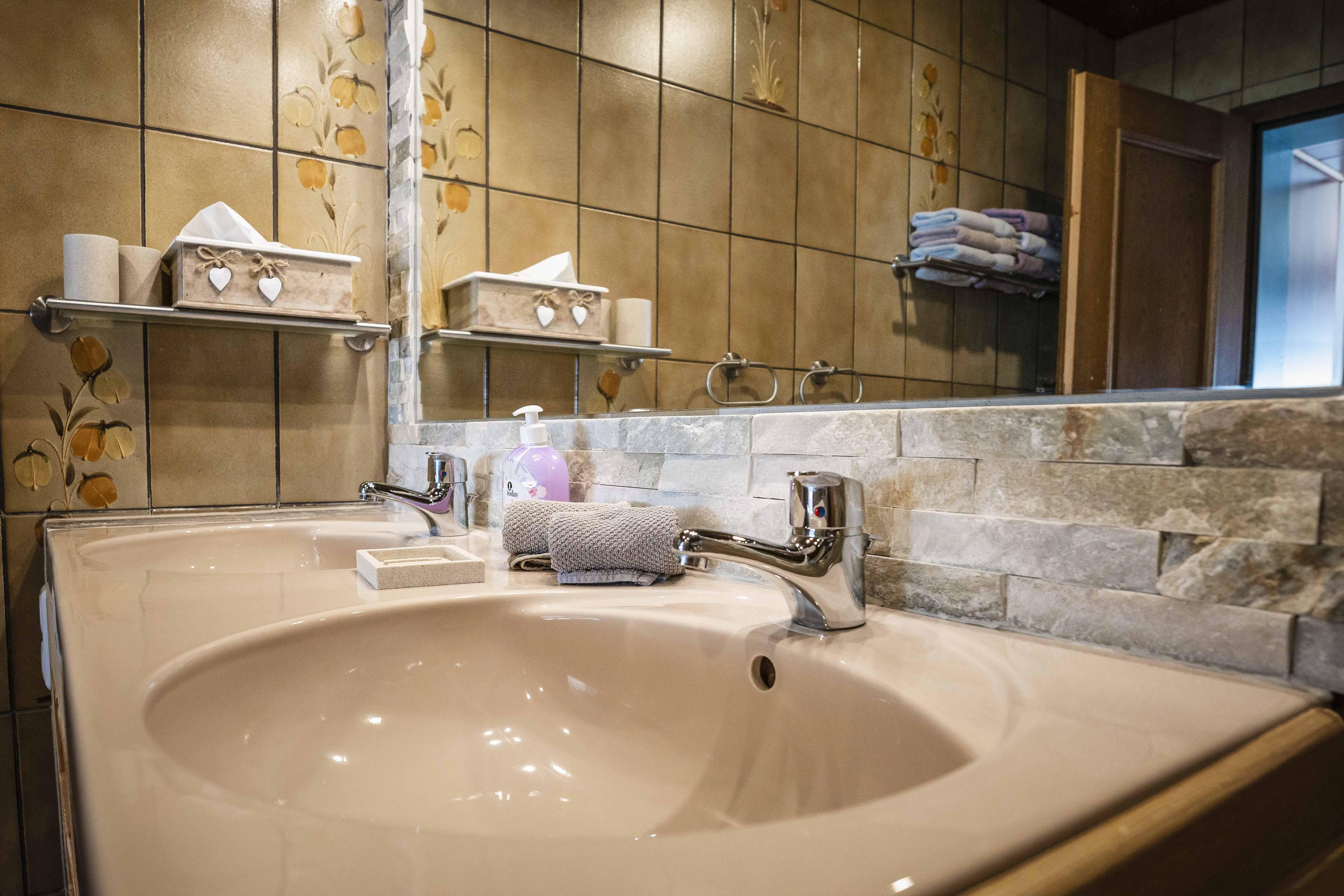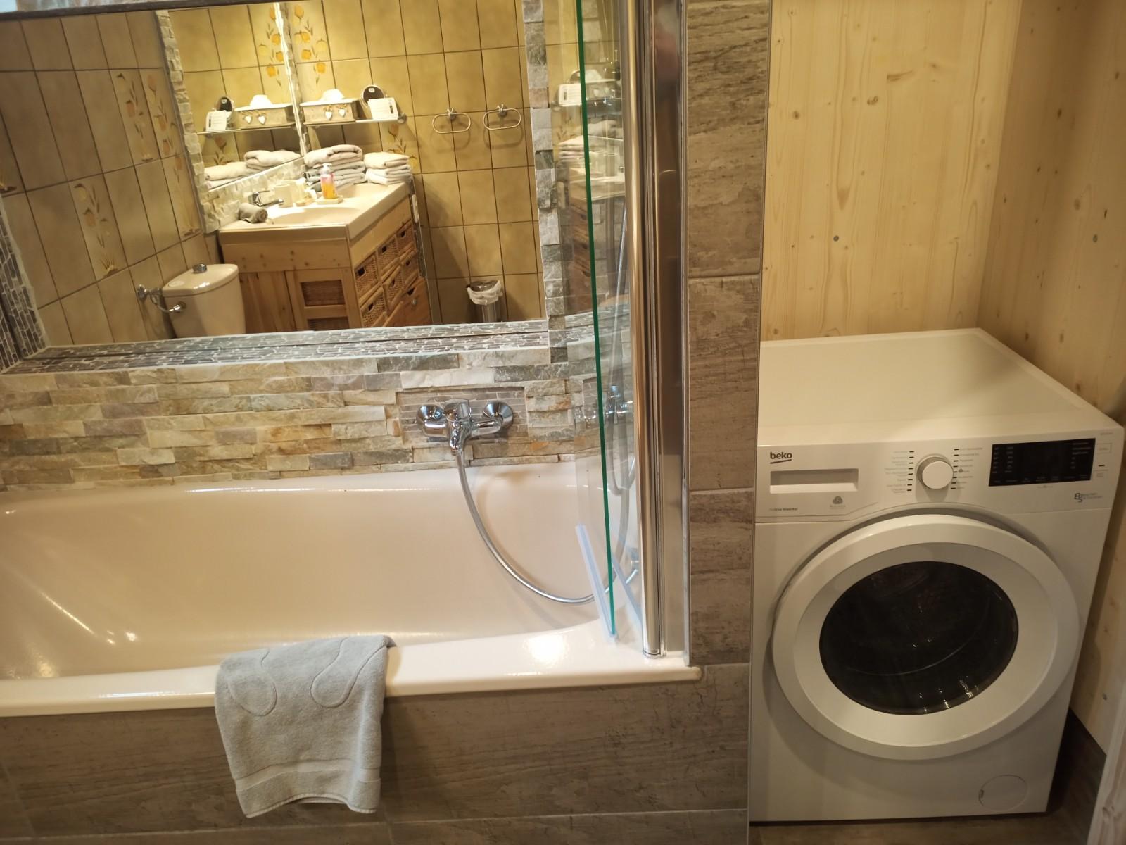 Das Badezimmer der Ferienwohnung Linderspitzblick ist geräumig und verfügt über eine Badewanne sowie zwei Waschbecken. Hier können die Gäste sich nach einem langen Tag in den Bergen erfrischen und entspannen. Handtücher werden gestellt. In der Wohnung befindet sich auch ein zusätzliches Gäste-WC. Im Bad steht eine Waschmaschine mit Trocknerfunktion kostenfrei zur Verfügung.