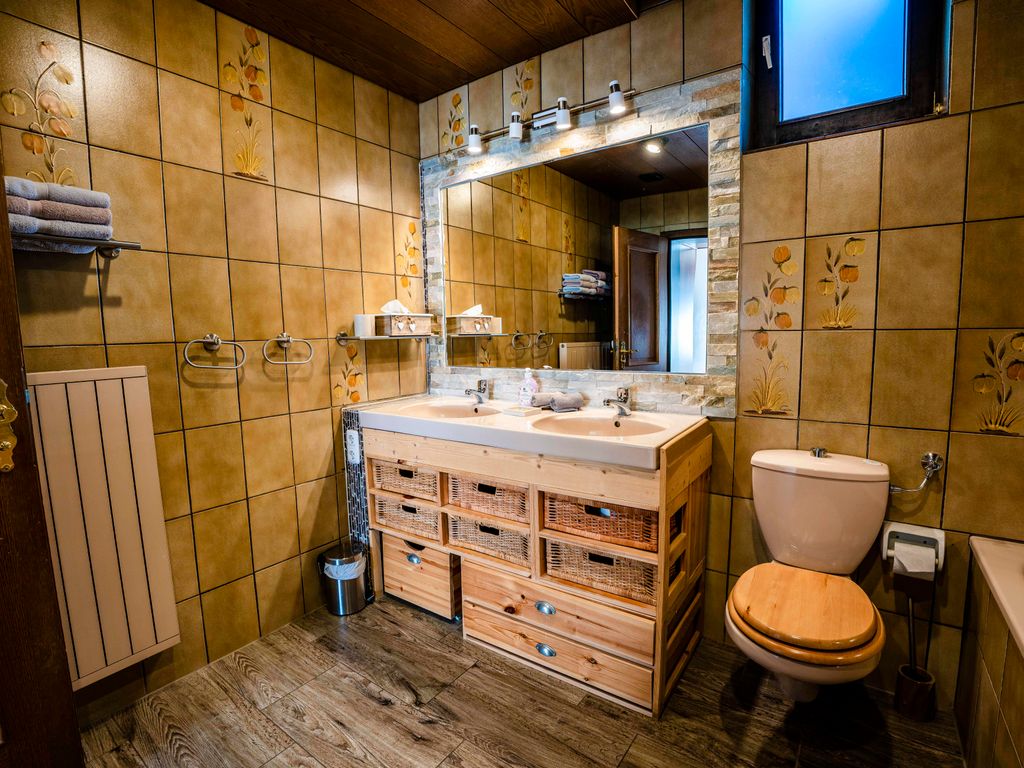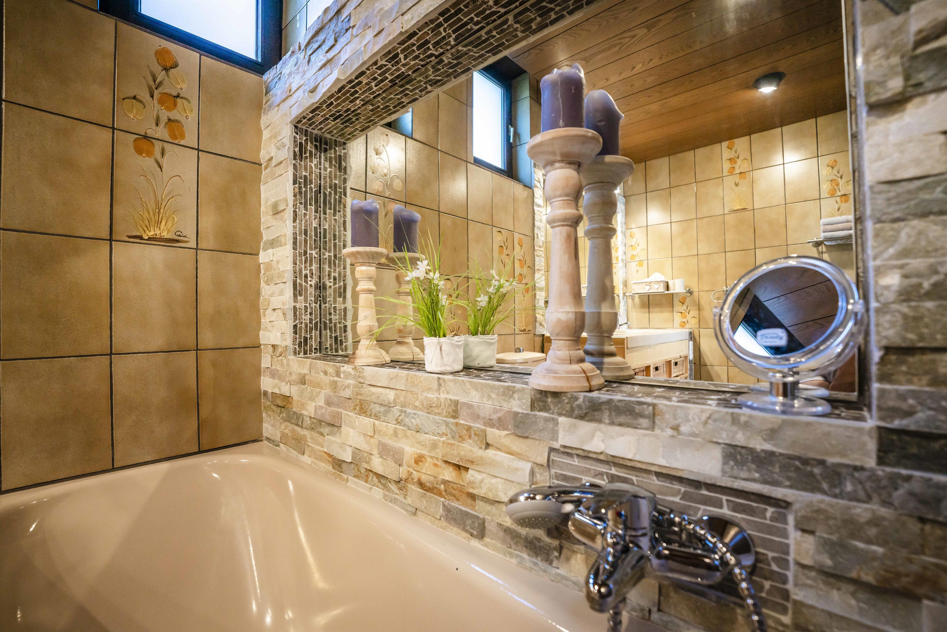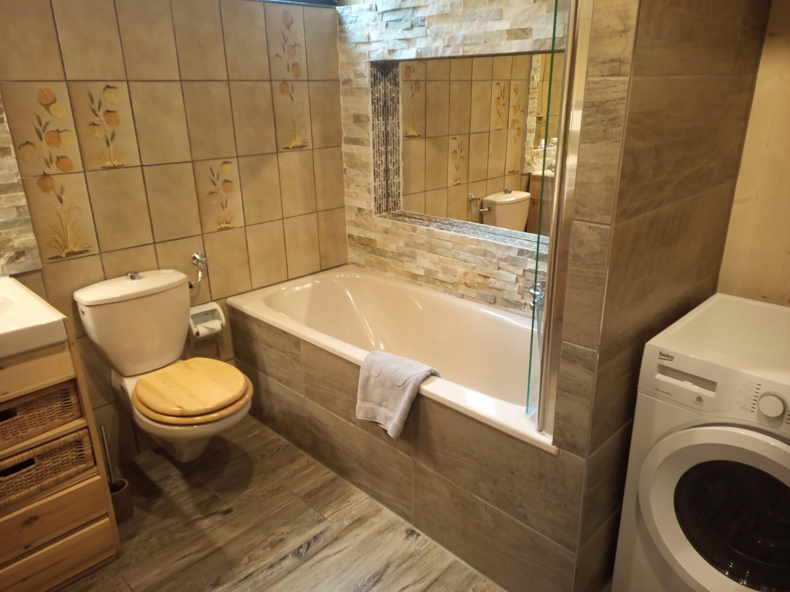 Das Badezimmer der Ferienwohnung Linderspitzblick ist geräumig und verfügt über eine Badewanne sowie zwei Waschbecken. Hier können die Gäste sich nach einem langen Tag in den Bergen erfrischen und entspannen. Handtücher werden gestellt. In der Wohnung befindet sich auch ein zusätzliches Gäste-WC. Im Bad steht eine Waschmaschine mit Trocknerfunktion kostenfrei zur Verfügung.
