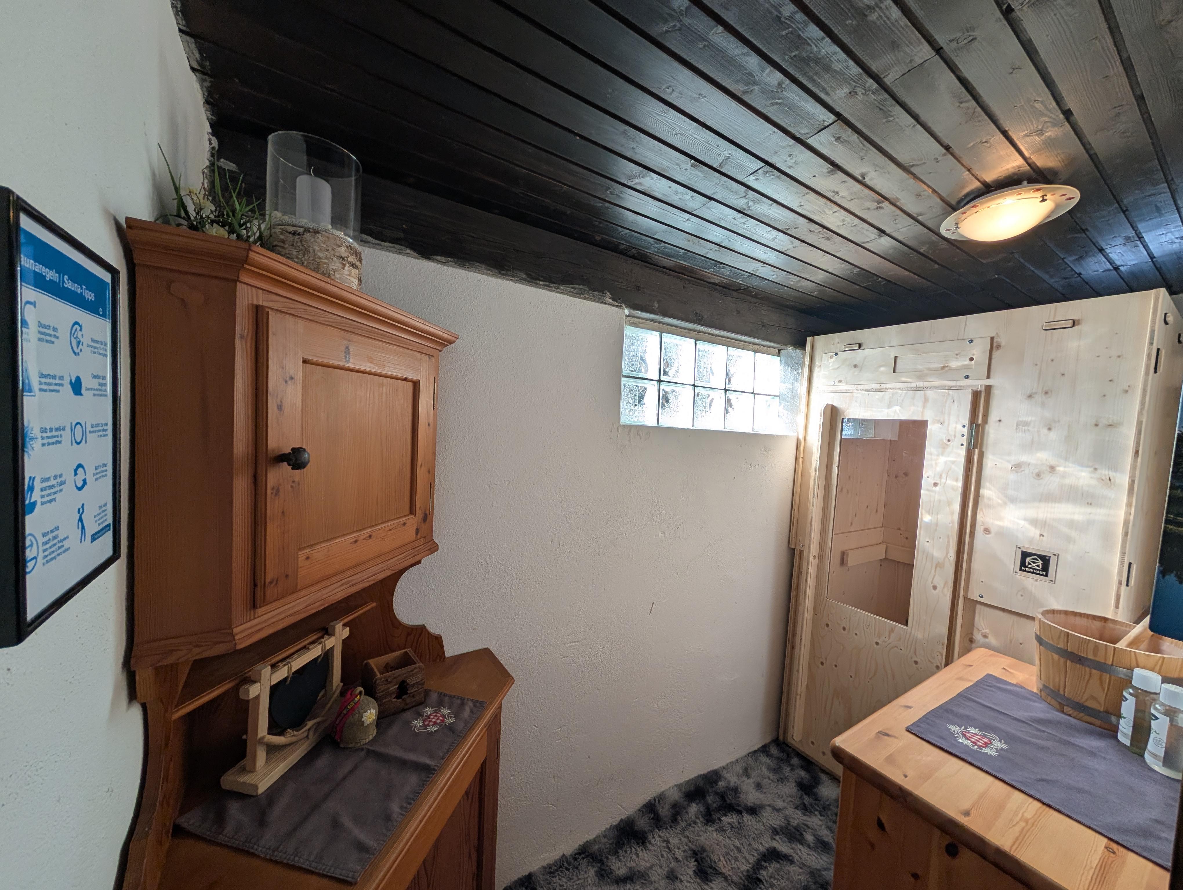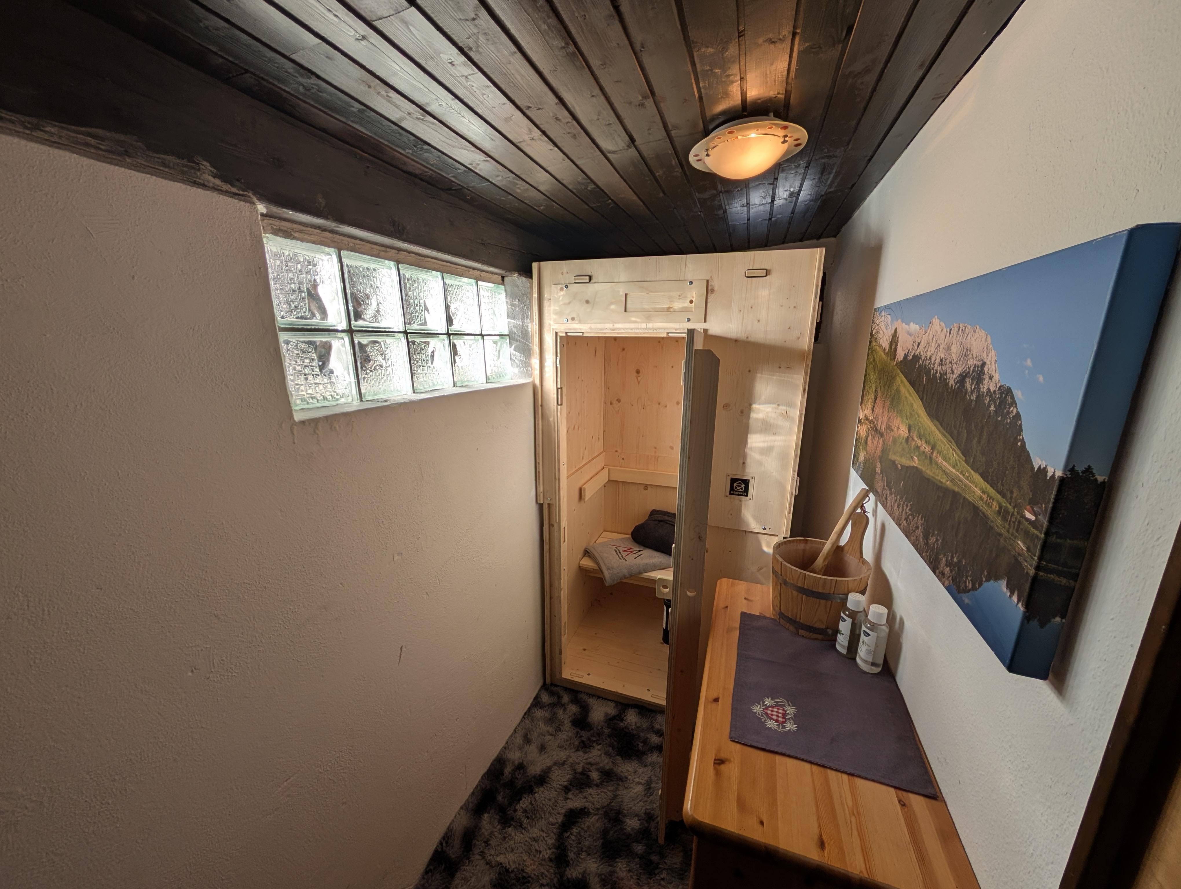 Tauchen Sie ein in pure Entspannung! Unsere neue Indoorsauna ist Ihr persönlicher Rückzugsort nach einem erlebnisreichen Tag in den Alpen. Genießen Sie wohltuende Wärme in modernem Design, umgeben von einer gemütlichen und privaten Atmosphäre.