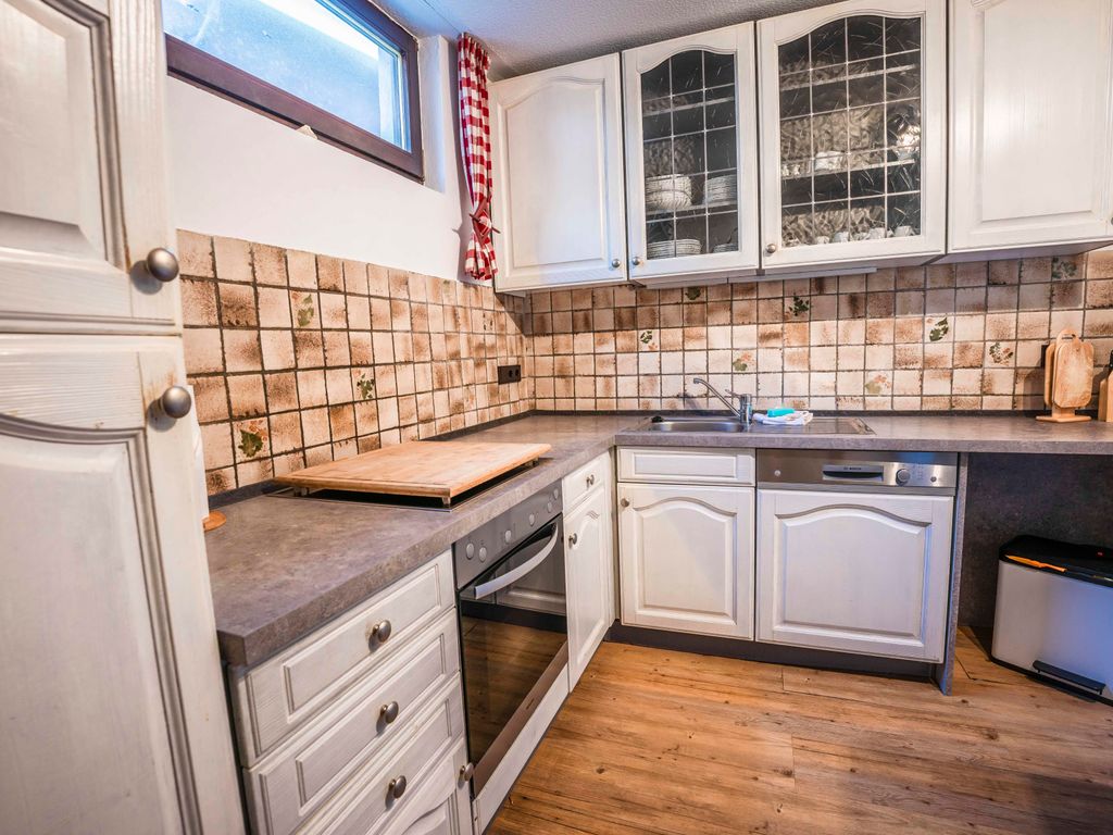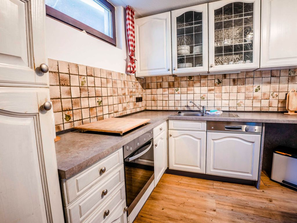 Die vollausgestattete Küche der Ferienwohnung Linderspitzblick bietet alles, was man für die Zubereitung von Mahlzeiten benötigt. Ein Standkühlschrank sorgt dafür, dass Lebensmittel frisch gehalten werden können. Hier können die Gäste ihre Lieblingsgerichte zubereiten und gemeinsam am Esstisch genießen.