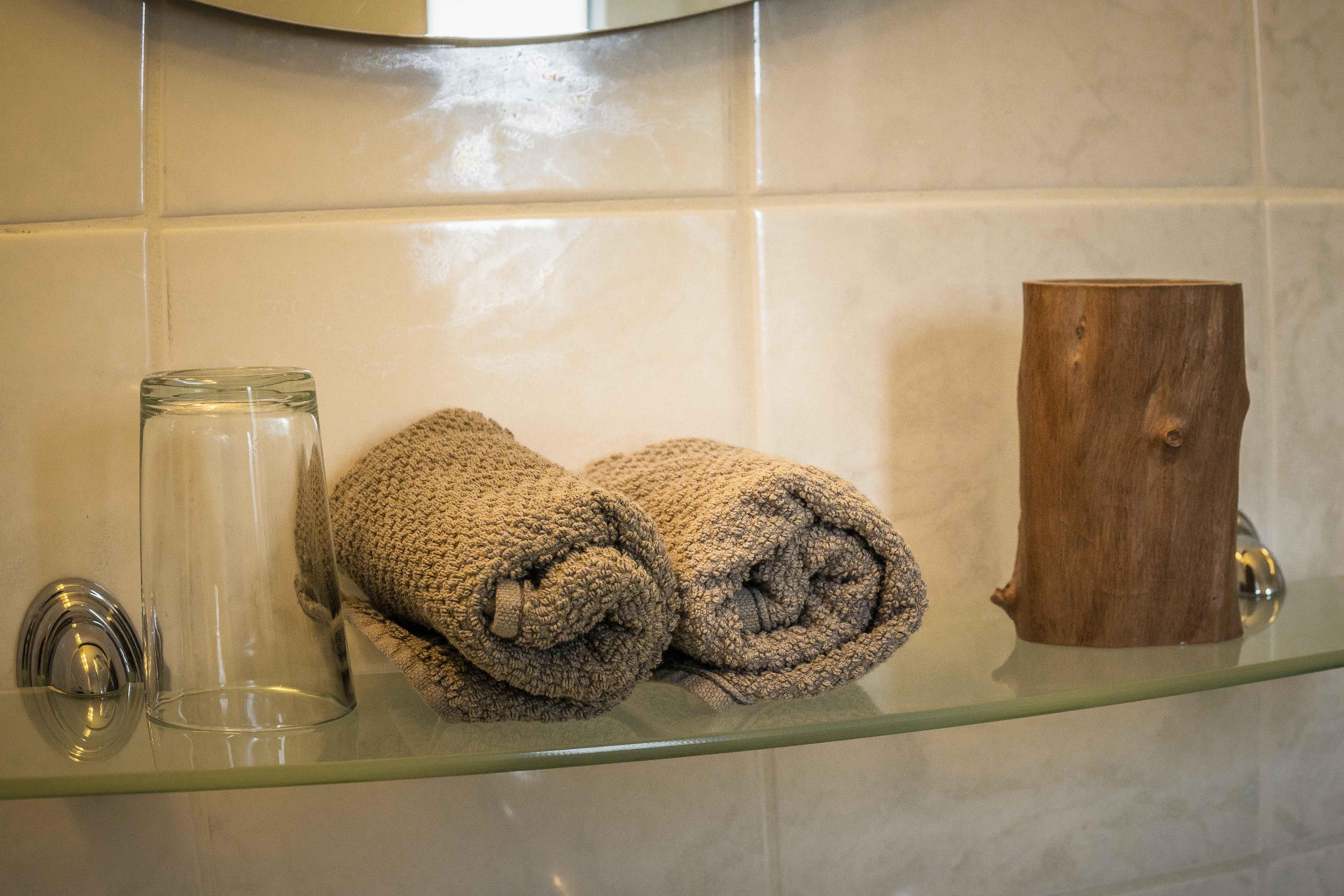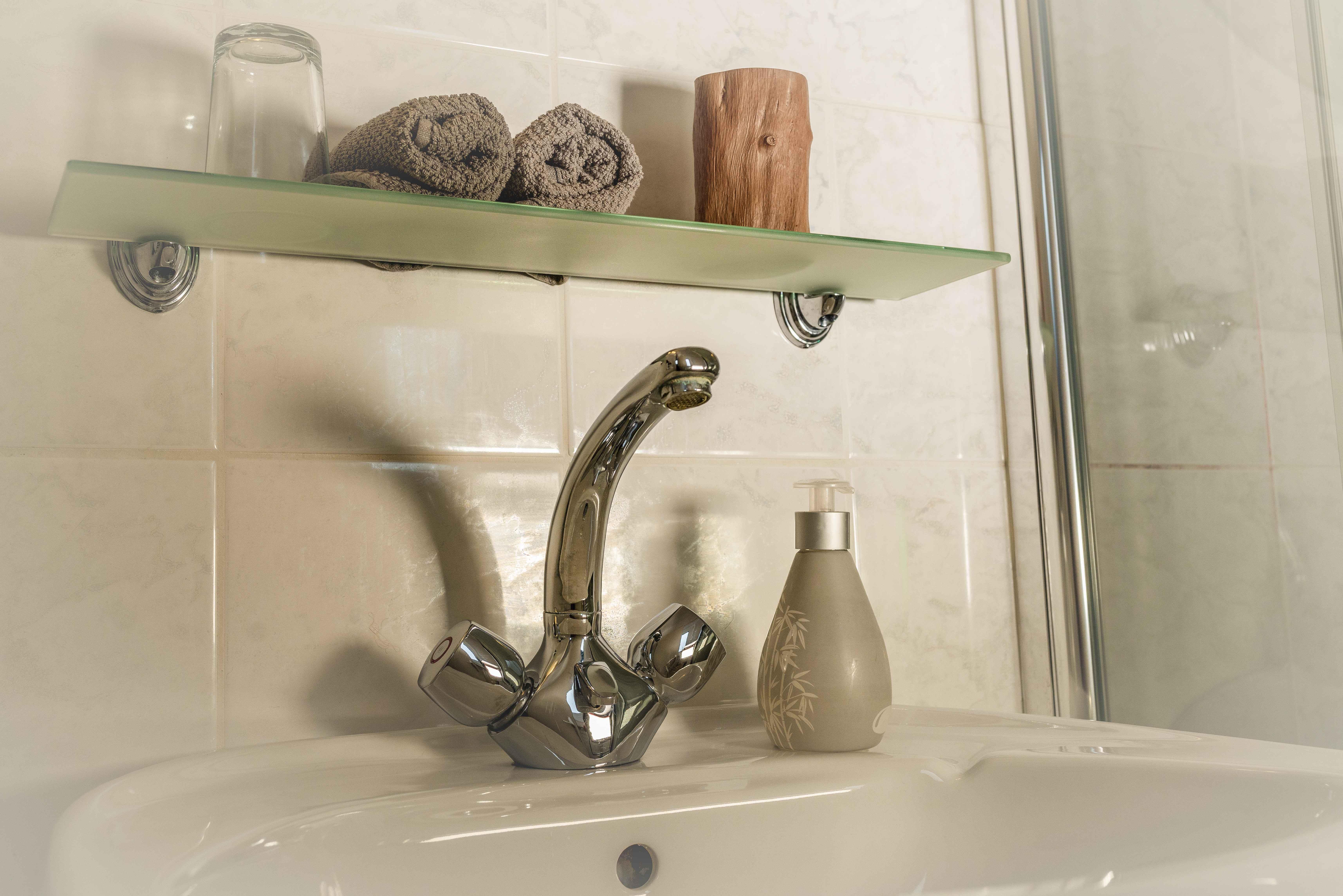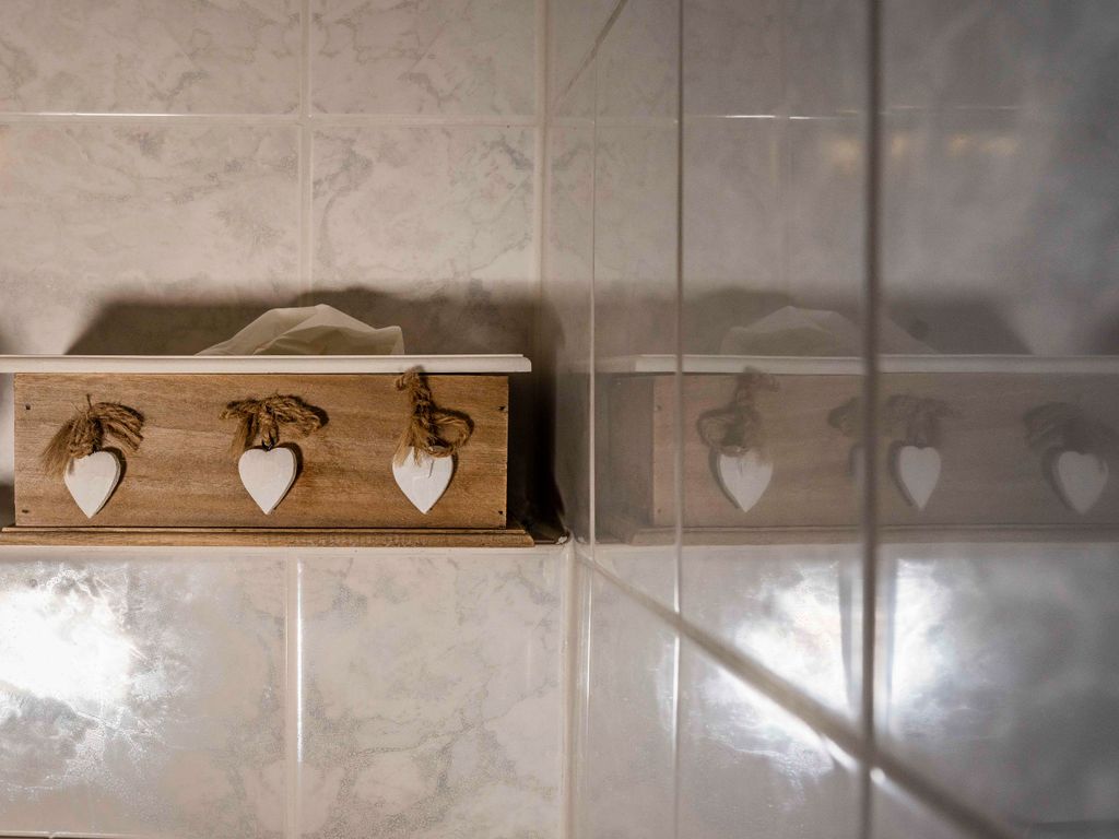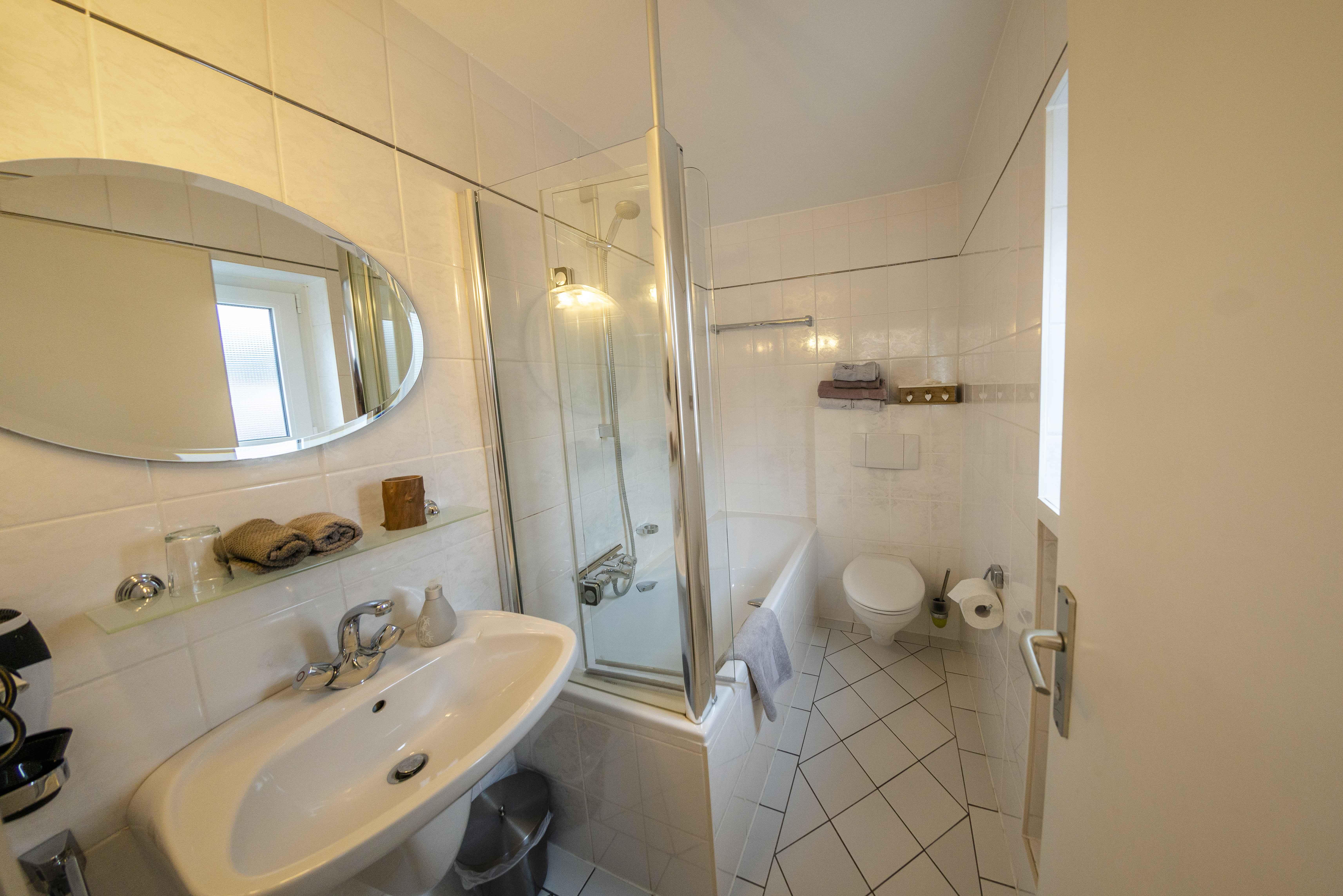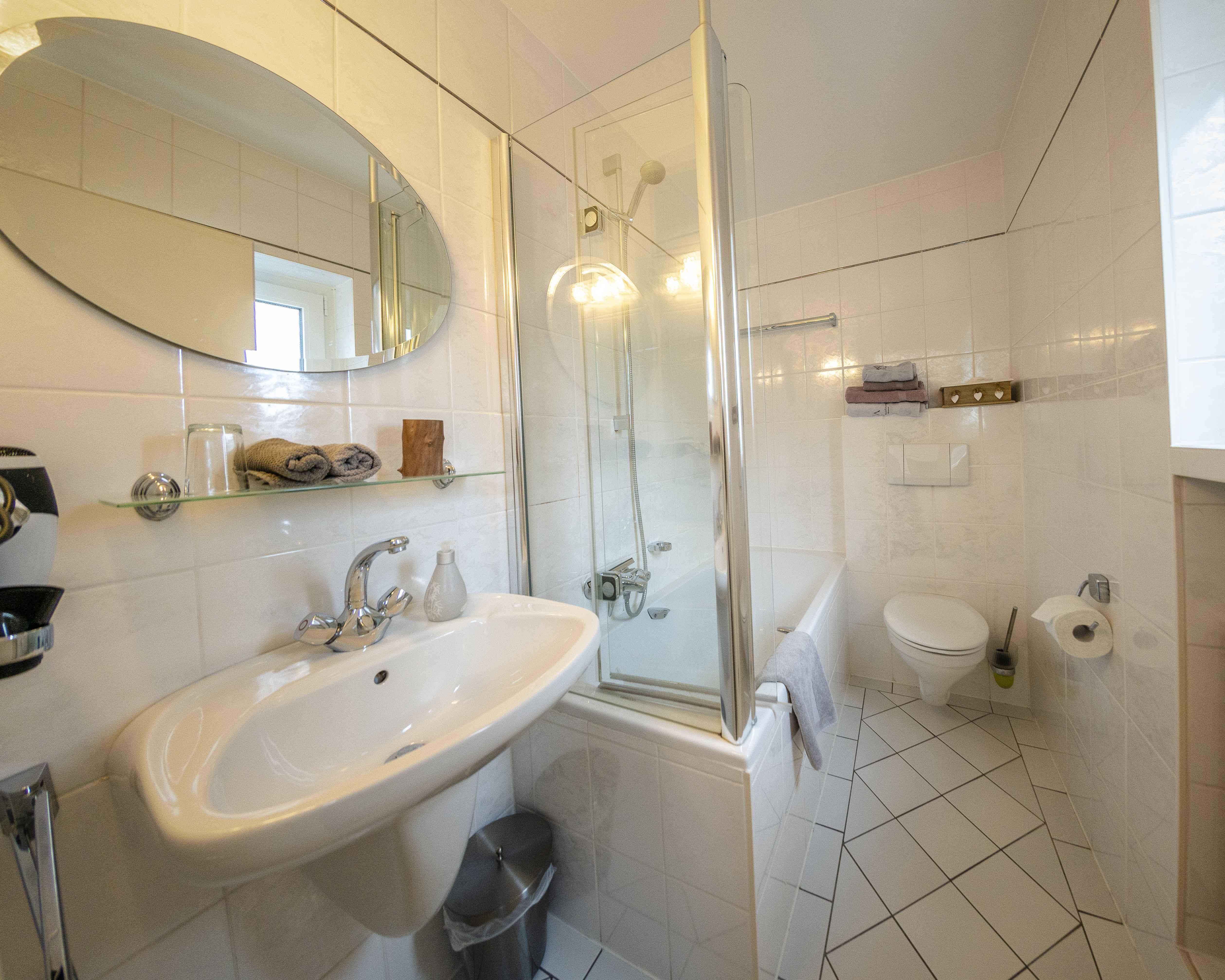 Das Badezimmer der Ferienwohnung Erli 3 verfügt über eine Badewanne mit integrierter Dusche, in der man sich nach einem langen Tag in den Bergen entspannen kann. Handtücher werden gestellt.