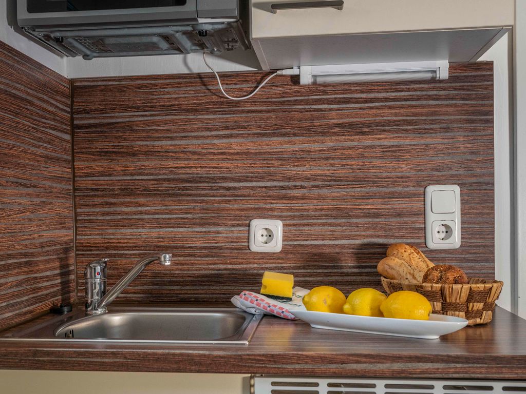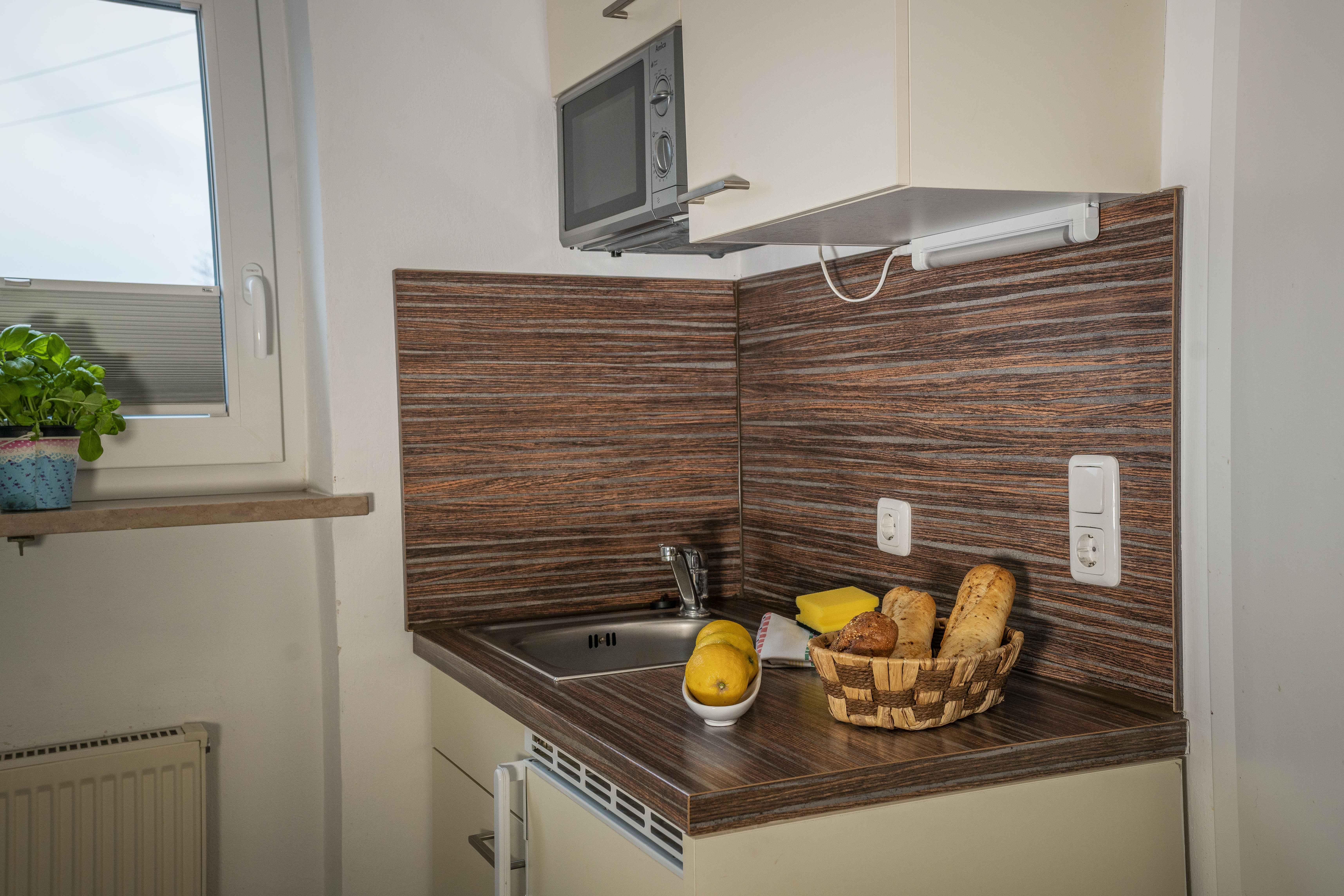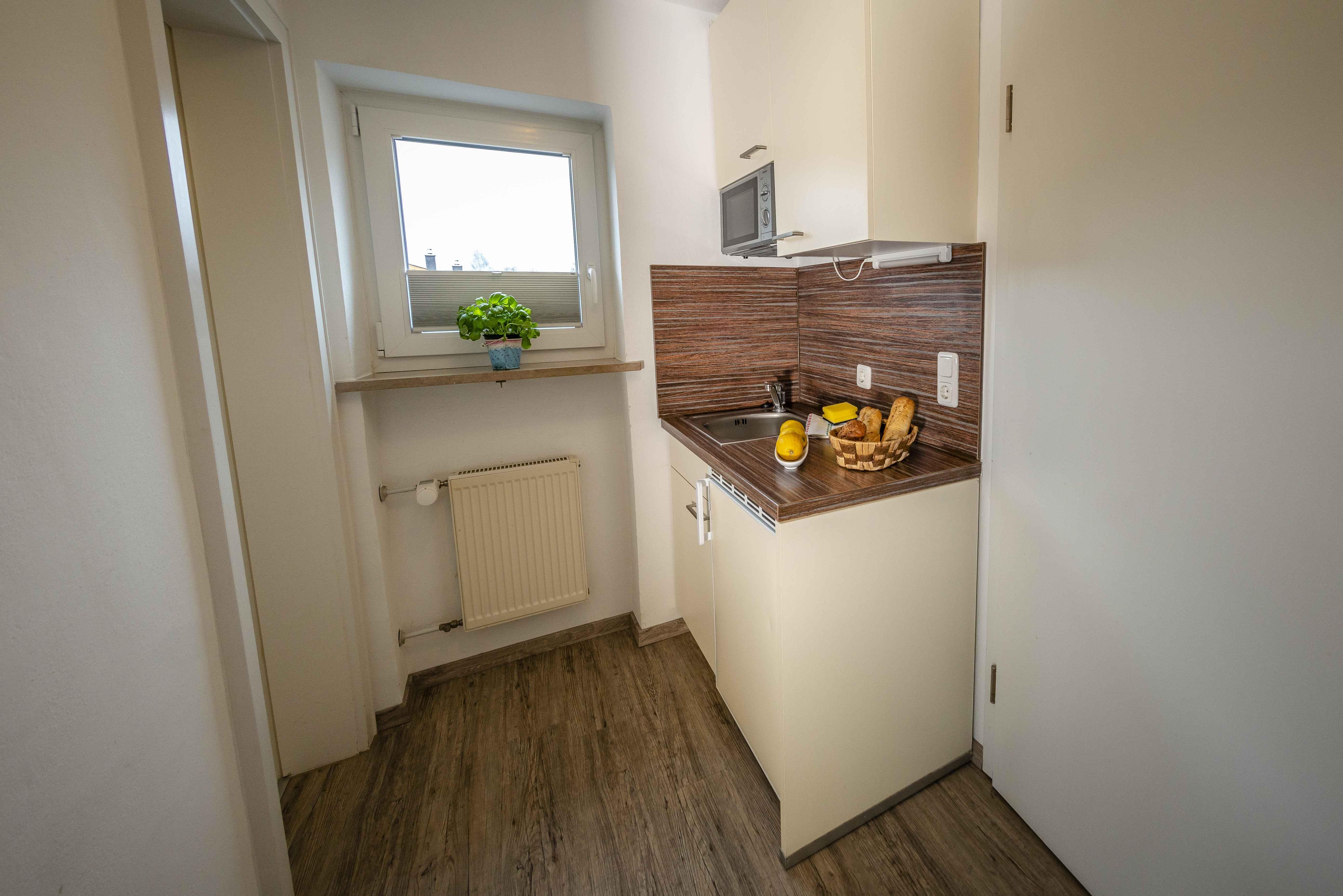 Die Küche der Ferienwohnung Erli 3 ist mit einer Induktionskochplatte, einer Mikrowelle mit Backofenfunktion, einem Kühlschrank und allen notwendigen Kochutensilien ausgestattet. Hier können die Gäste ihre Lieblingsgerichte zubereiten und gemeinsam am Esstisch genießen.