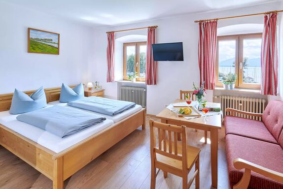 Lichtdurchflutet und freundlich empfängt das Doppelzimmer Nummer 3 mit Frühstück die Feriengäste auf dem Urlaubshof Kirchmaier am Chiemsee. Ein schöner Ort, um sich gemütlich nach einem ereignisreichen Urlaubstag rund um das Bayerische Meer in Ruhe zurückzuziehen. Das Doppelzimmer 3 bietet alles, was den nötigen Komfort für eine erholsame Übernachtung. Ein bequemes Doppelbett steht frisch bezogen bereit und das Badezimmer bietet mit Dusche, Waschbecken und WC einen sauberen Ort zum Frischmachen.