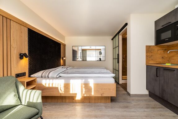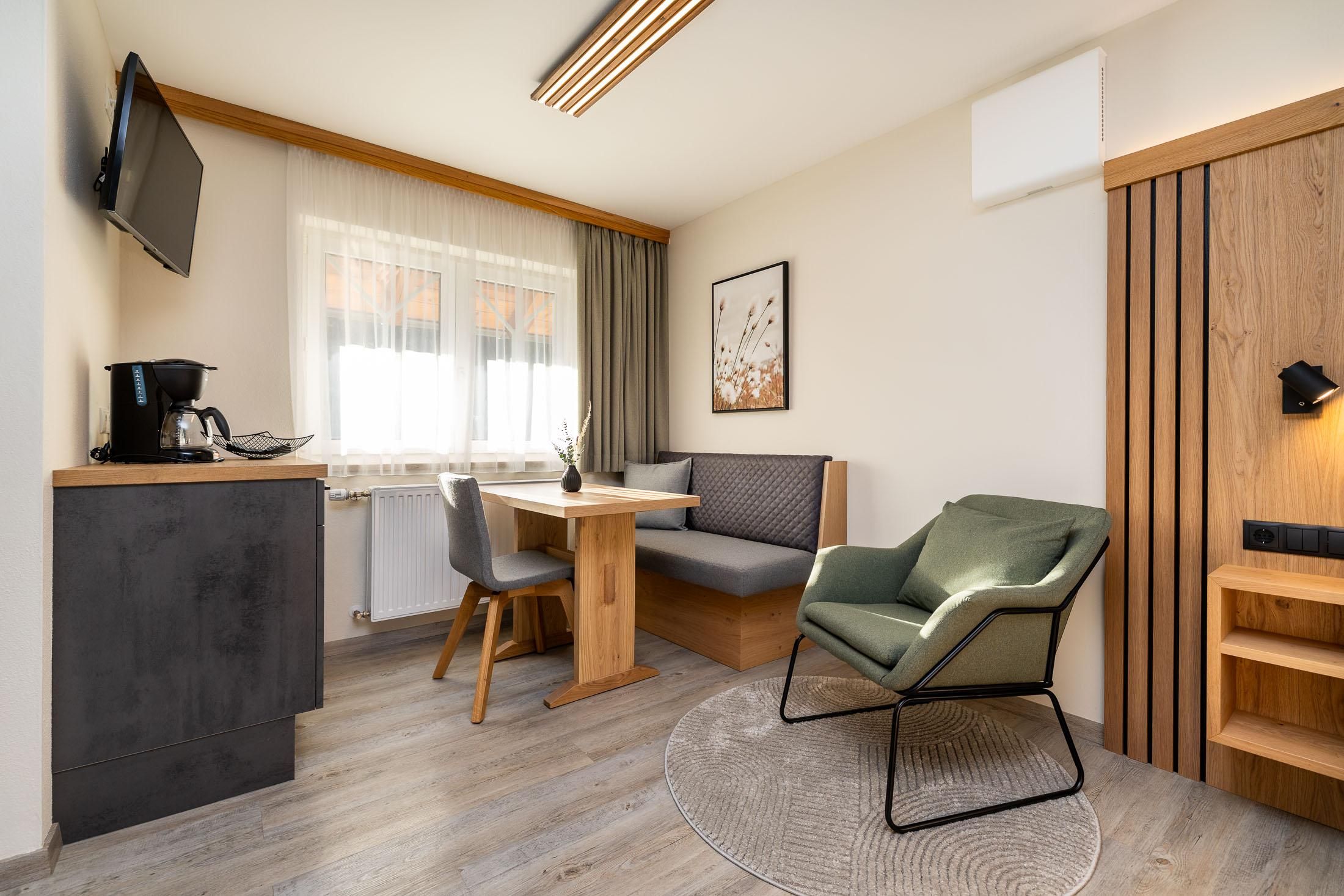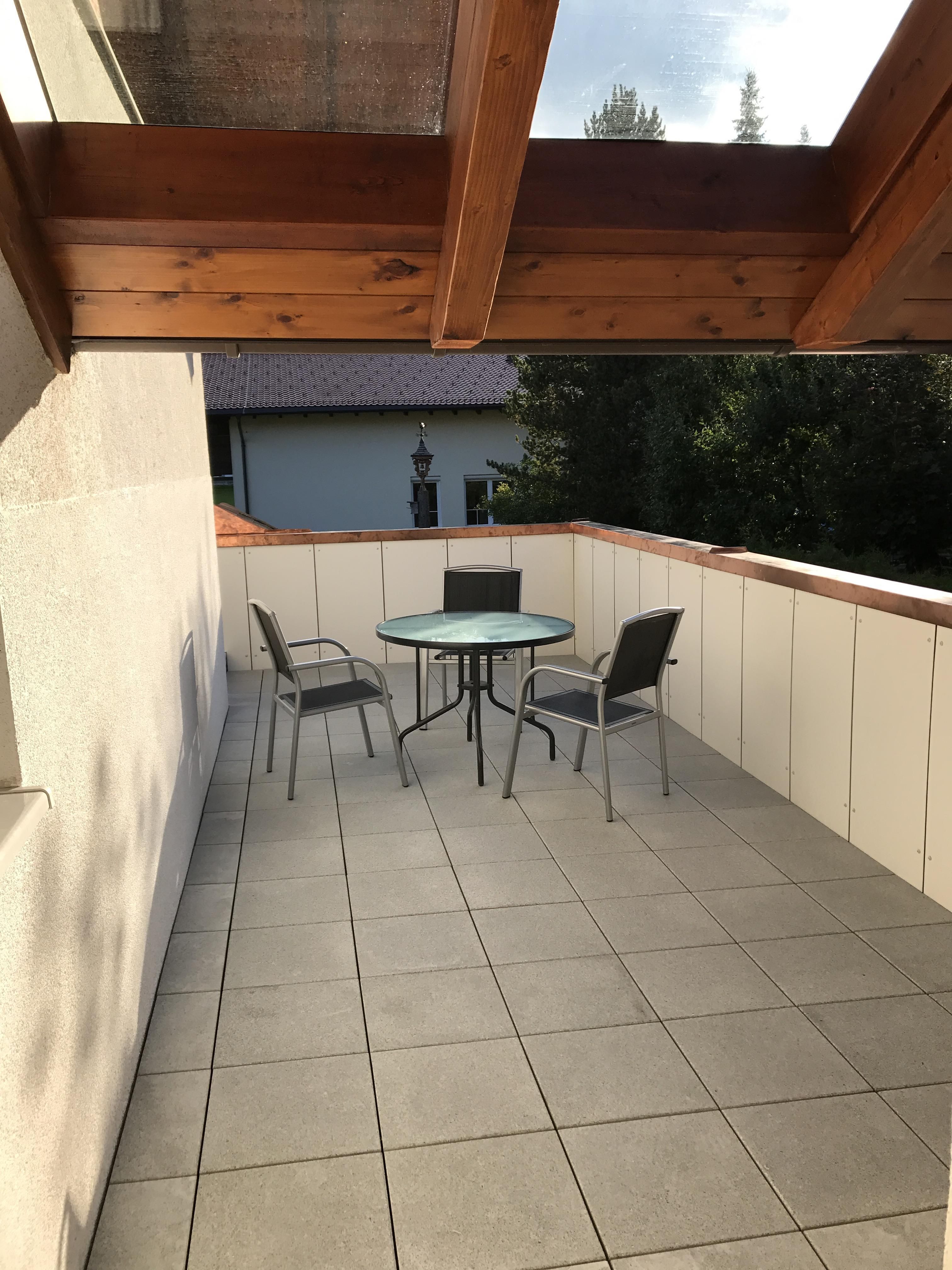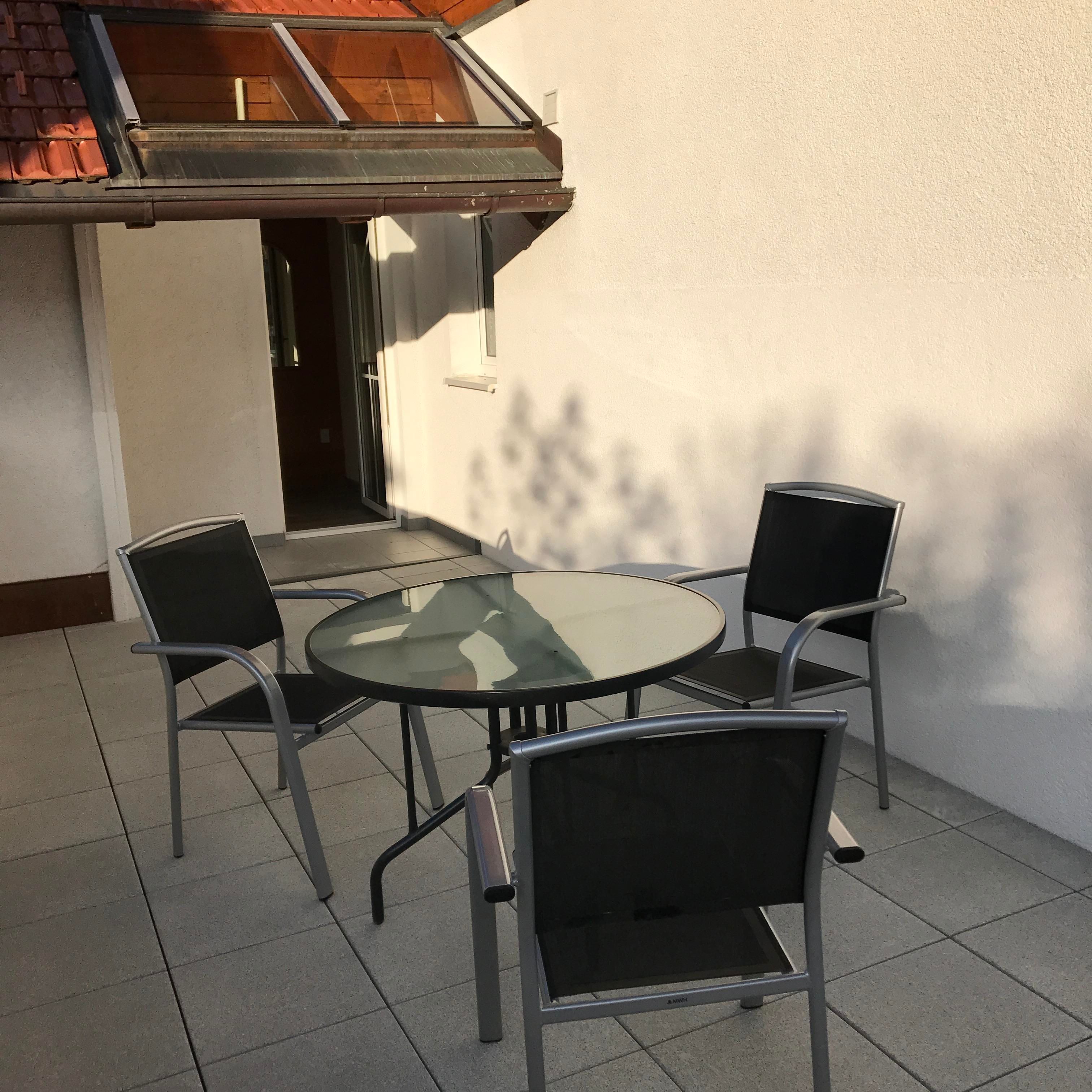 Gemütlich ausgestattetes Wohnstudio mit großer Terrasse (Süd-Westen) und Terrassenmöbel. Im Anschluss steht bei Bedarf ein Doppelzimmer (DU und WC) als separater Schlafraum zur Verfügung.