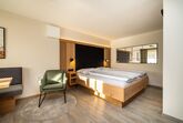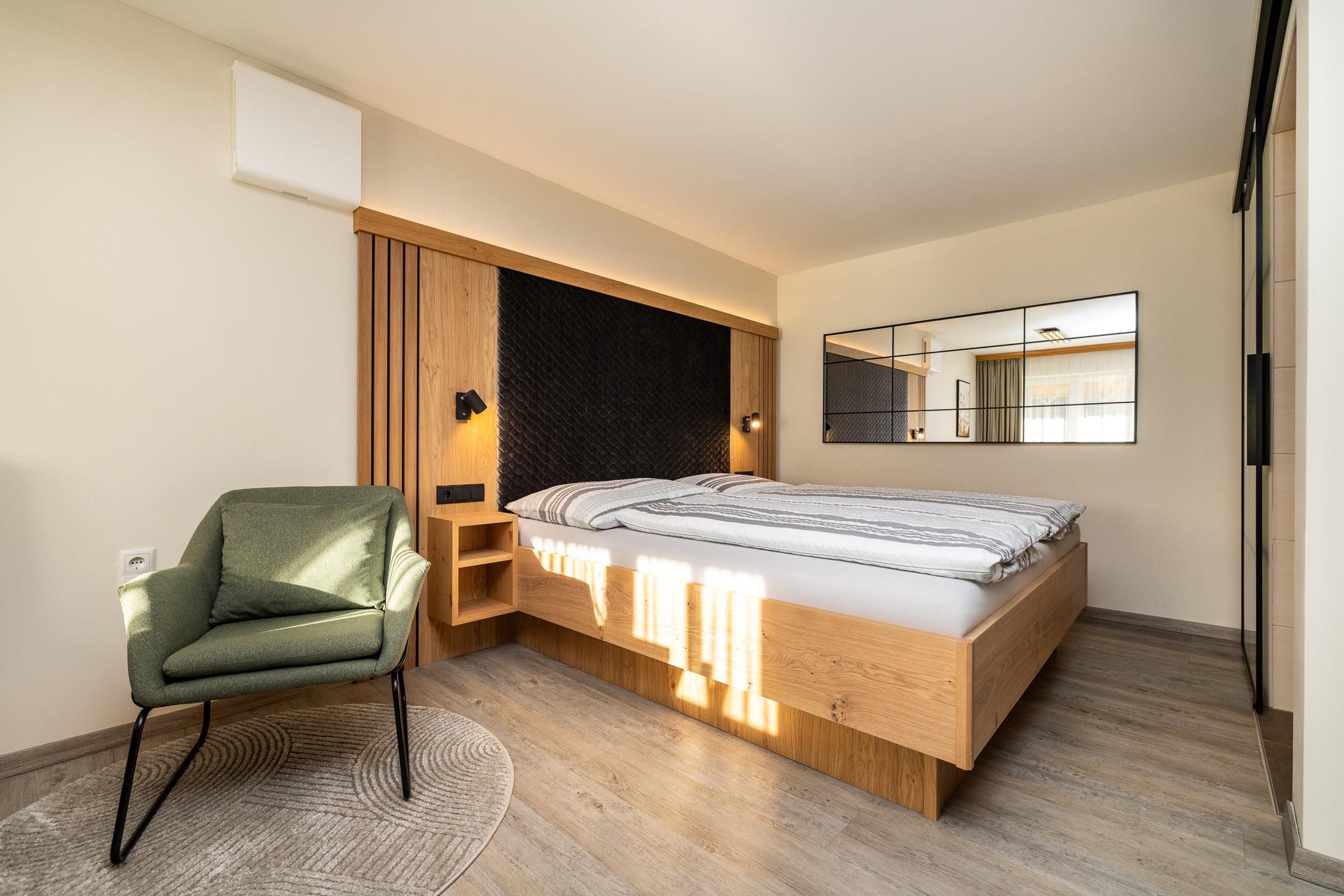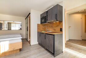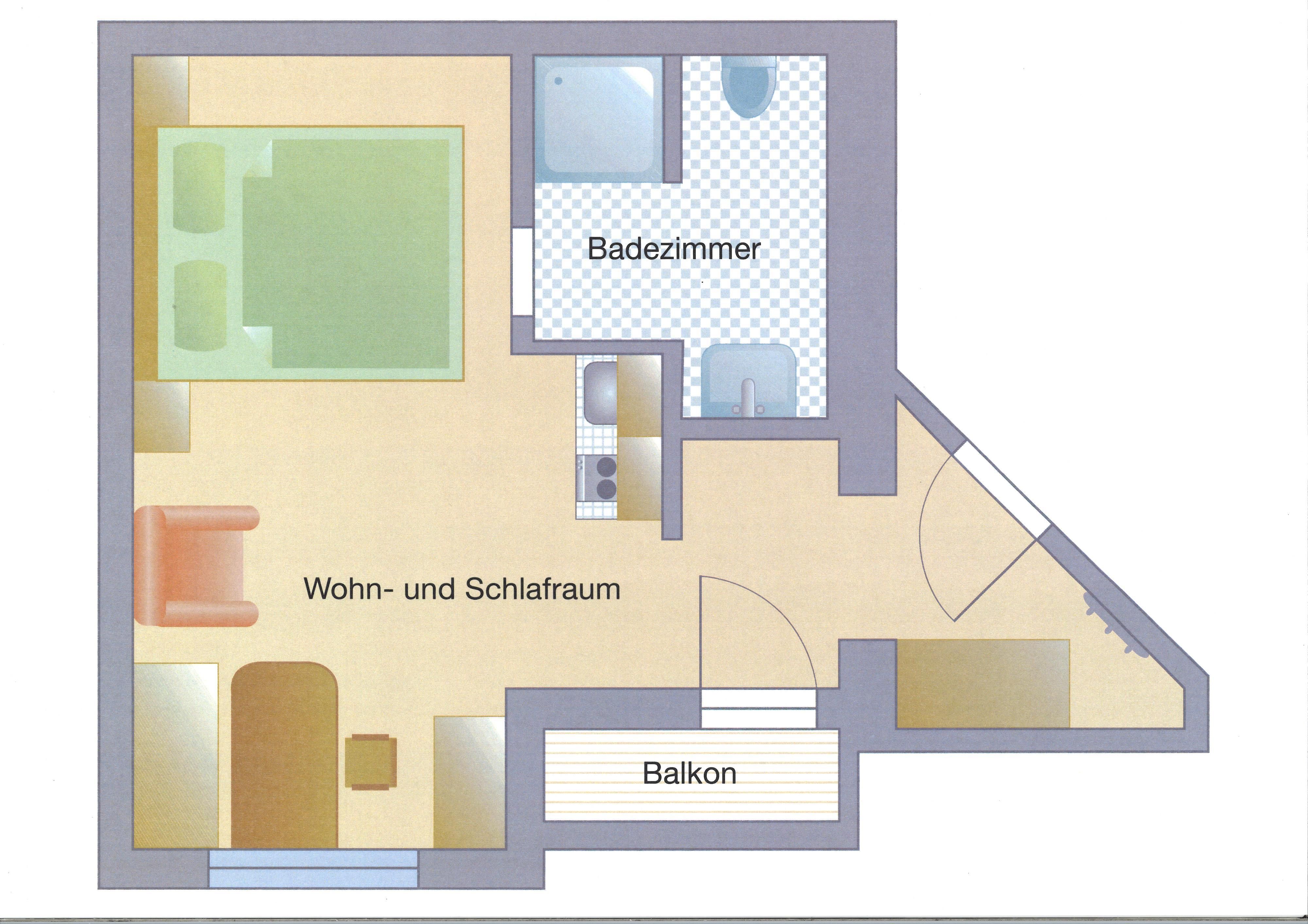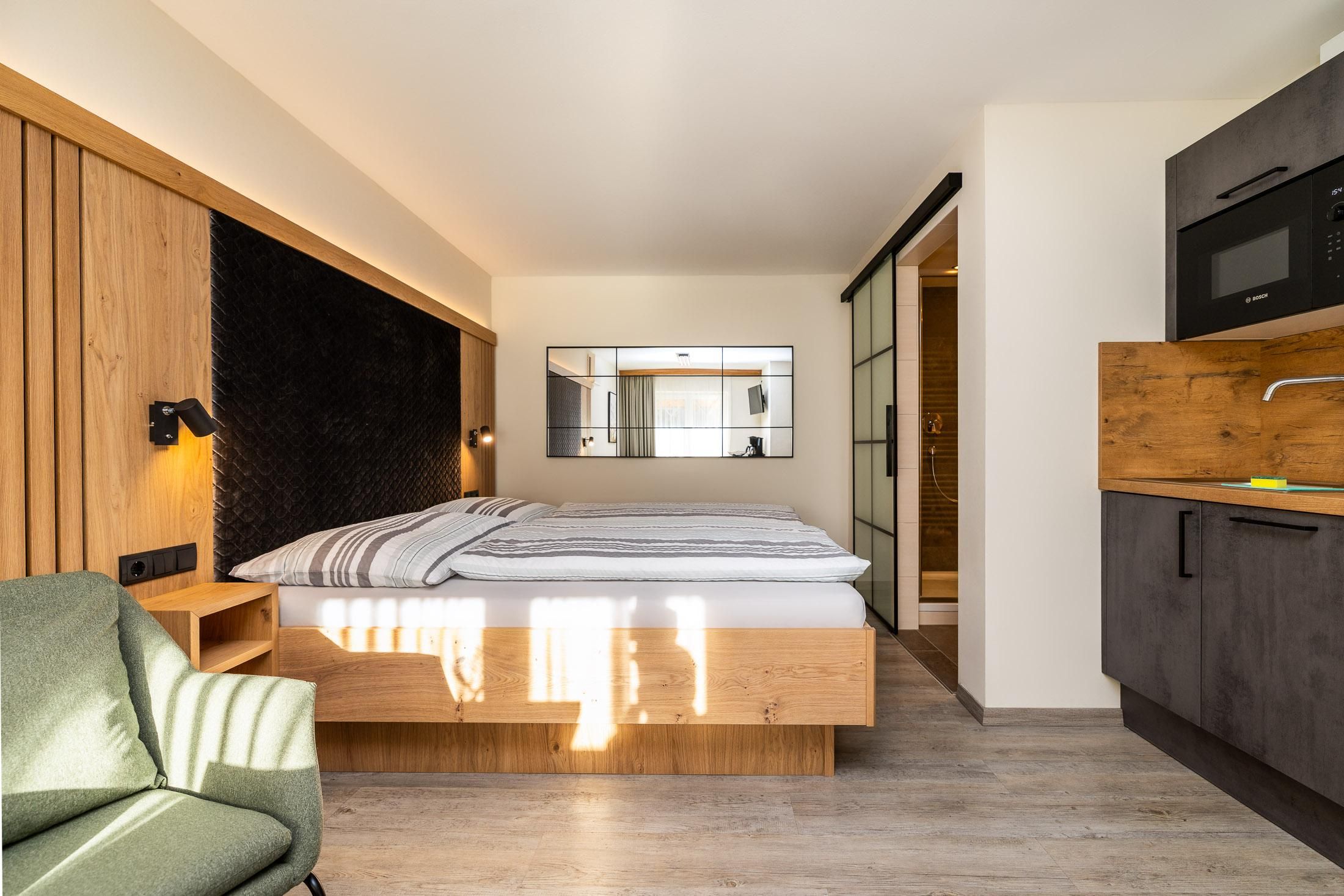 Gemütlich ausgestattetes Wohnstudio mit großer Terrasse (Süd-Westen) und Terrassenmöbel. Im Anschluss steht bei Bedarf ein Doppelzimmer (DU und WC) als separater Schlafraum zur Verfügung.