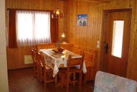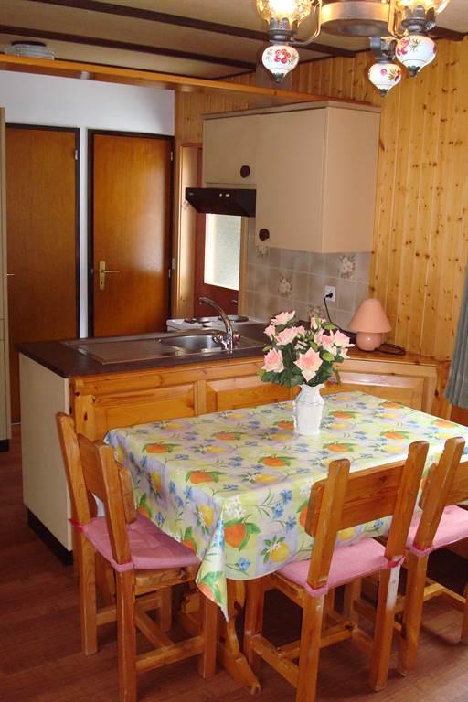 3 Zimmer Chalet, ca. 44 m2. Wohn und Schlafraum mit Sitzgruppe, 2 Schrankbetten, Essecke und offene Küche, Kochnische (3 Platten, Backofen, Dampfabzug, Kühlschrank mit Gefrierfach, Kaffeemaschine