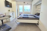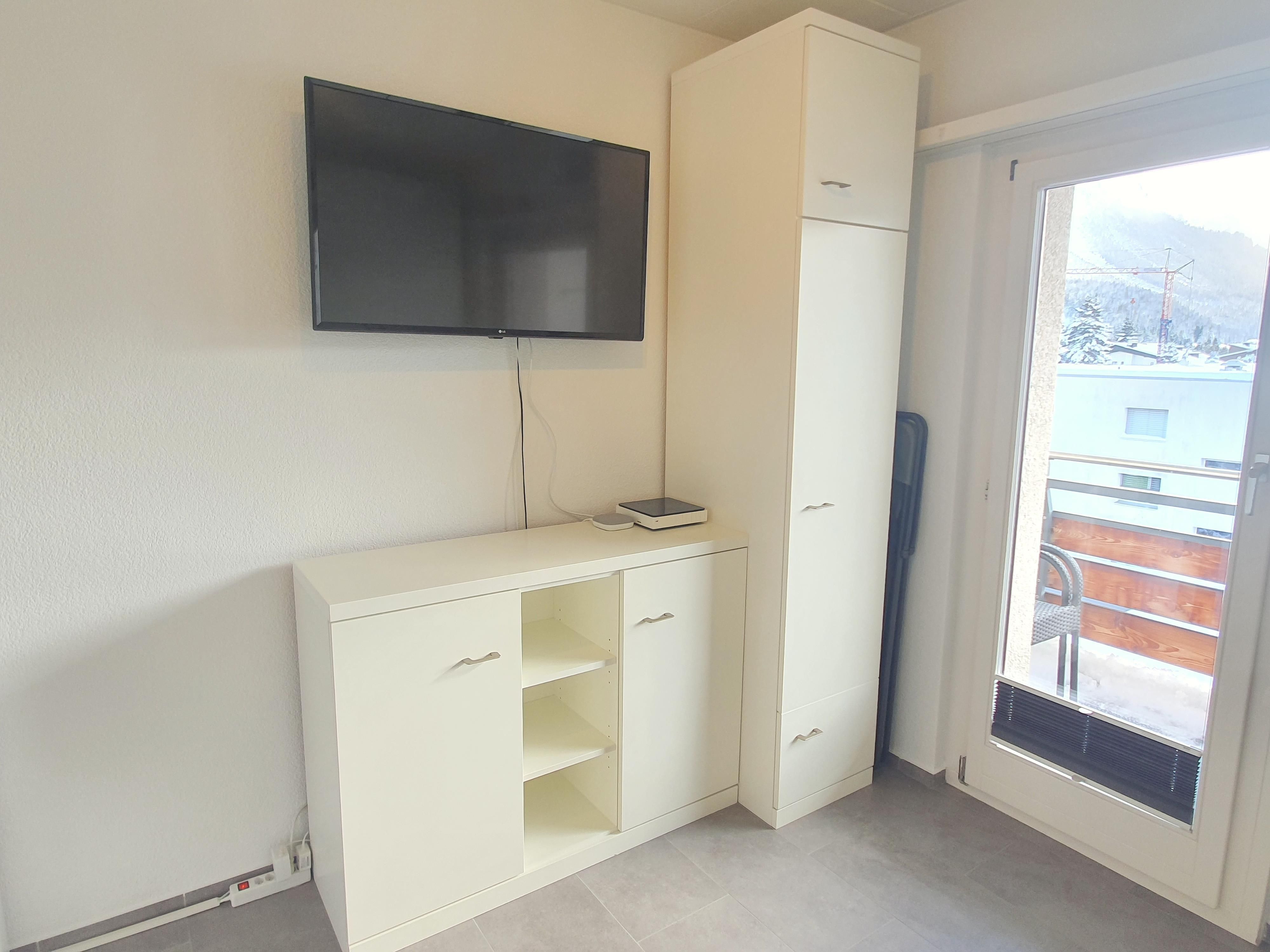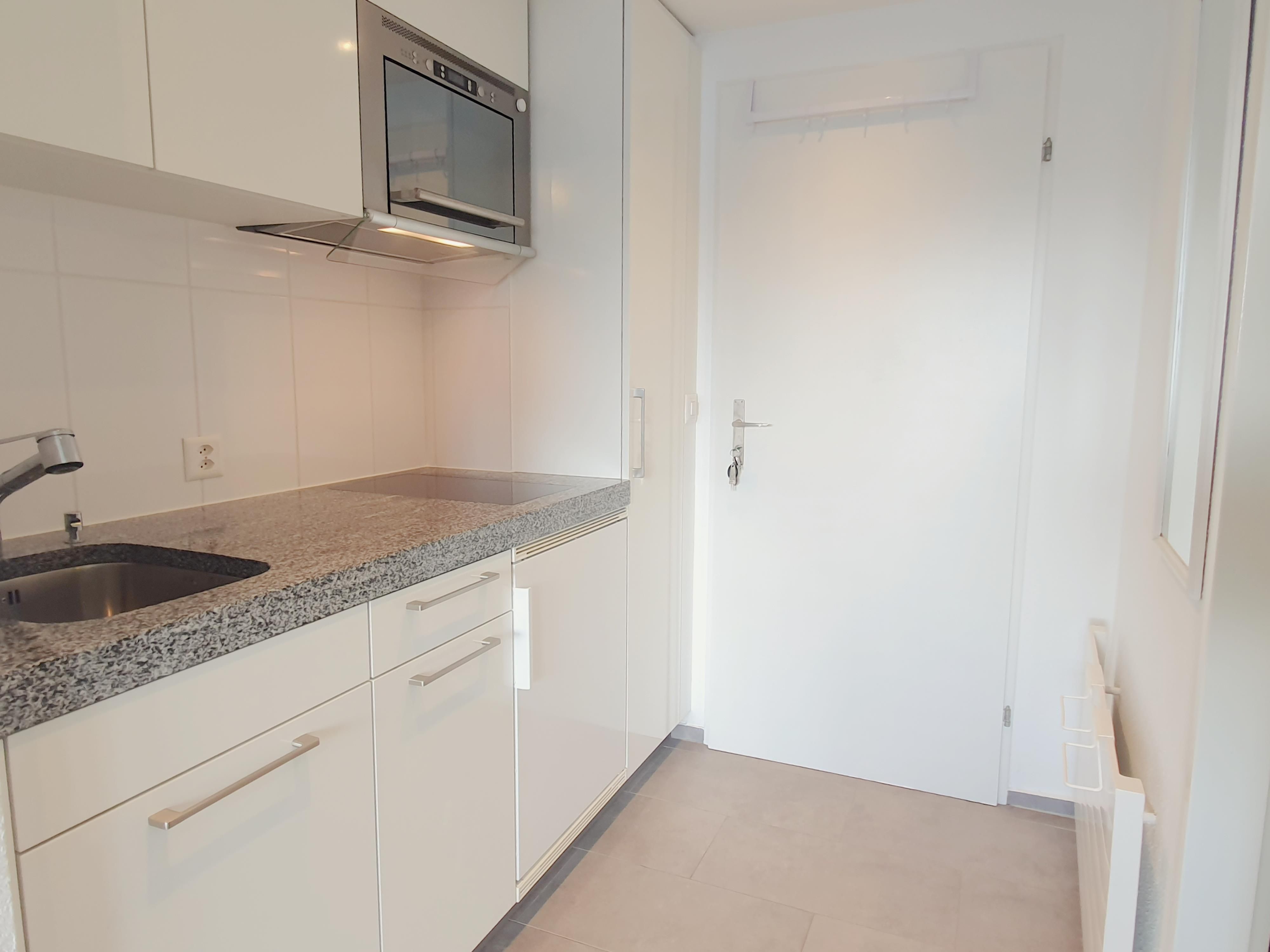 Das Studio ist hell, modern und durchdacht möbliert. Schrankbett (160x200), zweckmässige Küche mit Granitarbeitsplatte, Kühlschrank mit Gefrierfach, Mikrowelle, 2er-Glaskeramikherd (ohne Backofen) sowie 2 mobile Herdplatten zusätzlich. Nespresso-Kaffeemaschine vorhanden. Badezimmer mit Dusche. Sonniger Süd-Balkon, mit Blick auf die Berge.