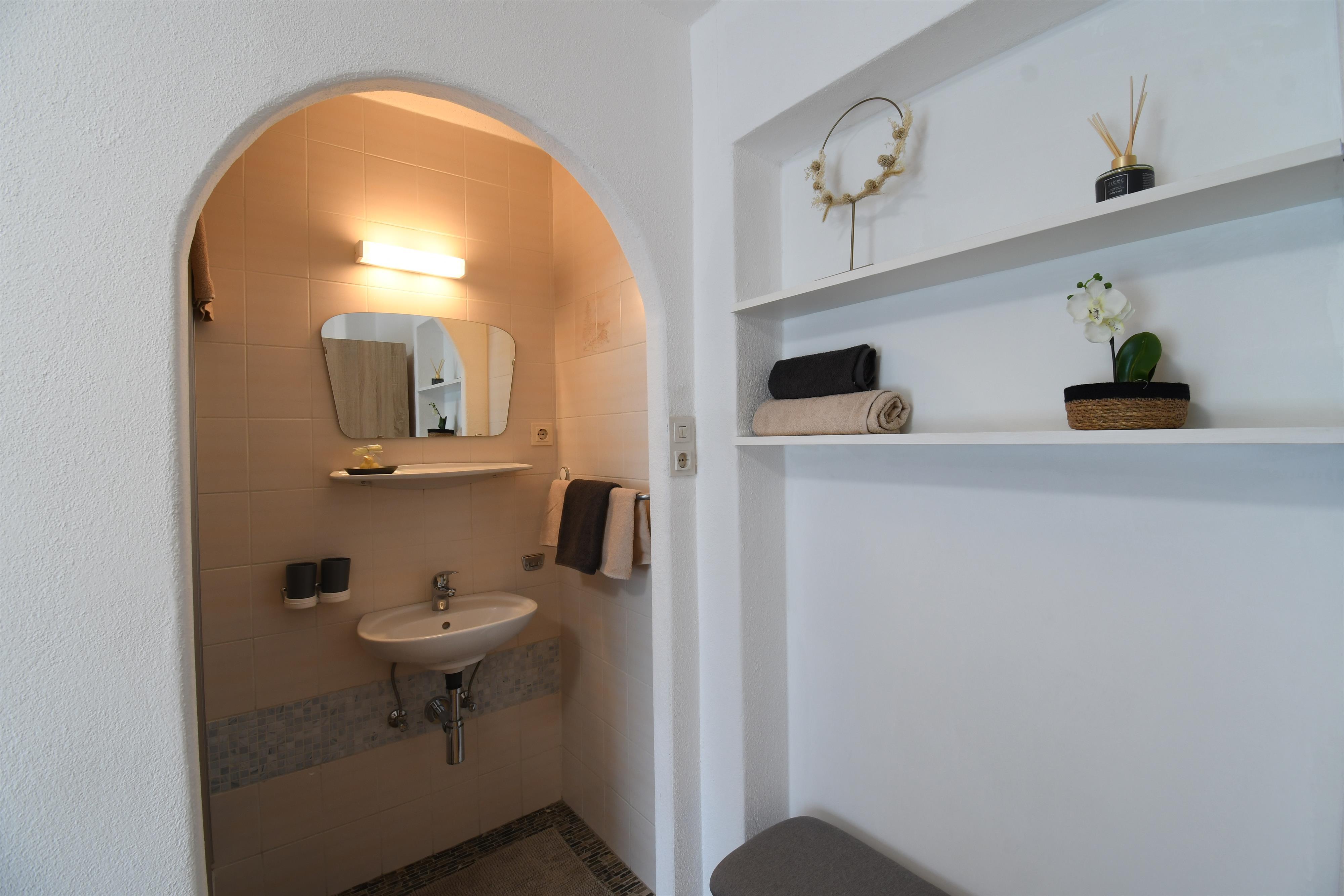 Schlafzimmer mit Dusche - Balkon, WC extra am Flur. Wohnraum mit Kleinküche - schöner Blick vom Balkon Richtung Süden, Eckbank,