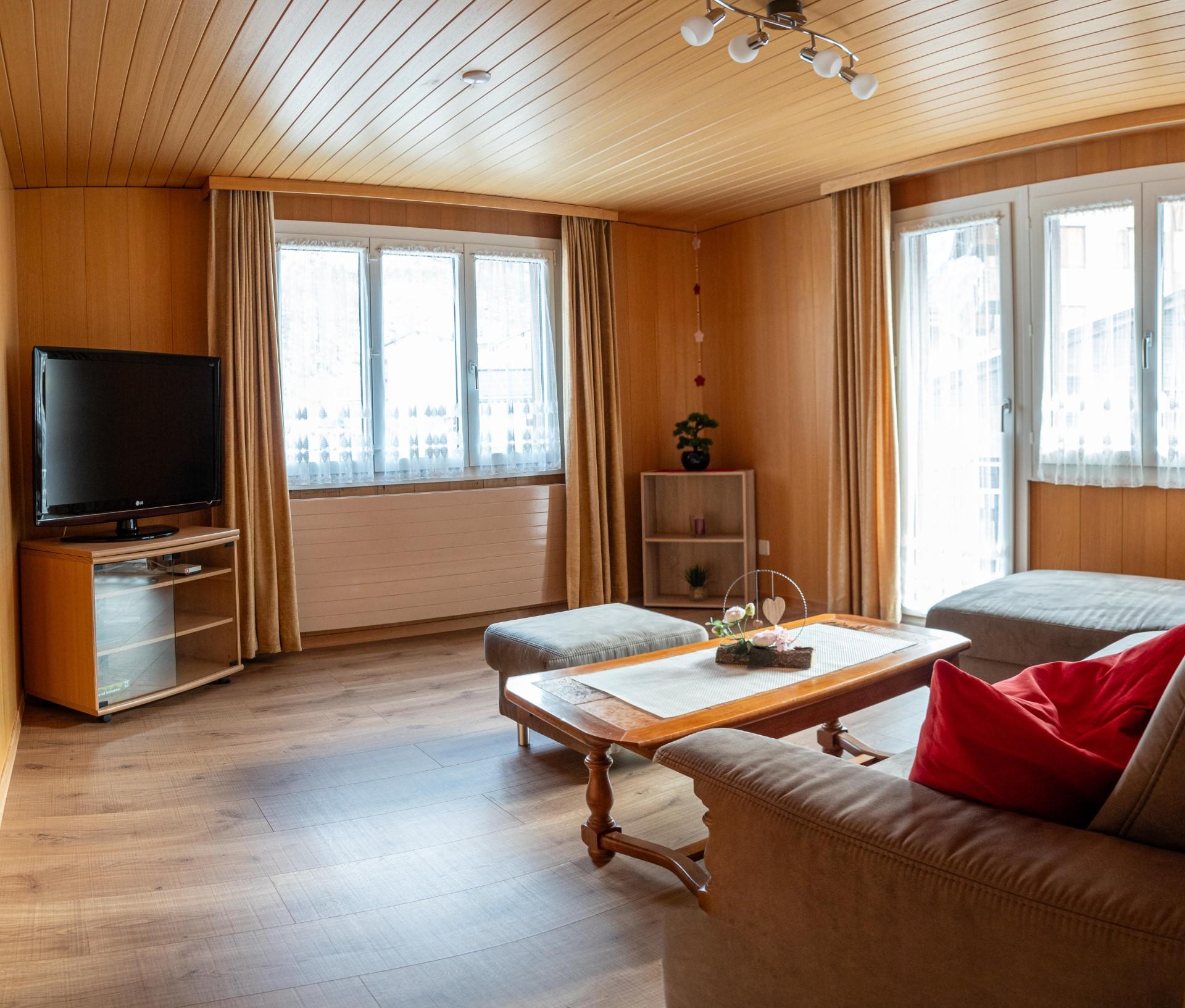3.5 Zimmerwohnung in einem Mehrfamilienhaus. Die Wohnung liegt im 1. Stock. Das Haus ist in der Nähe der Gondelbahn, Tennisplatz, Kunsteisbahn, Bushaltestelle und Langlaufloipe. Ideal für Skifahrer und Wanderer.