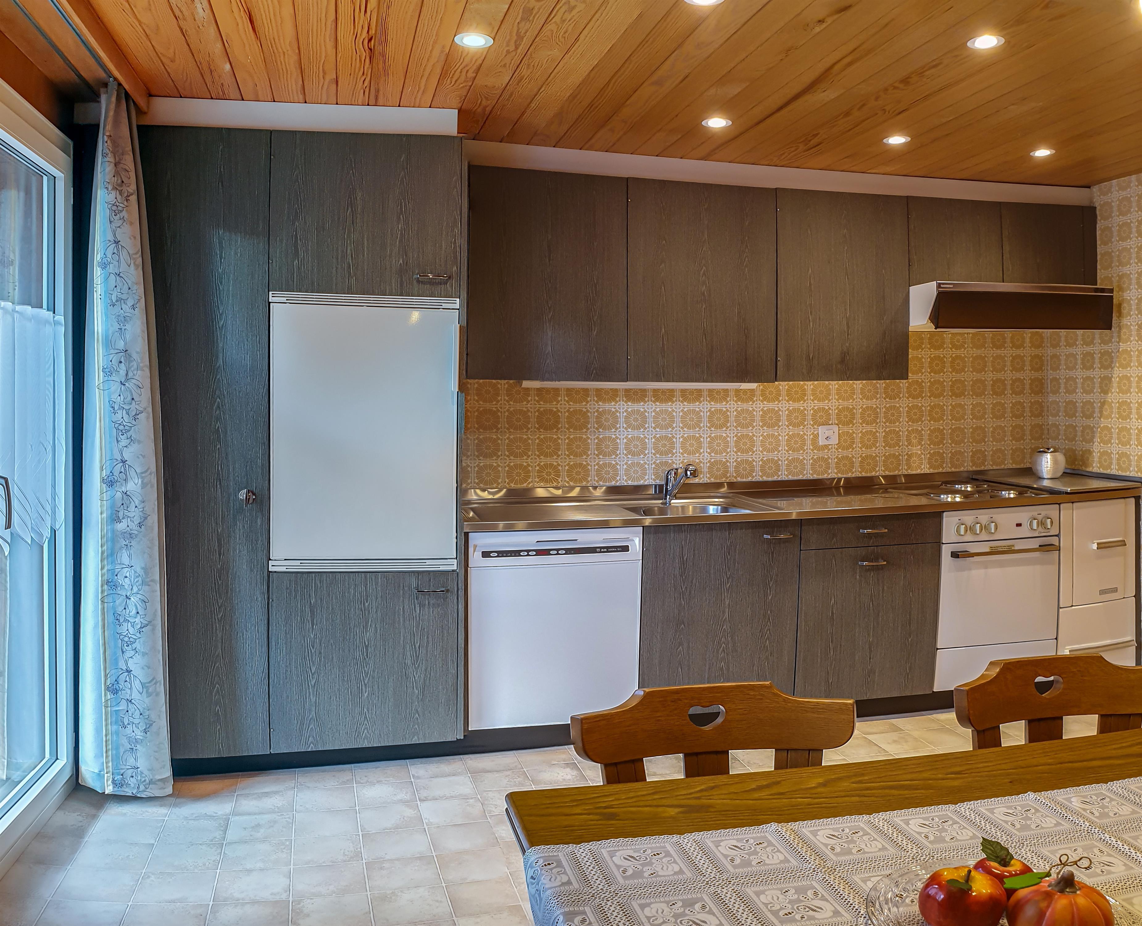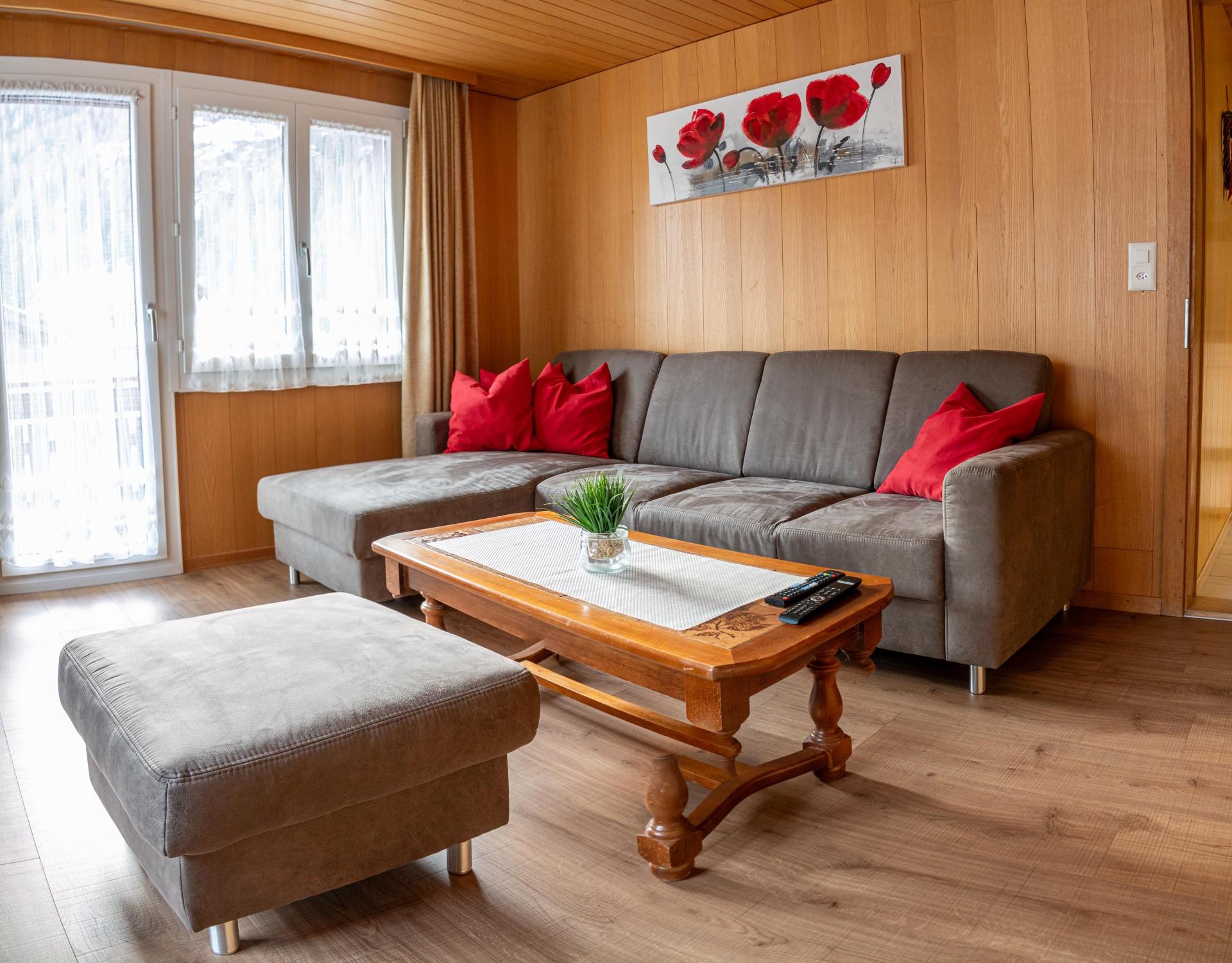 Die Wohnung befindet sich im ersten Stock und verfügt über 3,5 Zimmer. Es gibt zwei Doppelzimmer, ein Wohnzimmer mit Sofa, Fernseher, Radio und WLAN. Die Küche ist gut ausgestattet mit Geschirrspüler, Mikrowelle, Backofen, Kaffeemaschine (Kapselsystem), Raclette, Fondue und Toaster. Das Badezimmer ist in WC und Dusche aufgeteilt und verfügt über einen Haartrockner. Außerdem gibt es einen Balkon in südöstlicher Ausrichtung.