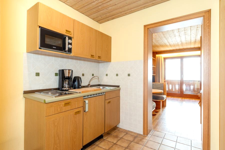 Das Sofa kann bei Bedarf in ein Doppelbett umgewandelt werden und das Wohnzimmer verfügt über einen Einbaukleiderschrank. Das separate Schlafzimmer verfügt über ein Doppelbett und Einbauschränke. Die Küche ist mit einem Herd, einem Kühlschrank und einer Kaffeemaschine ausgestattet sowie alle Utensilien, die Sie brauchen. Im Keller gibt es einen Skiraum, in dem auch Gepäck aufbewahrt werden kann. Es gibt einen privaten Parkplatz für Ihr Auto. Das Apartment Beghof teilt sich die obere Etage mit dem Studio Berghof. Apartment Berghof und Studio Berghof sind Nichtraucherwohnungen auch auf dem Balkon.
