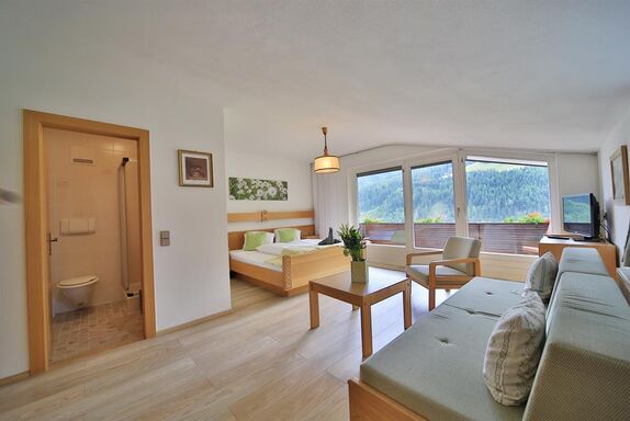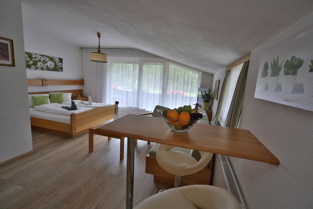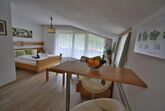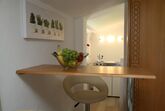 Das helle, freundliche Studio bietet Ihnen eine kleine Kochnische, ein Doppelbett, eine Couch mit Couchtisch, eine kleine Theke mit zwei Hockern, ein Badezimmer und einen großen Balkon. Das Studio Maxi ist für 2-3 Personen geeignet.