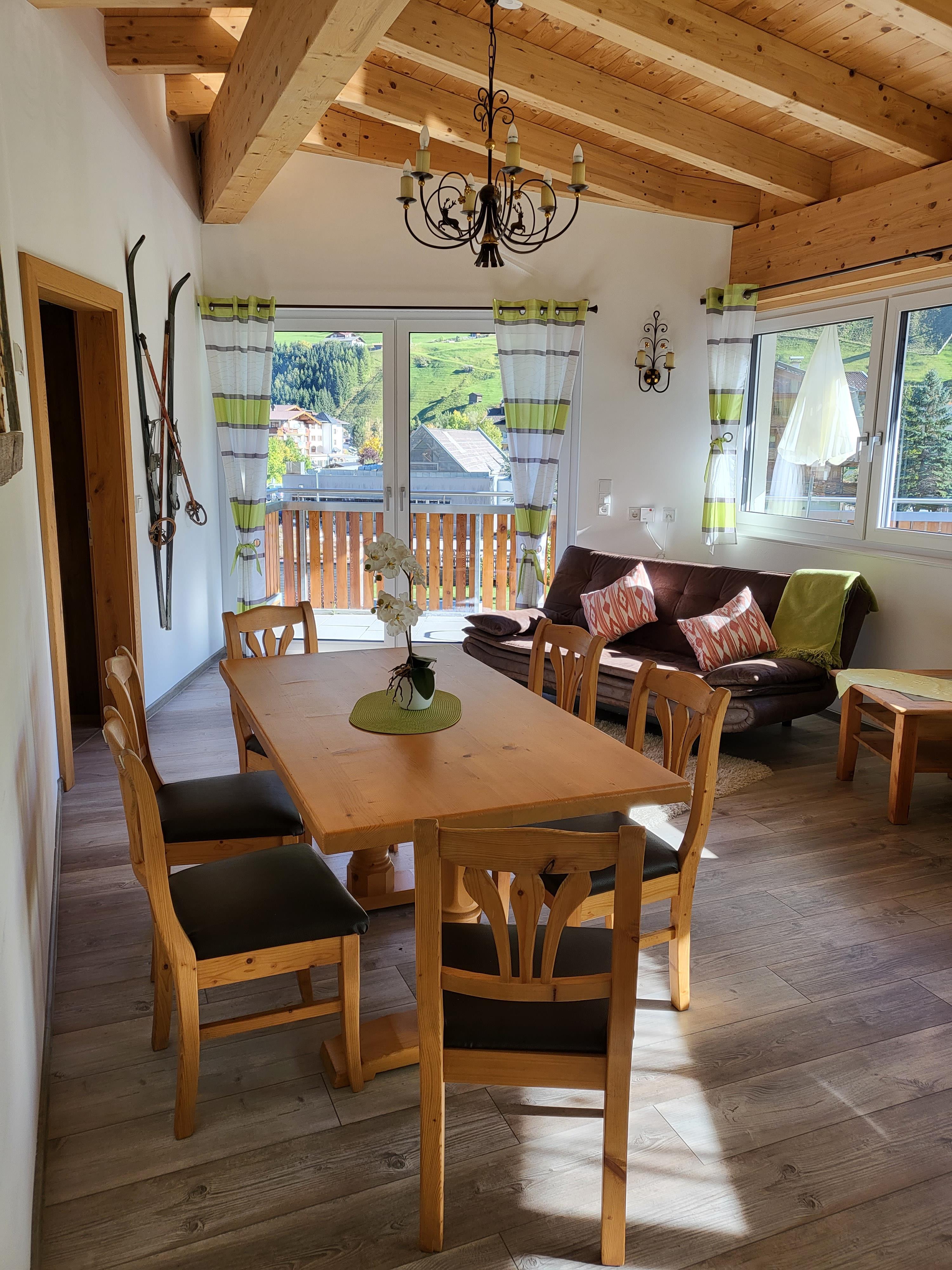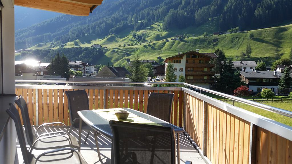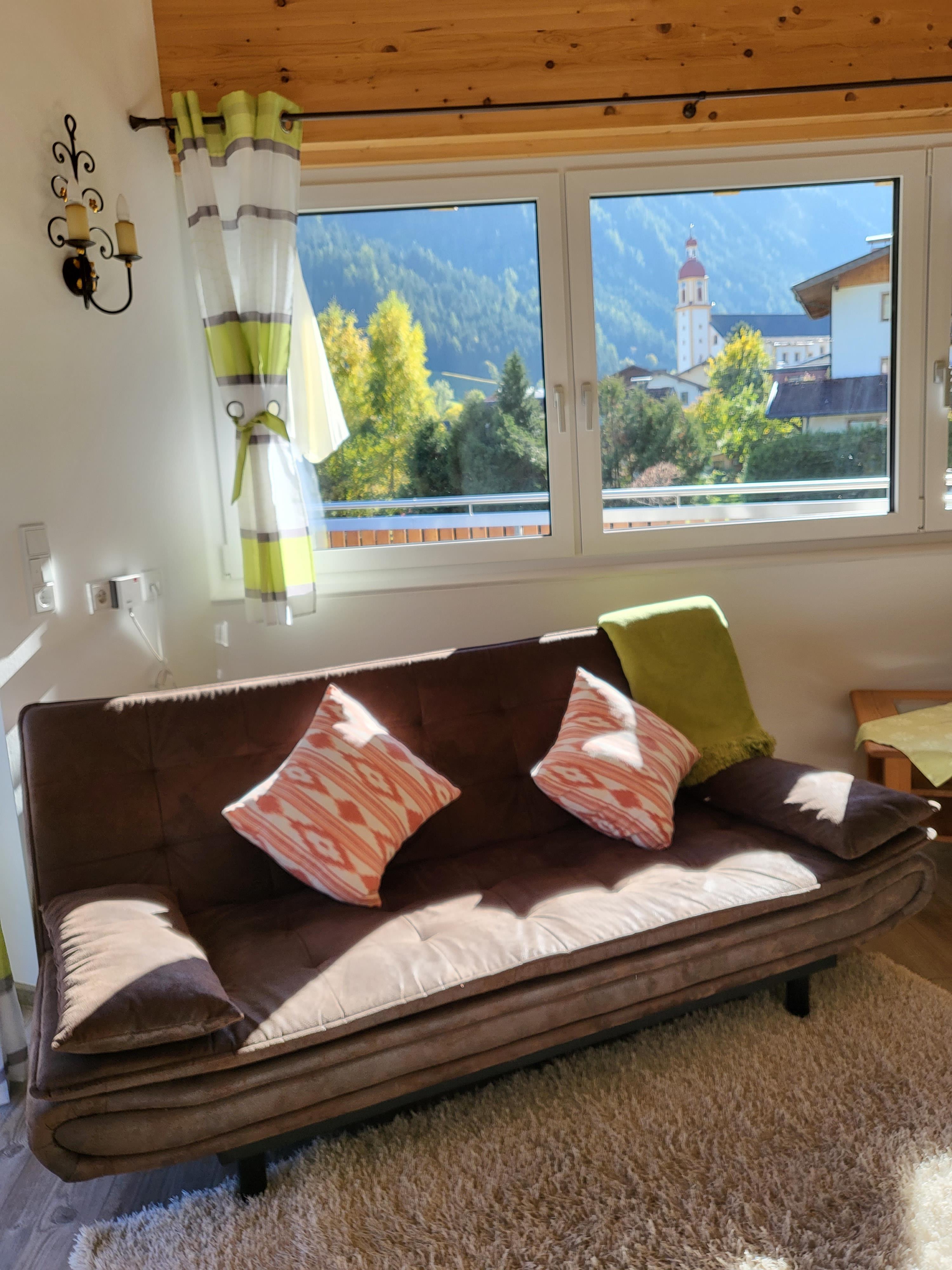 Auf einer bequemen Sitzgarnitur genießen Sie dort einen wunderbaren freien Ausblick auf Neustift und die Berge.