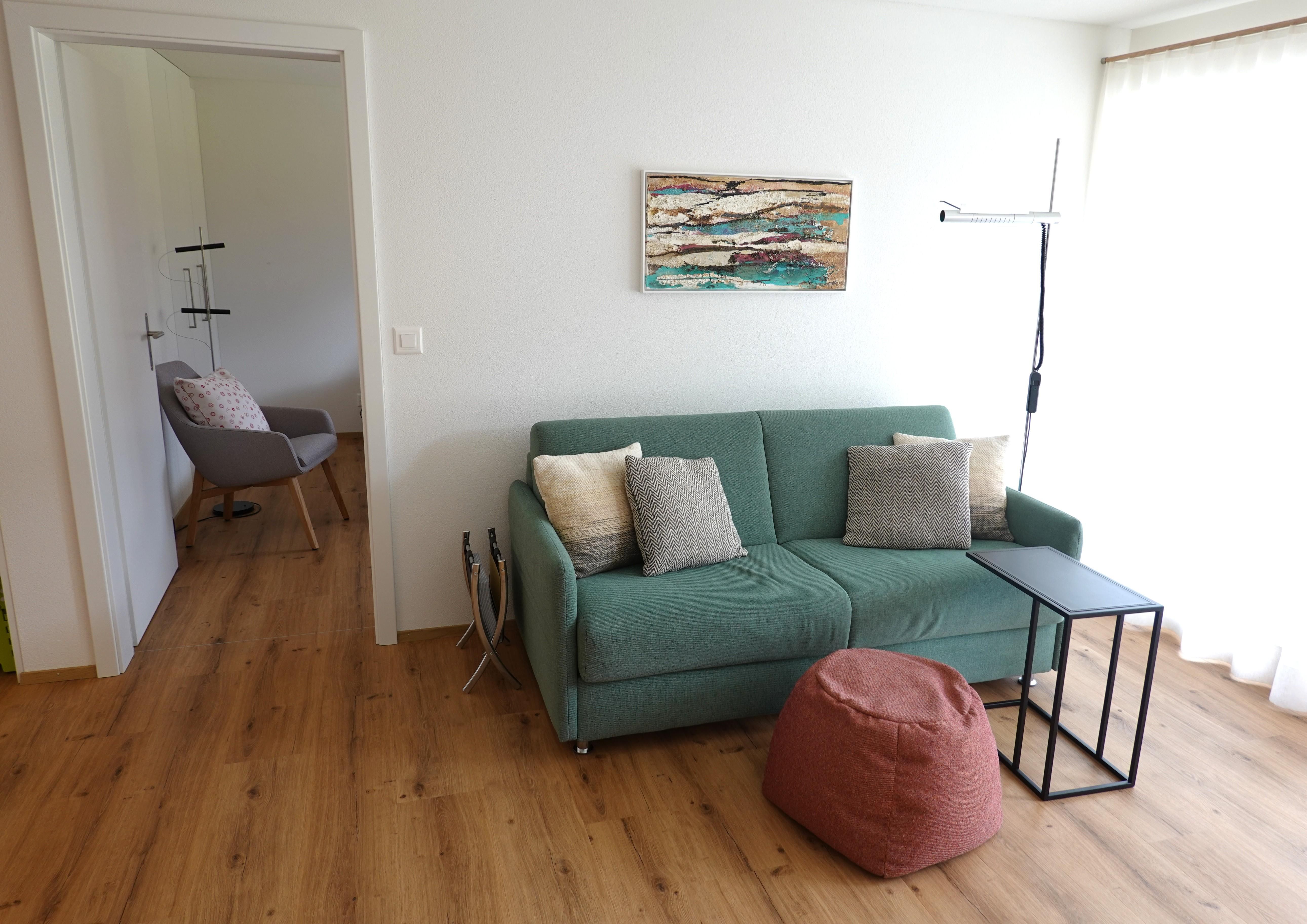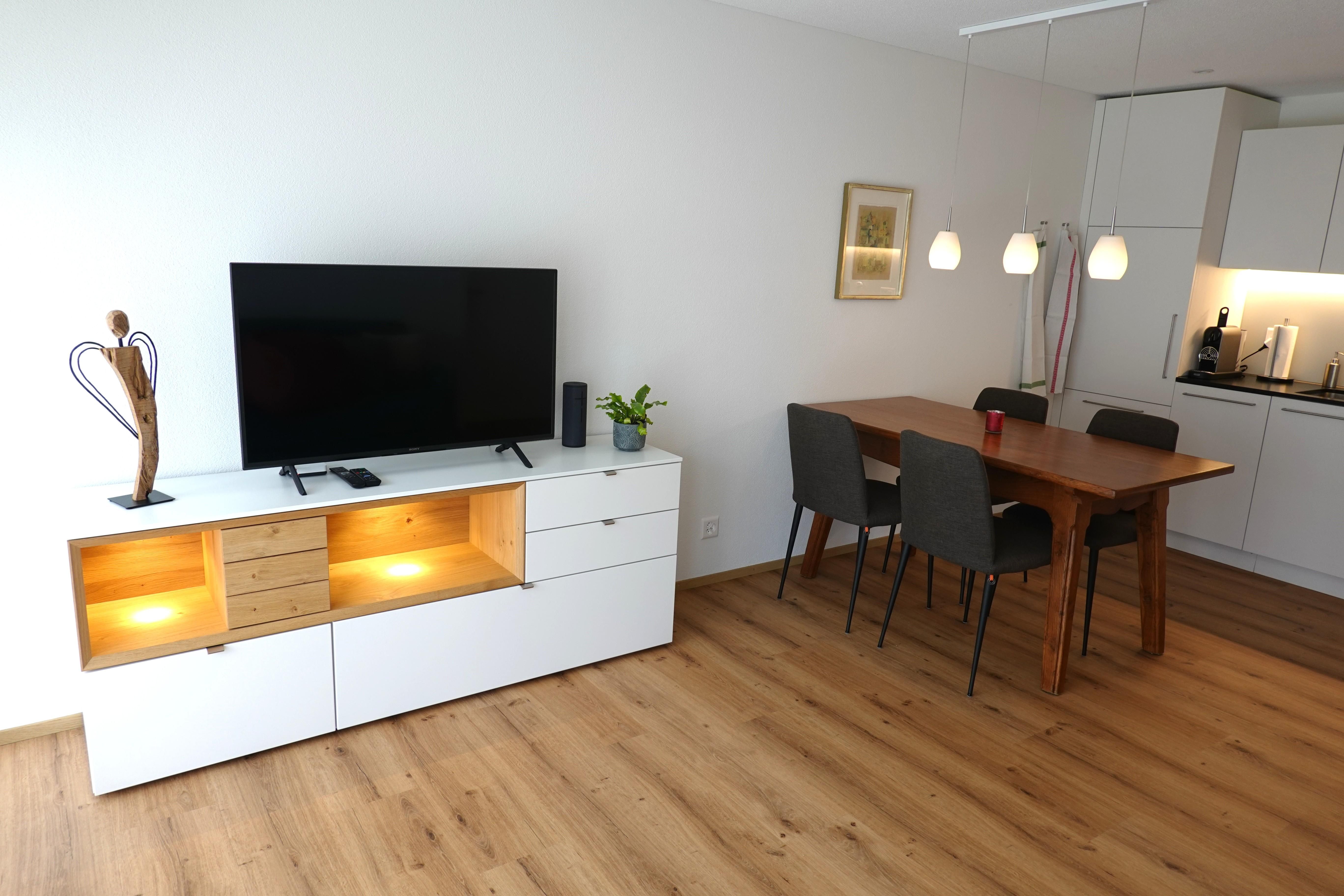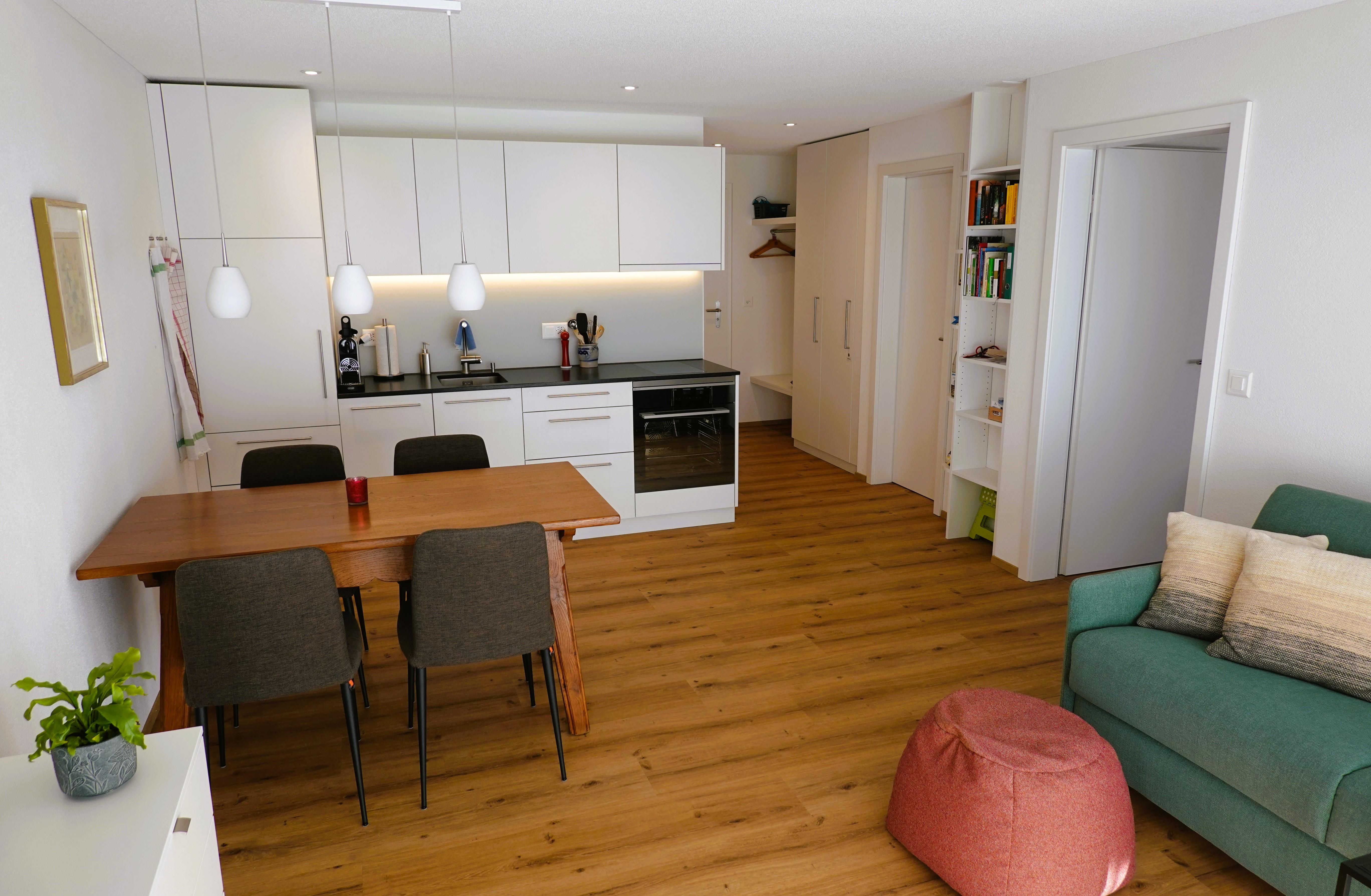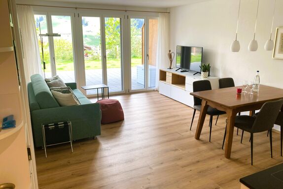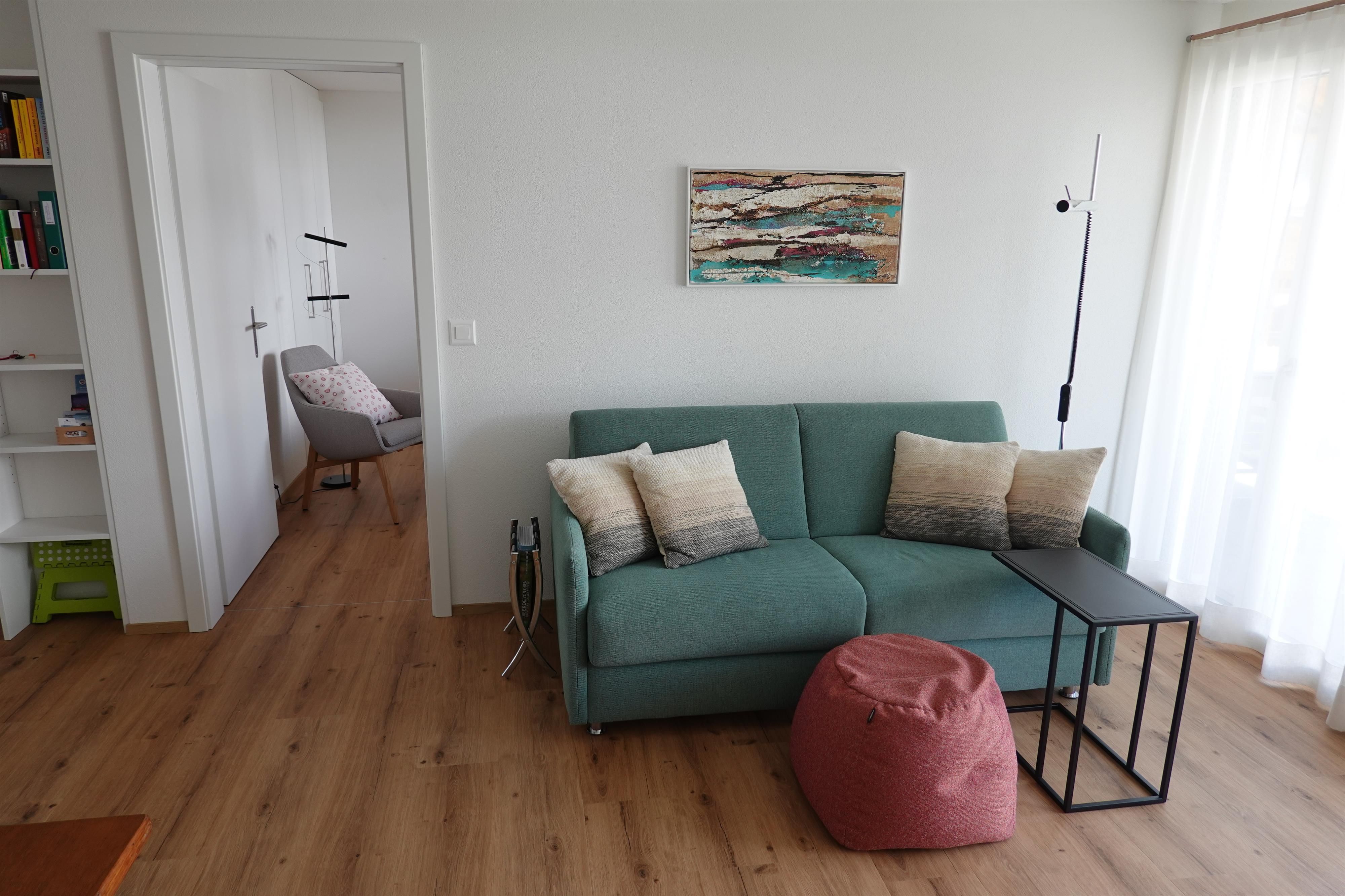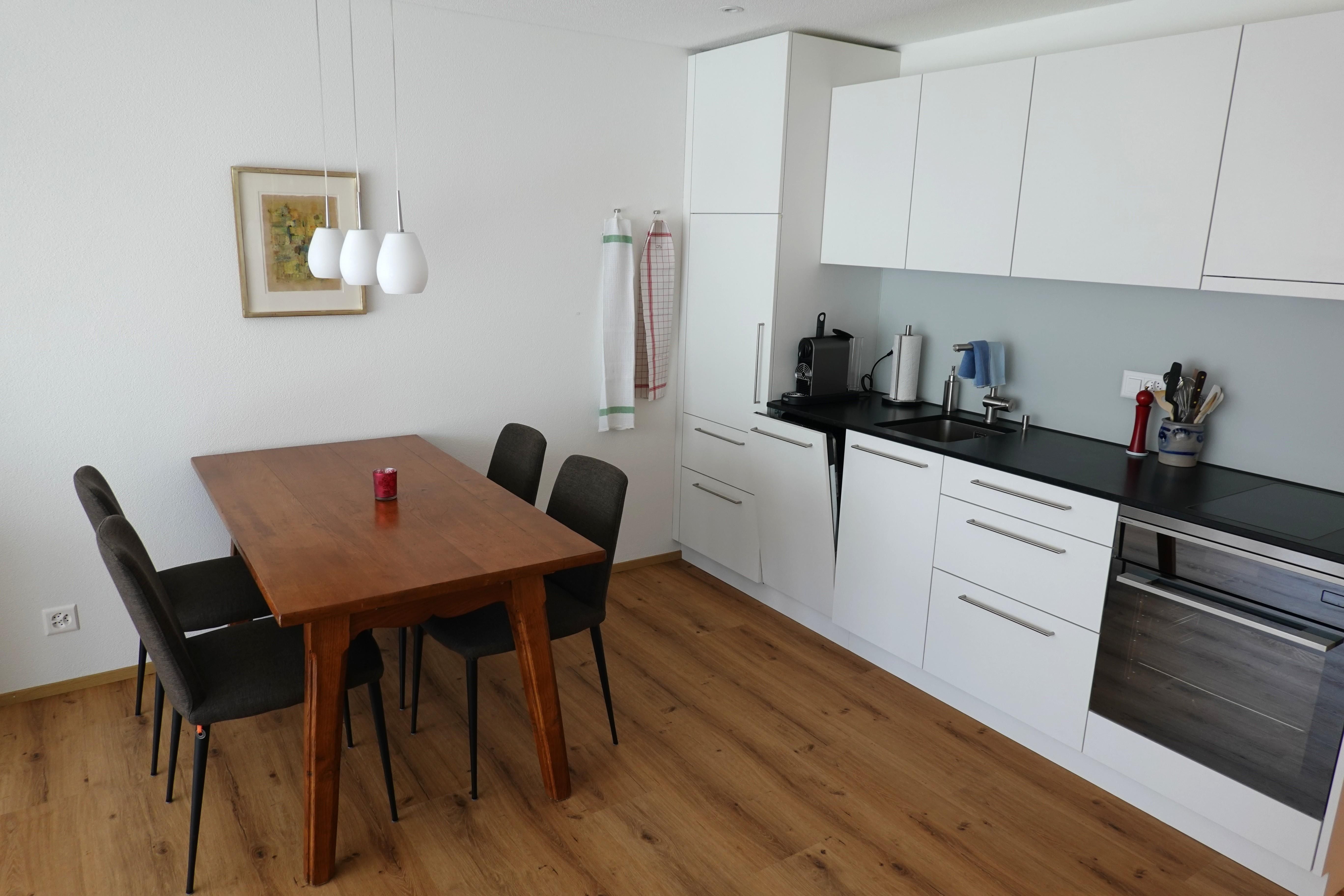 Die moderne Wohnung verfügt über Entrée mit Garderobe, Schlafzimmer, Wohnraum mit offener Küche, Badezimmer mit Dusche/WC und Bodenheizung. Mit dem Lift gelangen Sie zum eigenen Keller mit Waschmaschine/Tumbler und in die Garage zu Ihrem Auto-Einstellplatz. Ladestationen für E-Autos beim nahen LWA. Die Wohnung ist komfortabel, praktisch und zweckmässig eingerichtet und bietet 2 Personen bequem Platz. Im Schlafzimmer befindet sich ein Doppelbett (180x200), ein Bauernschrank sowie ein Sessel mit einer Stehleuchte. Bei Bedarf kann für eine weitere Person das Sofa im Wohnzimmer mit wenigen Handgriffen in ein bequemes Sofa-Bett (140x200) umgewandelt werden (siehe «Gut zu wissen»). Die Küchenzeile ist ausgestattet mit Kühlschrank/Gefrierfach, Glaskeramikkochfeld, Backofen/Steamer und Abwaschmaschine (auf Wunsch Mikrowelle). Auf der Terrasse befindet sich ein Gartentisch mit Stühlen, zwei Liegestühle, eine Gartenbox mit Kissen und ein Sonnenschirm.