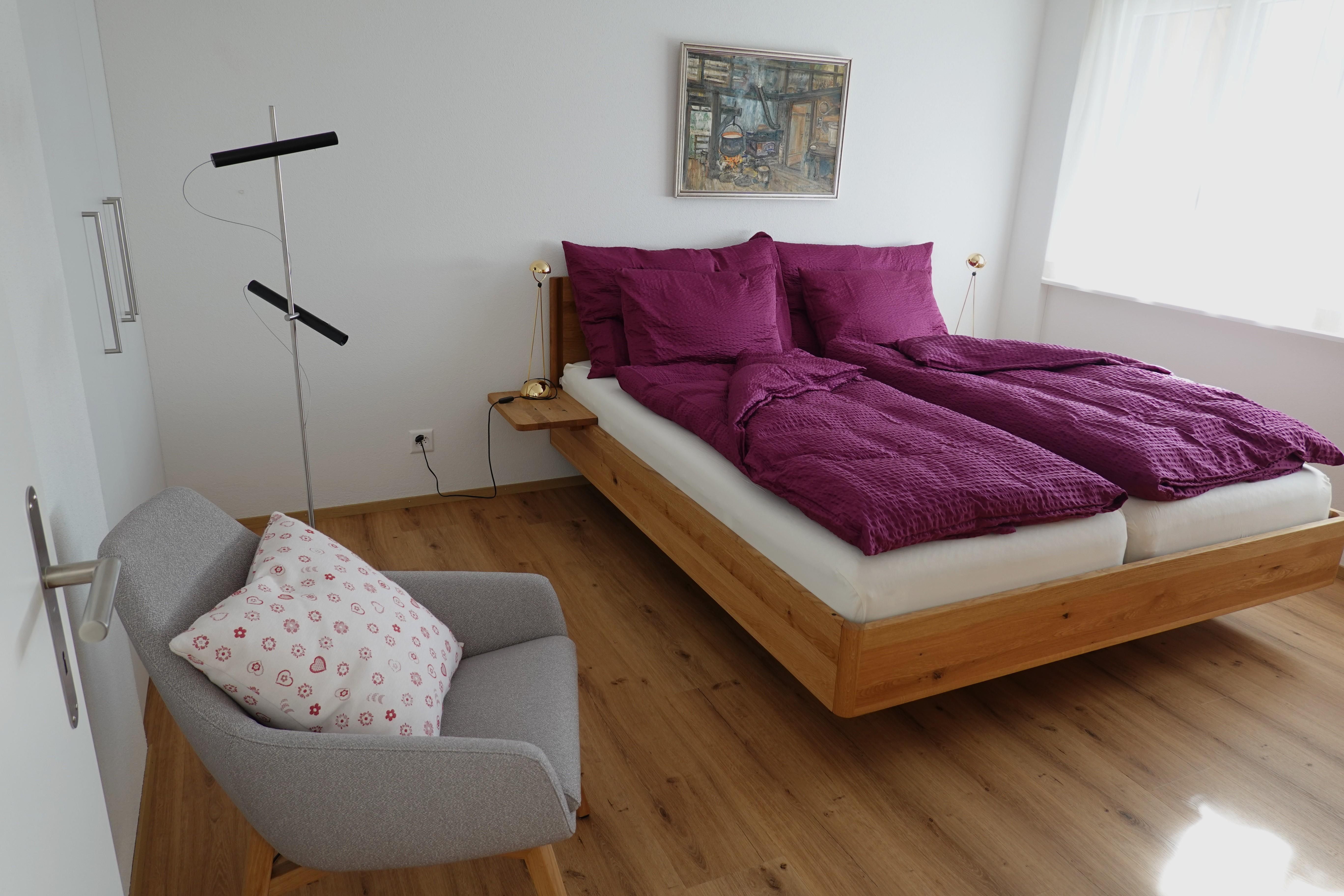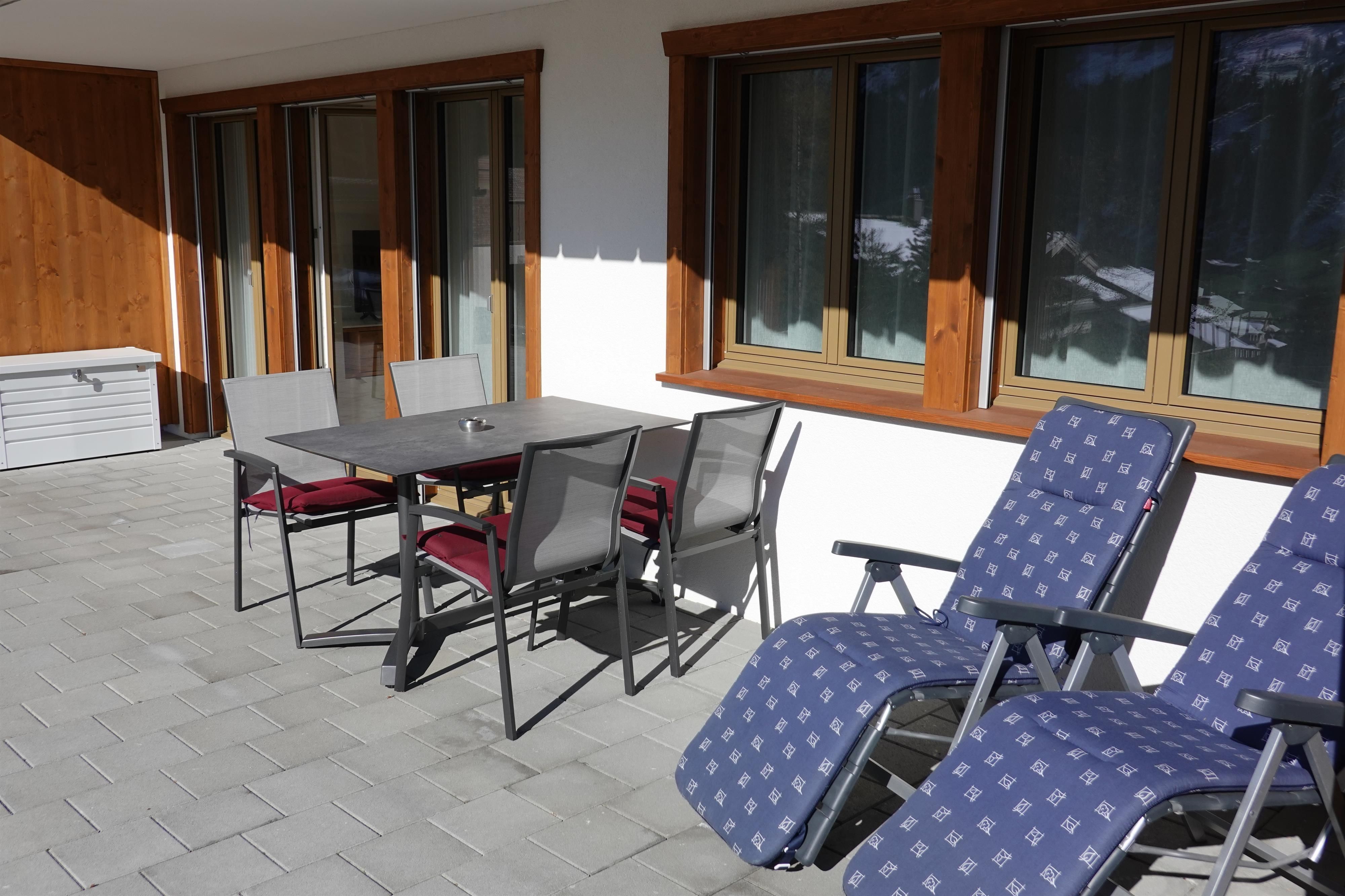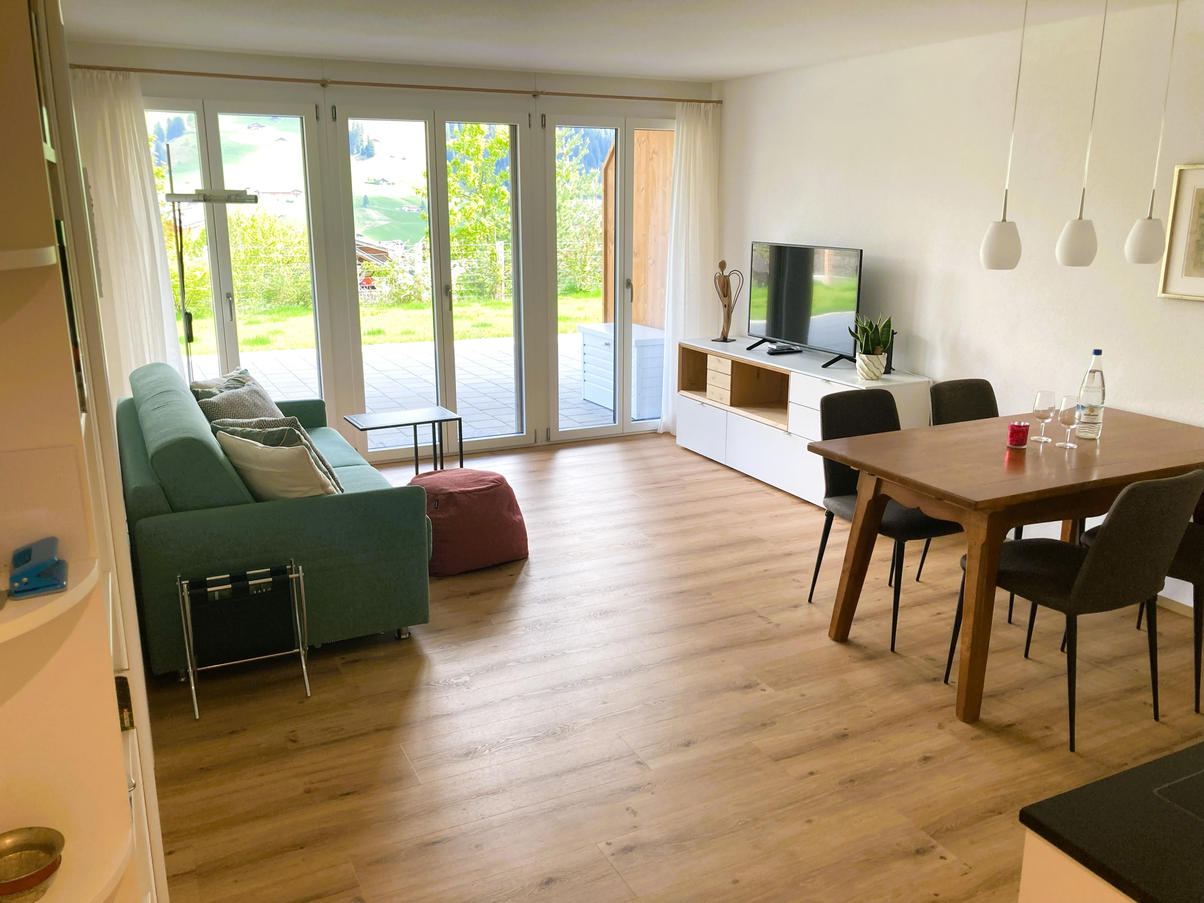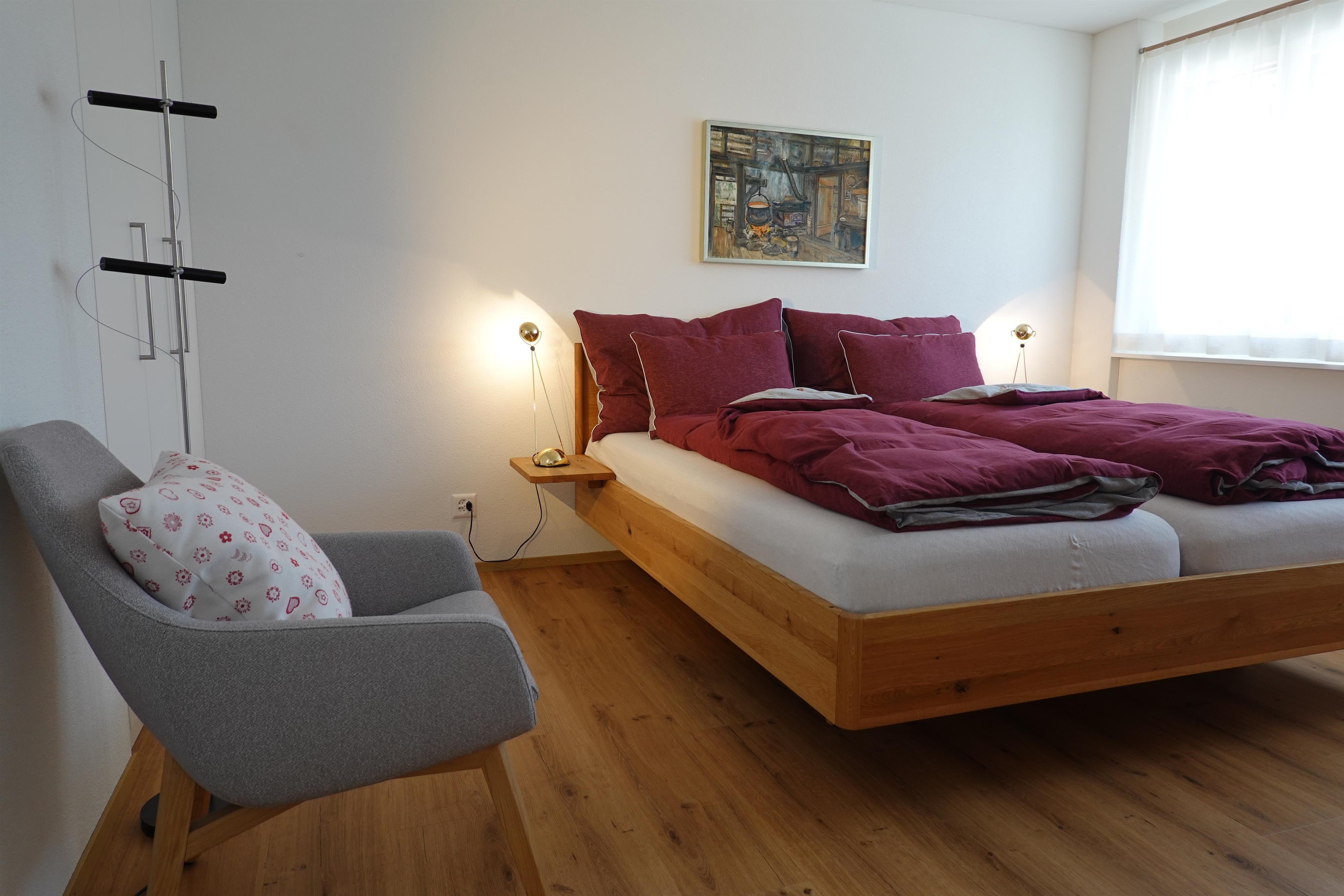Die moderne Wohnung verfügt über Entrée mit Garderobe, Schlafzimmer, Wohnraum mit offener Küche, Badezimmer mit Dusche/WC und Bodenheizung. Mit dem Lift gelangen Sie zum eigenen Keller mit Waschmaschine/Tumbler und in die Garage zu Ihrem Auto-Einstellplatz. Ladestationen für E-Autos beim nahen LWA. Die Wohnung ist komfortabel, praktisch und zweckmässig eingerichtet und bietet 2 Personen bequem Platz. Im Schlafzimmer befindet sich ein Doppelbett (180x200), ein Bauernschrank sowie ein Sessel mit einer Stehleuchte. Bei Bedarf kann für eine weitere Person das Sofa im Wohnzimmer mit wenigen Handgriffen in ein bequemes Sofa-Bett (140x200) umgewandelt werden (siehe «Gut zu wissen»). Die Küchenzeile ist ausgestattet mit Kühlschrank/Gefrierfach, Glaskeramikkochfeld, Backofen/Steamer und Abwaschmaschine (auf Wunsch Mikrowelle). Auf der Terrasse befindet sich ein Gartentisch mit Stühlen, zwei Liegestühle, eine Gartenbox mit Kissen und ein Sonnenschirm.