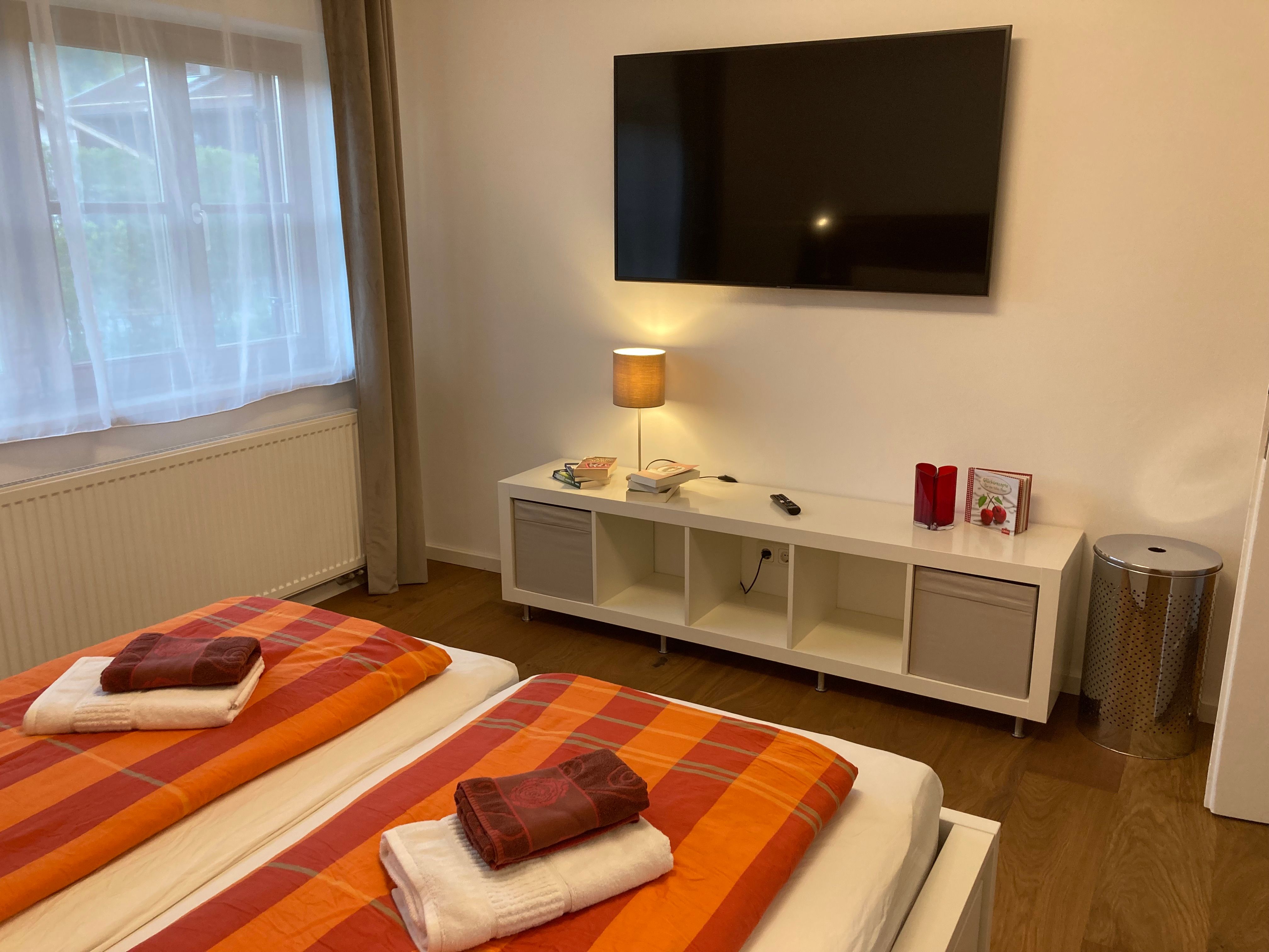 Die Wohnung liegt im EG und hat direkten Zugang zur Ostterrasse (25 m²) mit Blick auf das Naturdenkmal Biber (einer Nagelfluhgesteinsanhöhe mit Wallfahrtskirche). Die gemütliche 51 m² Wohnung besteht aus: Essküche mit maßgeschreinerter Eckbank, Einbauküche mit Geschirrspüler, Schlafzimmer mit Doppelbett 1,80x2,00m Liegefläche und neuem Flachbildfernseher Wohnzimmer mit hochwertiger Klappschlafcouch (Liegefläche 1,80m x 2,00m), Gaskachelofen und neuem Flachbildfernseher, kleines Bad mit Dusch-Badewanne, Fön und ausreichend Stauraum, Flur mit Garderobe. Besonderes Highlight ist der neue rustikal strukturierte Eichenholzparkett, der in den Wohnräumen und Essküche verlegt wurde.