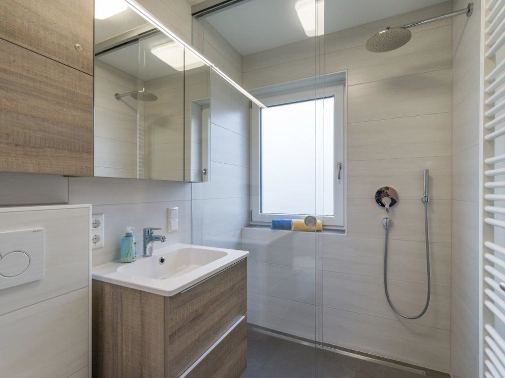 Das Highlight der Ferienwohnung ist zweifellos das moderne Badezimmer mit ebenerdiger Dusche.