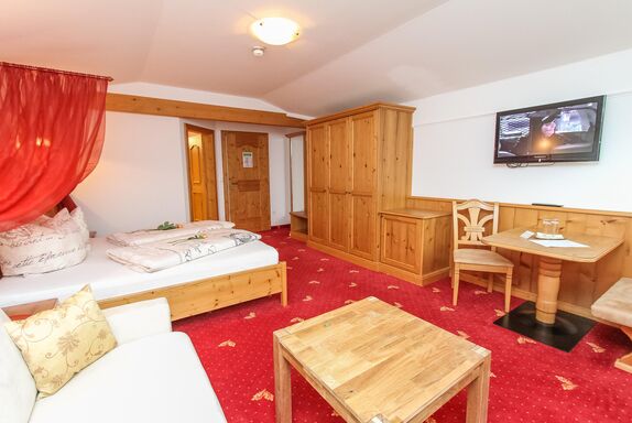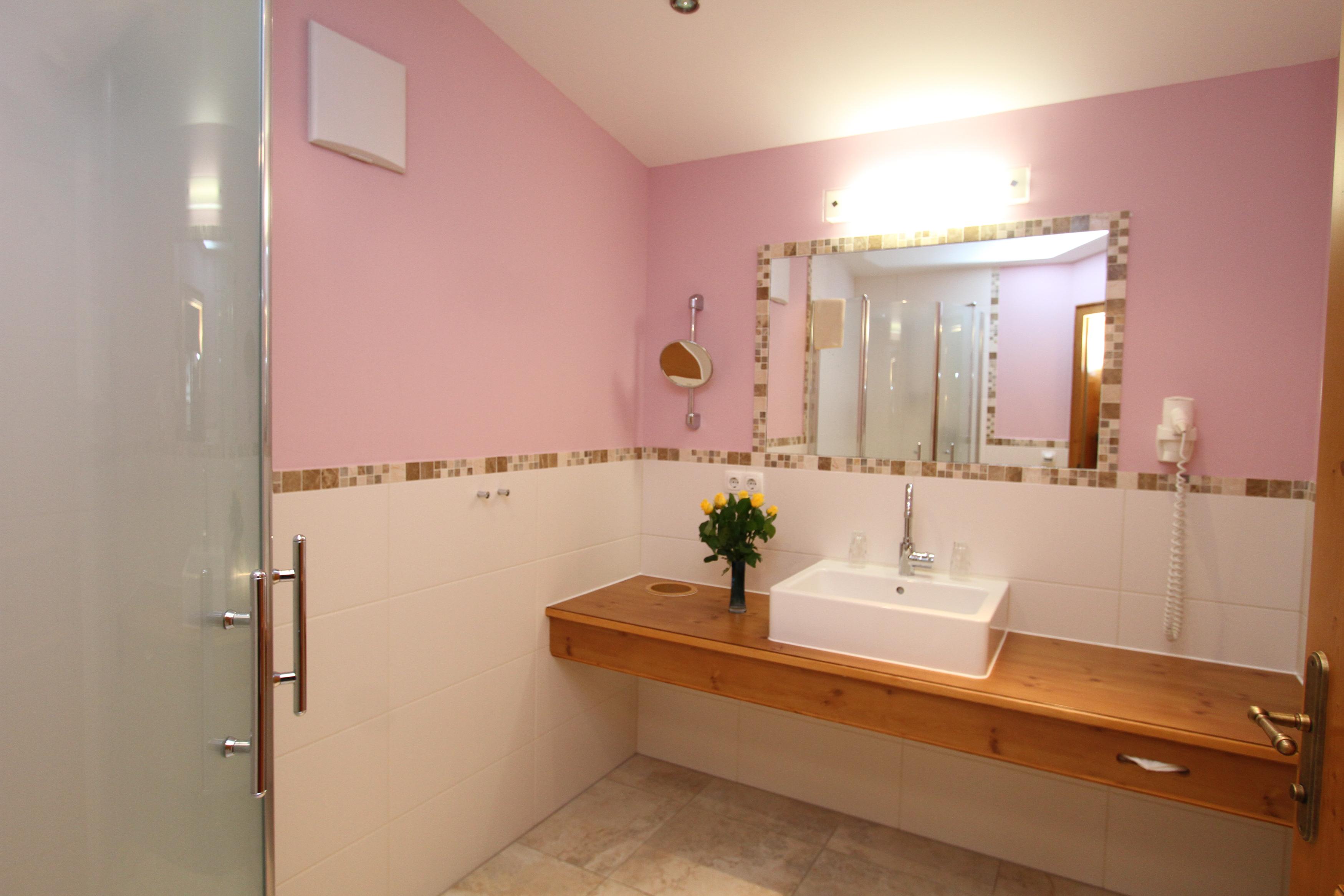 Wer ländliche Romantik liebt und das zusammen mit viel Komfort genießen möchte, ist in unserem 43 m² großen Romantikzimmer genau richtig. Ein großzügiger Vorraum, mit Dusche und separatem WC. Auch als Familienzimmer nutzbar.