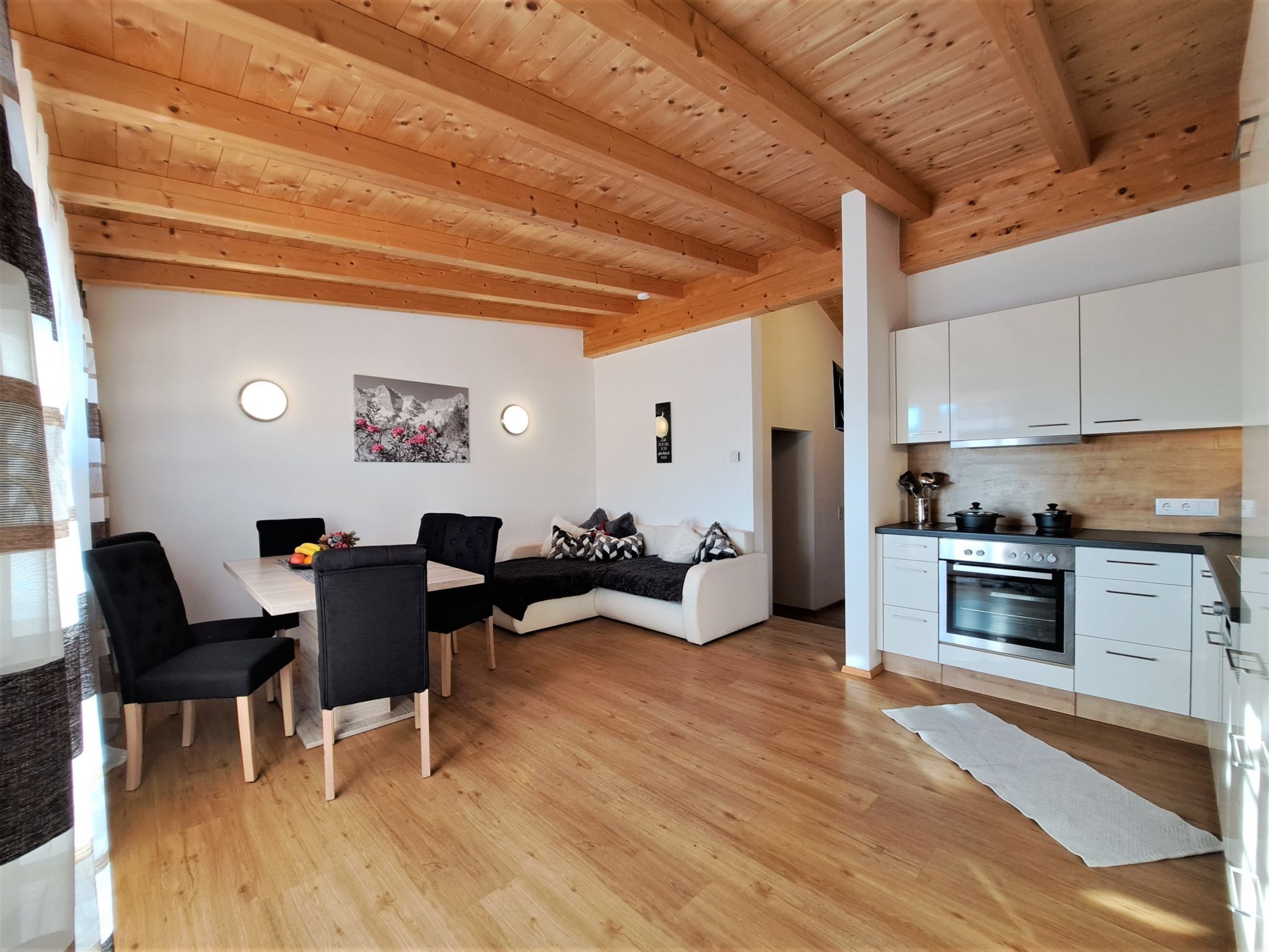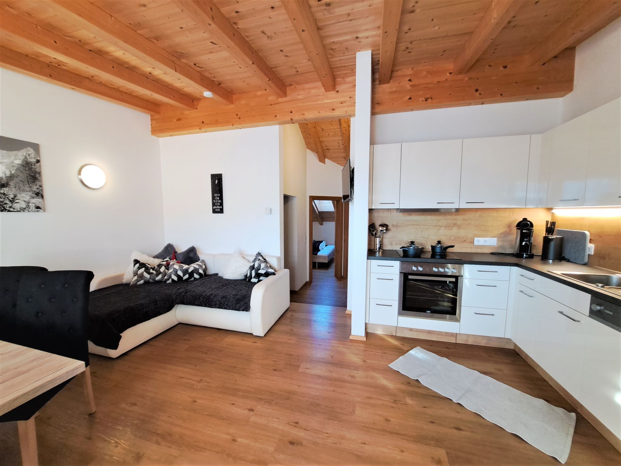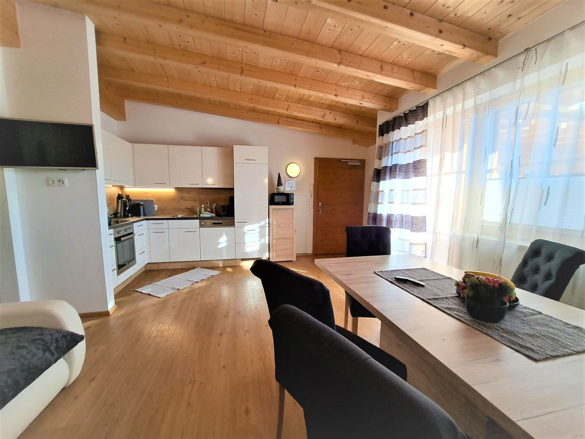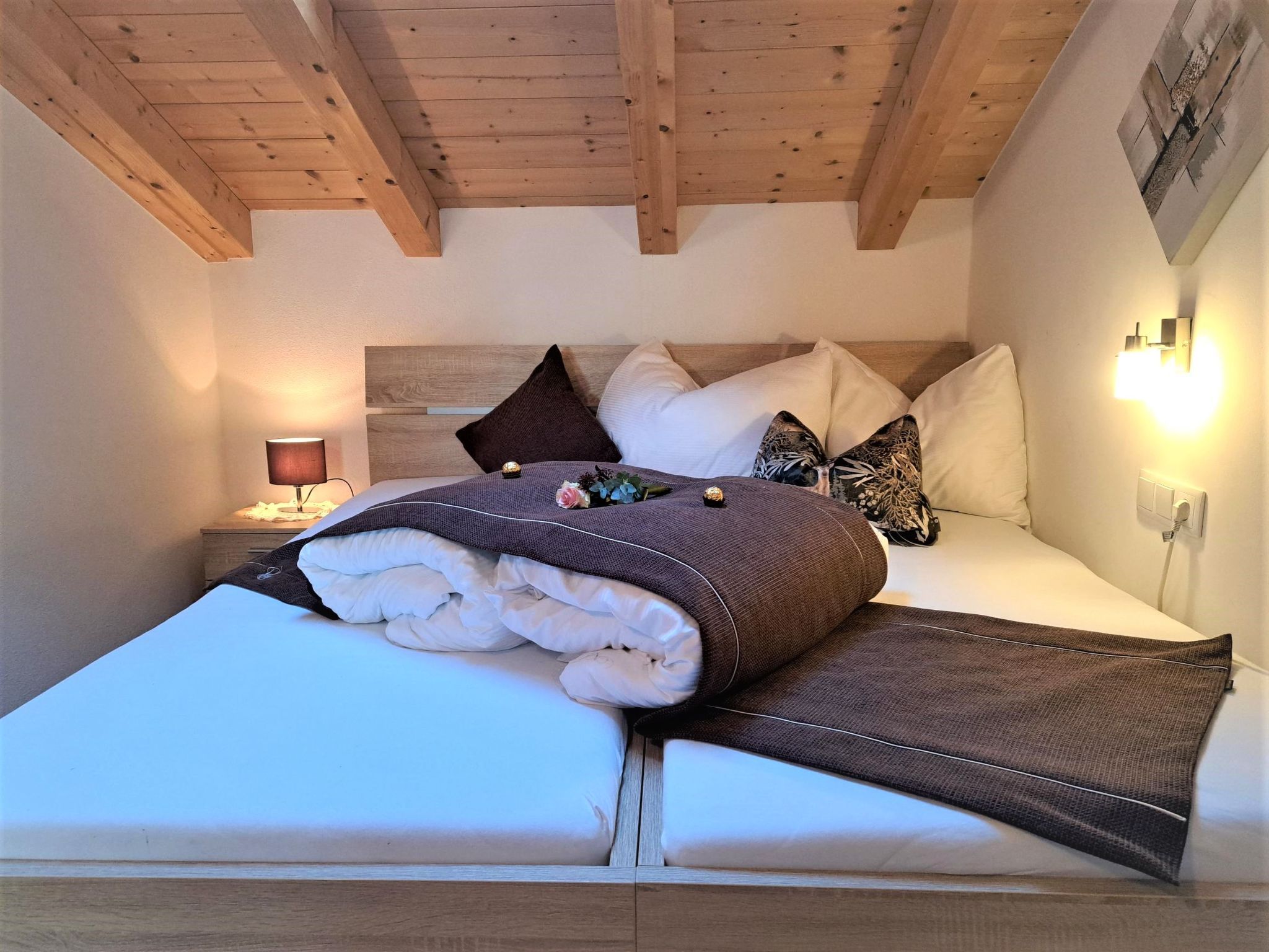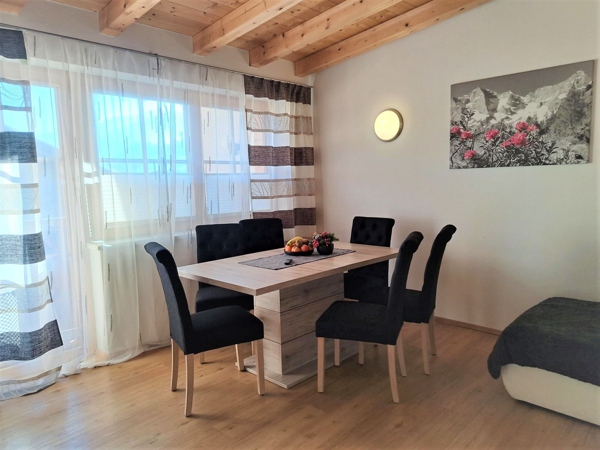 Margret, Top 12, 3-Zimmer-Wohnung 65 m2 im 2. Stock. Teilweise abgeschrägt, schön und geschmackvoll eingerichtet: 1 Doppelzimmer. 1 Zimmer mit 1 Diwanbett und 1 Doppelbett. Wohnküche (Backofen, Geschirrspüler, 4 Glaskeramikplatten, Wasserkocher, Mikrowelle, elektrische Kaffeemaschine) mit Essecke und TV (Flachbildschirm). Bad/WC. Fussbodenheizung. Balkon. Balkonmöbel. Herrliche Panoramasicht auf die Berge. Zur Verfügung: Internet (Wireless LAN, gratis).