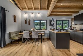 Der offene Wohn-Ess-Bereich ist das Herzstück des Chalets. Das Wohnzimmer ist hell mit einem schönen Kamin und einer großen Couch sowie Smart-TV ausgestattet. Im Essbereich befindet sich eine gemütliche und große Eckbank mit einem schönen Holztisch. Hier ist genug Platz für Gespräche, Spiele, und auch mal die Arbeit am PC kann hier in Ruhe erledigt werden.